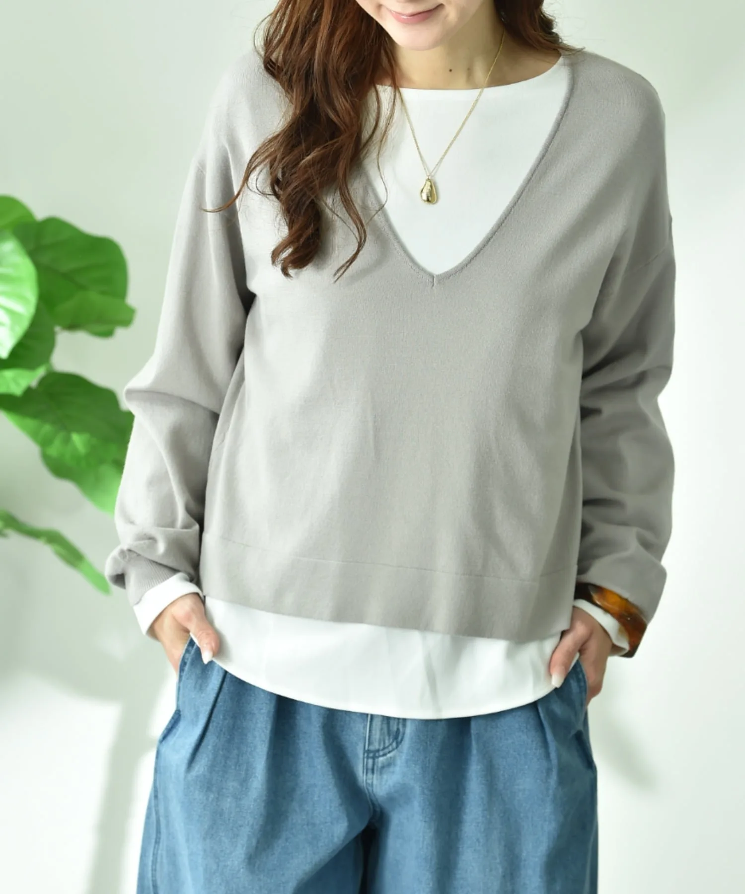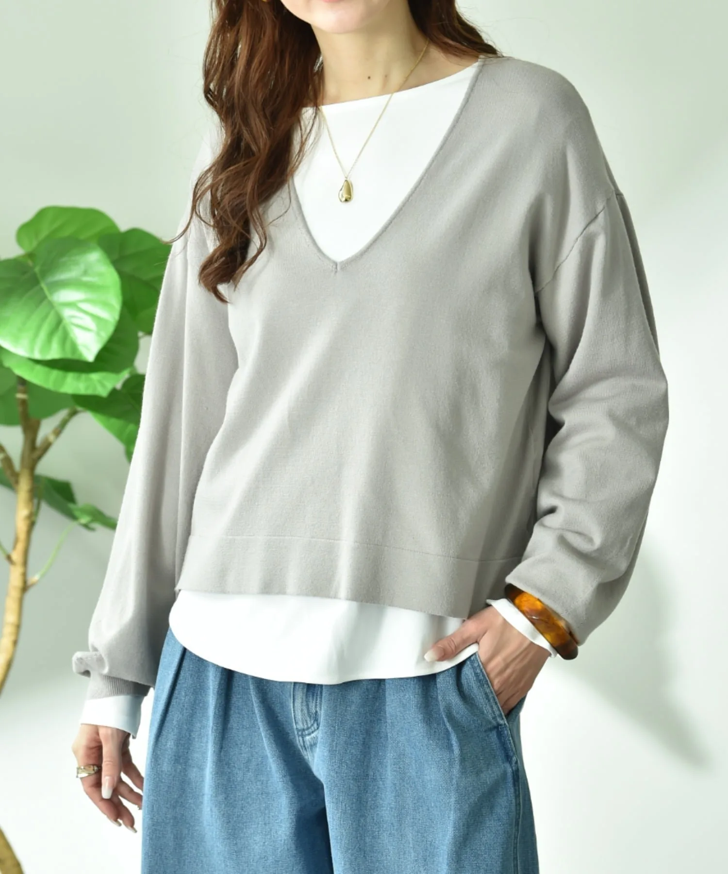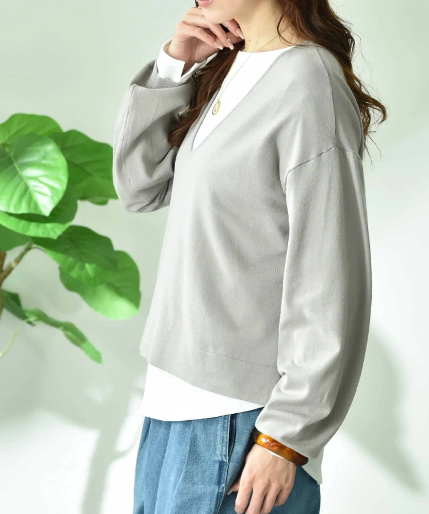 Комплект, состоящий из трикотажного изделия с V-образным вырезом, создающего аккуратный образ вокруг лица, и простой внутренней части с длинными рукавами.