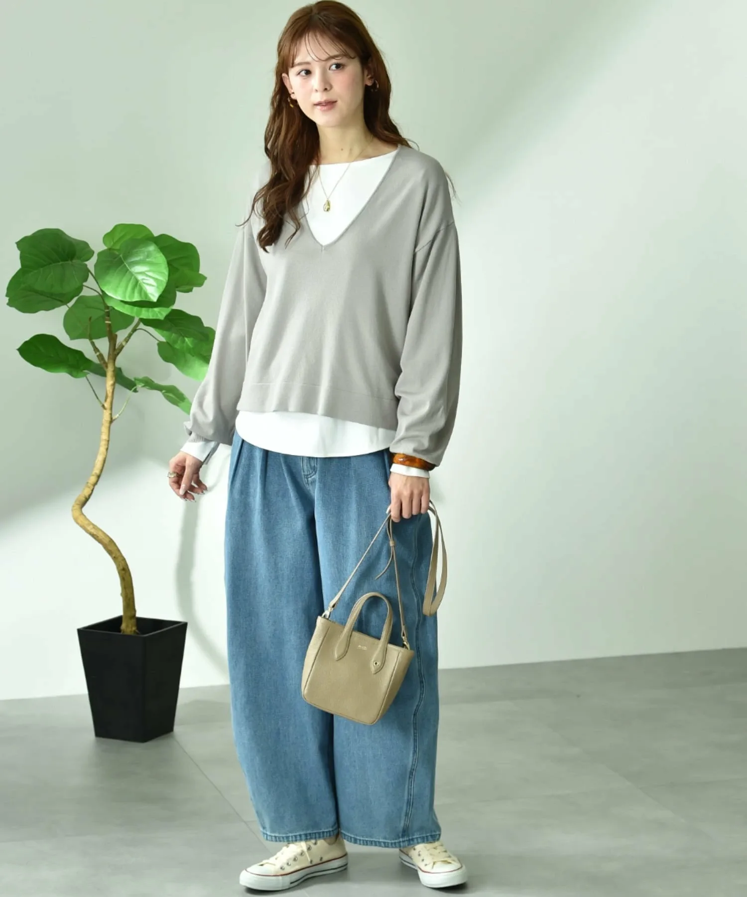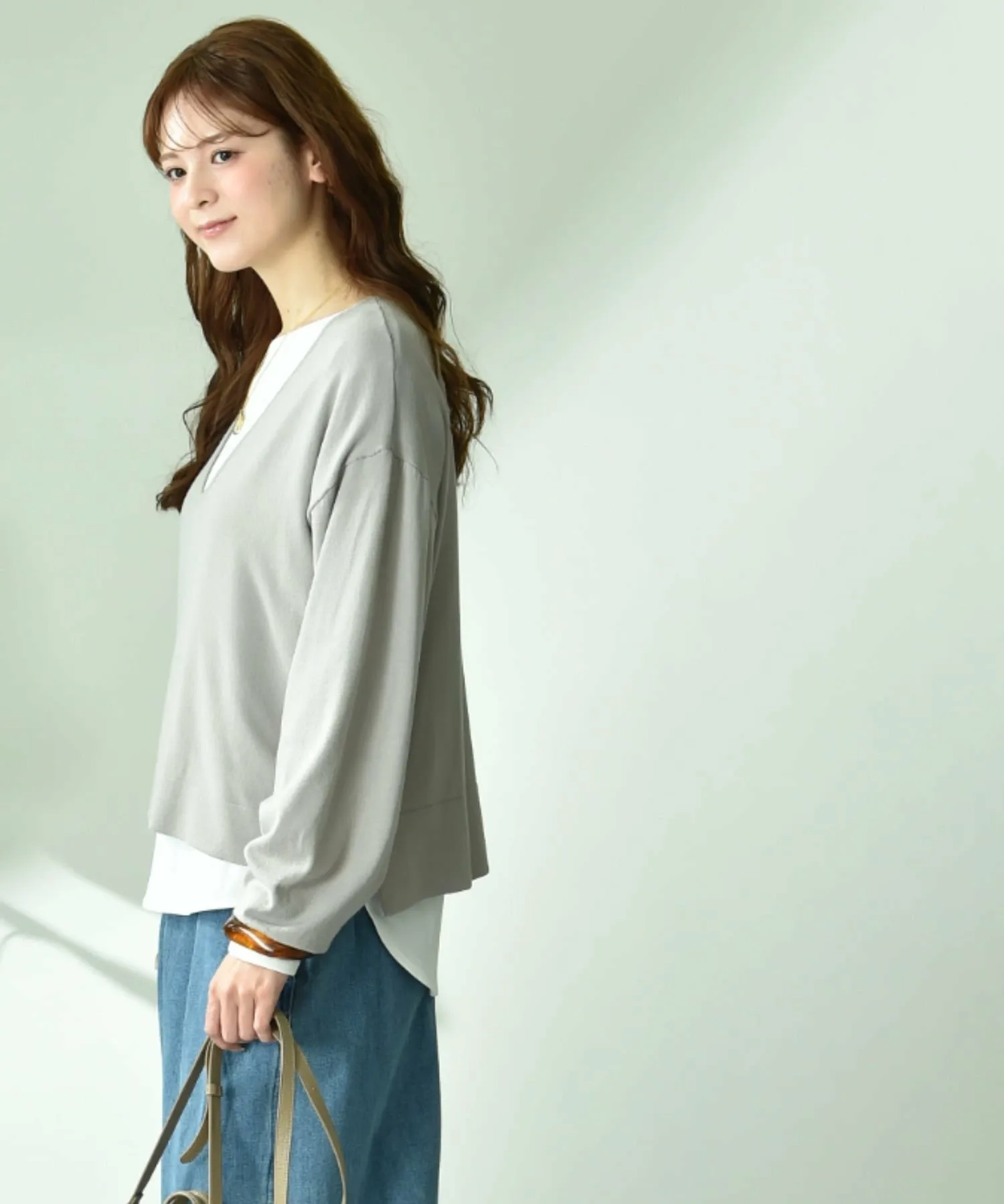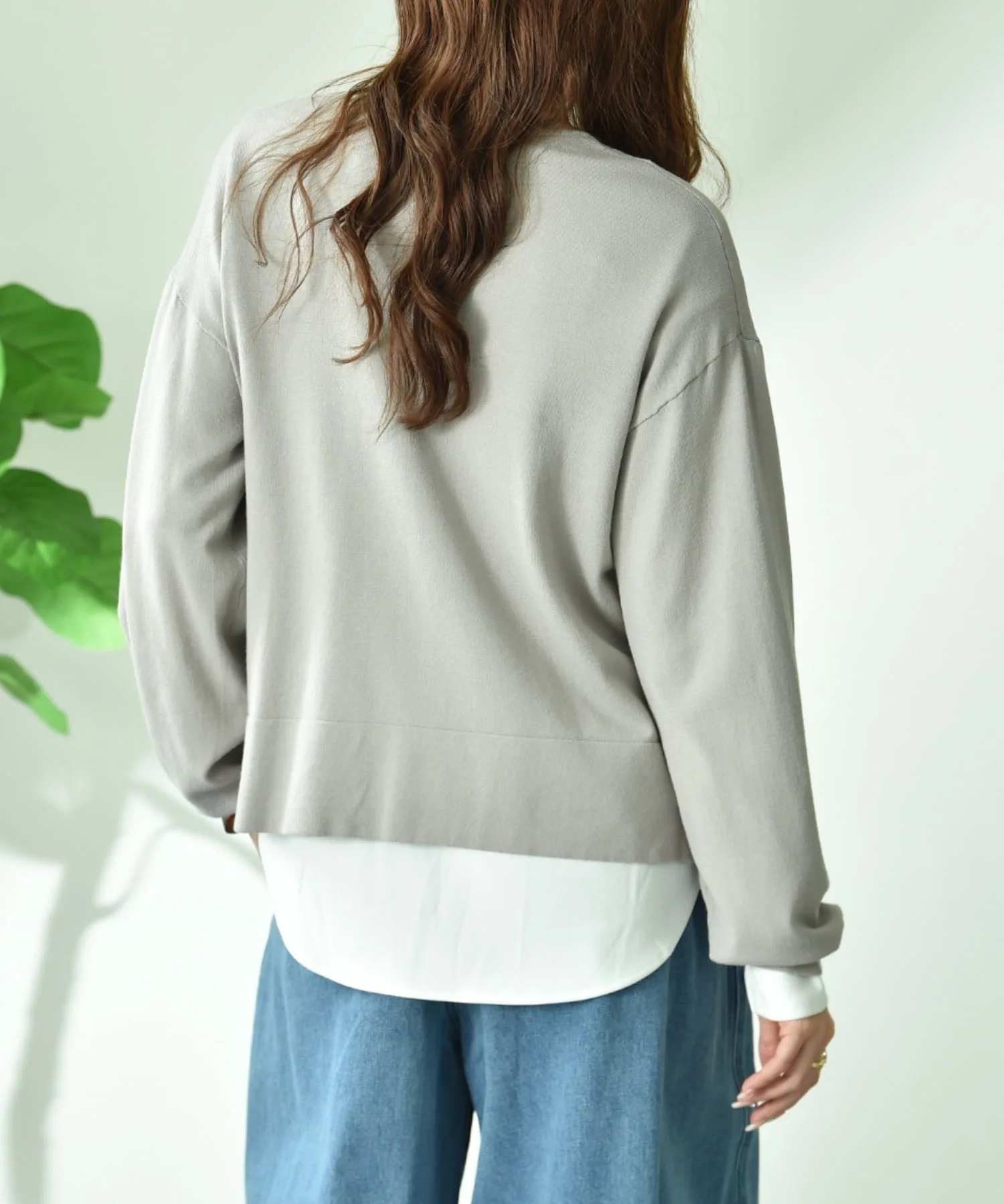 Комплект, состоящий из трикотажного изделия с V-образным вырезом, создающего аккуратный образ вокруг лица, и простой внутренней части с длинными рукавами.