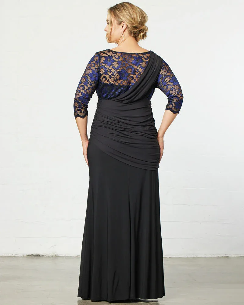 Наше вечернее платье Soiree - воплощение элегантности. Нежная сетка собирается поверх красивого V-образного выреза с фестончатым краем, создавая уникальную иллюзию одного плеча. Рукава длиной 3/4 добавляют комфорта и классического шарма этому вечернему наряду. Асимметричная заниженная талия и юбка-колокол создают привлекательный силуэт, подчеркивающий ваши изгибы. Это вечернее платье доступно исключительно в больших женских размерах.
