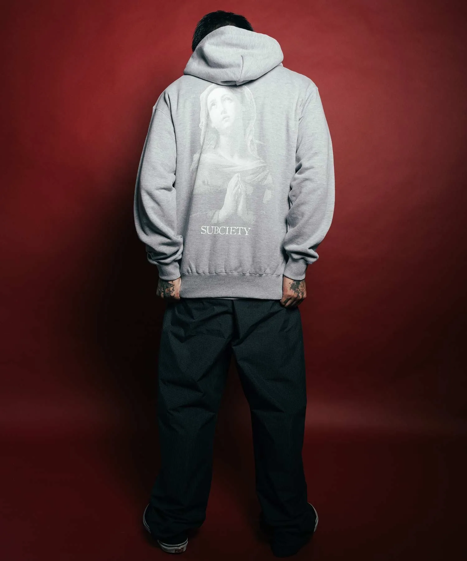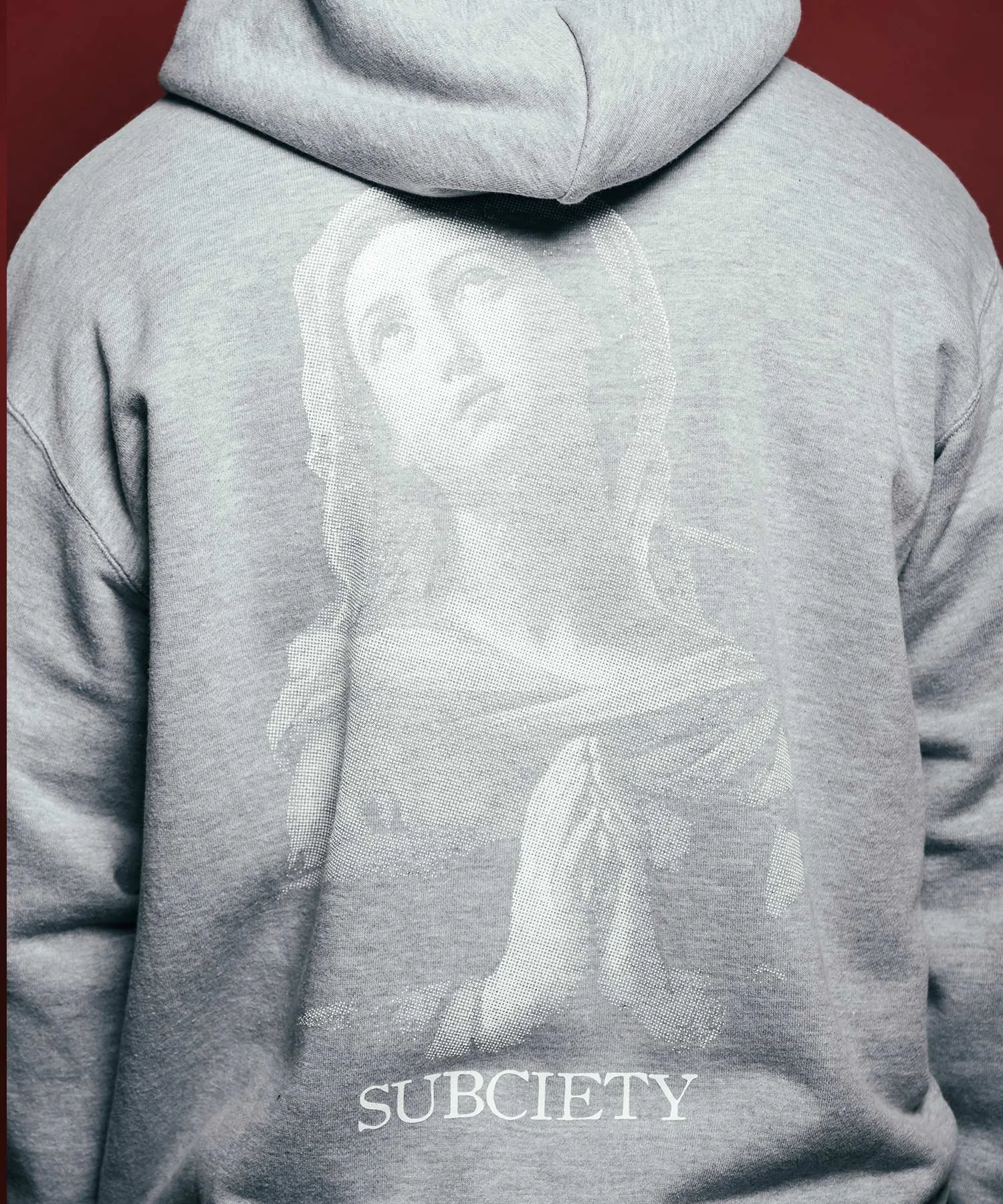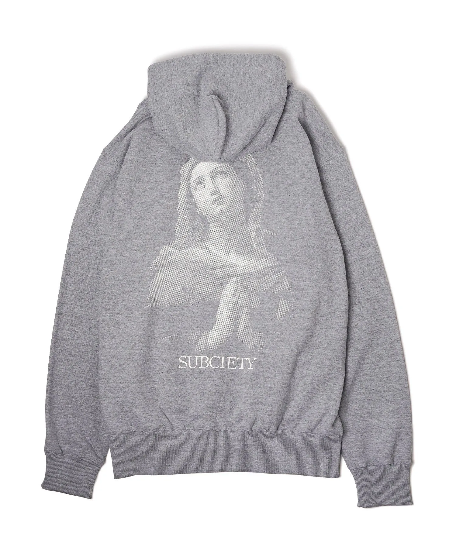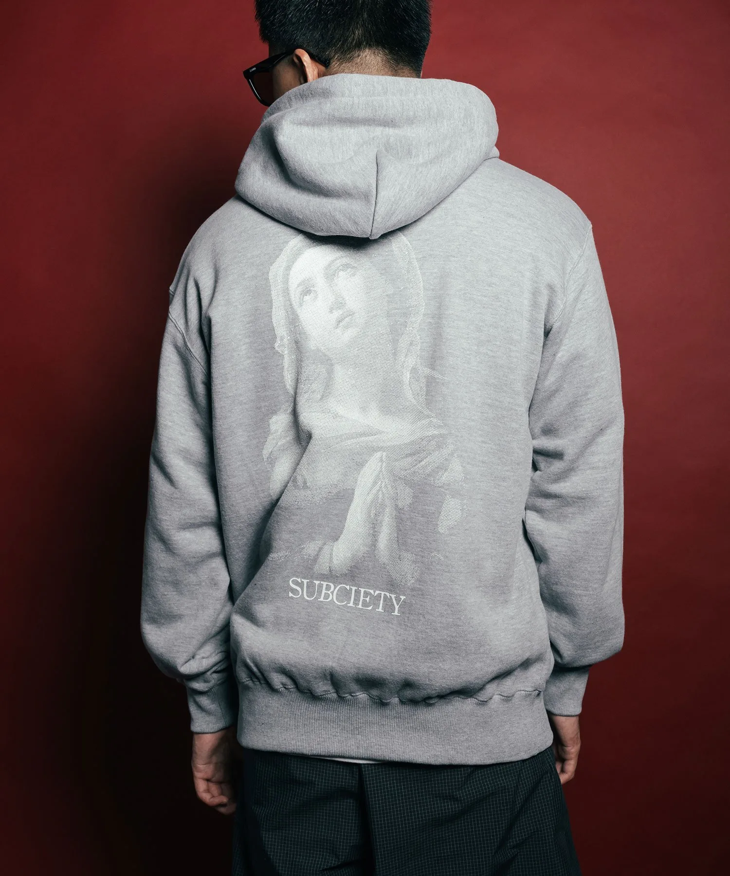 Логотип бренда напечатан на левой стороне груди, а изображение «Мадонна в молитве» Гвидо Рени напечатано на спине методом полутоновой шелкографии.
