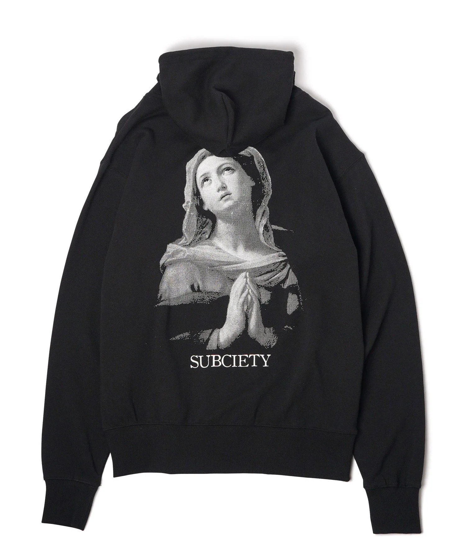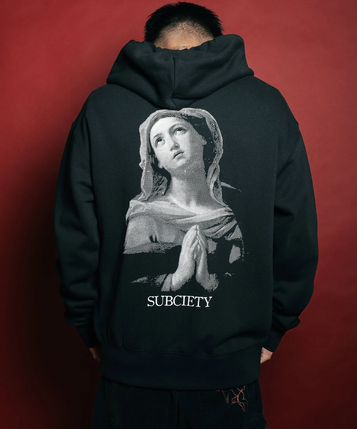 Логотип бренда напечатан на левой стороне груди, а изображение «Мадонна в молитве» Гвидо Рени напечатано на спине методом полутоновой шелкографии.