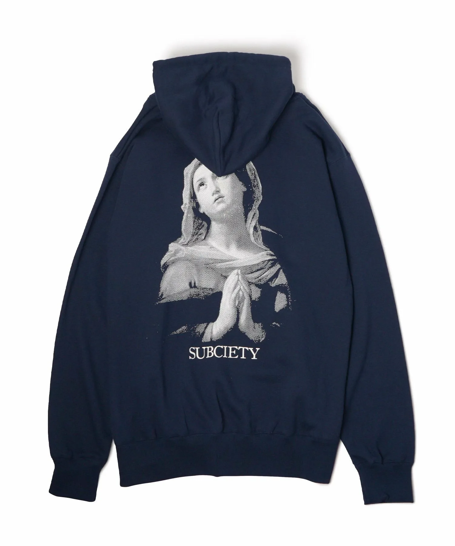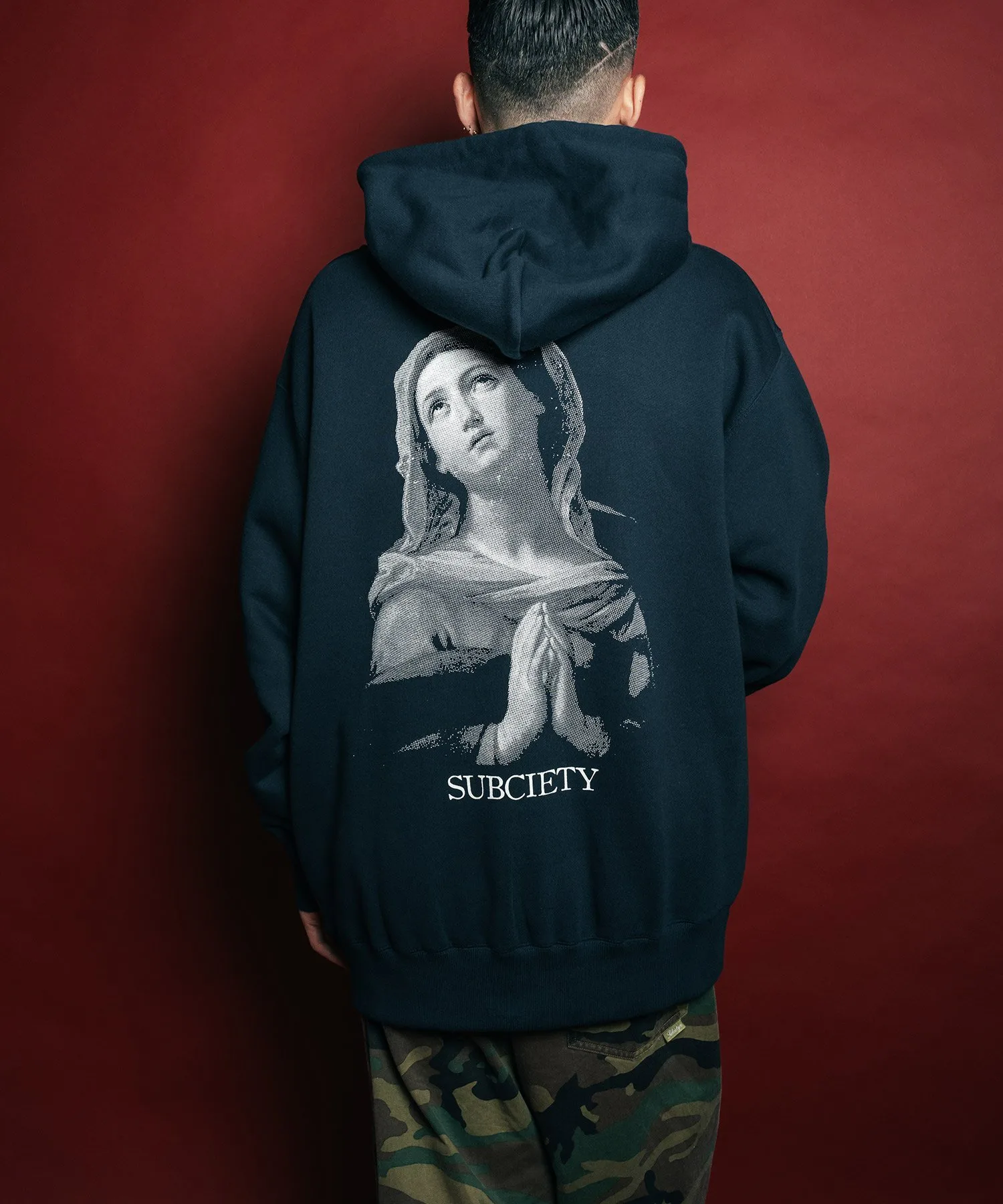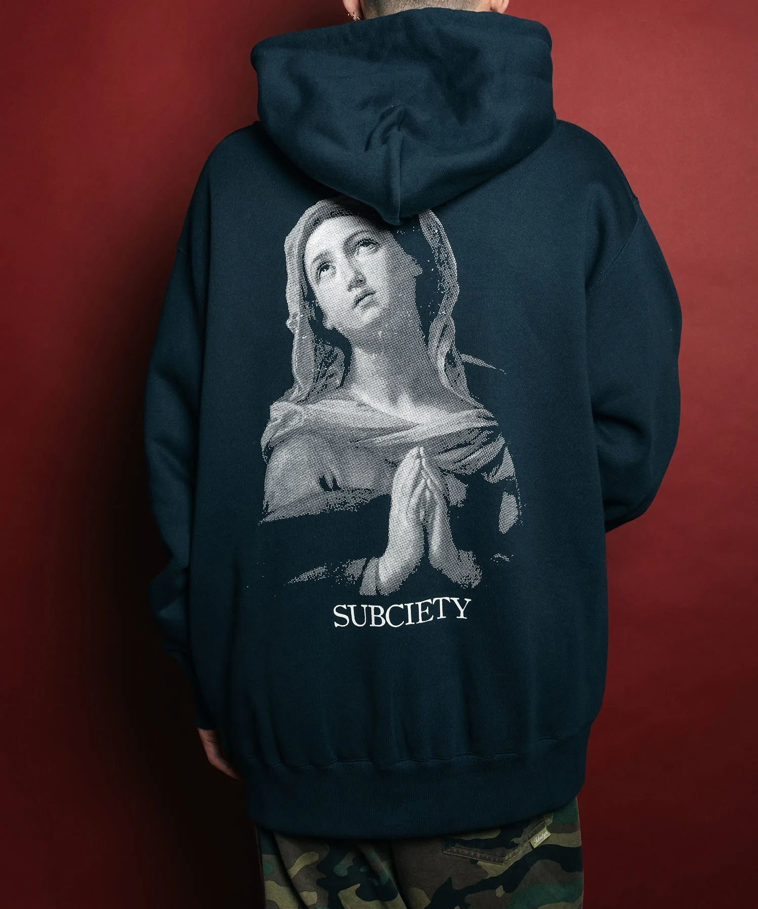Логотип бренда напечатан на левой стороне груди, а изображение «Мадонна в молитве» Гвидо Рени напечатано на спине методом полутоновой шелкографии.
