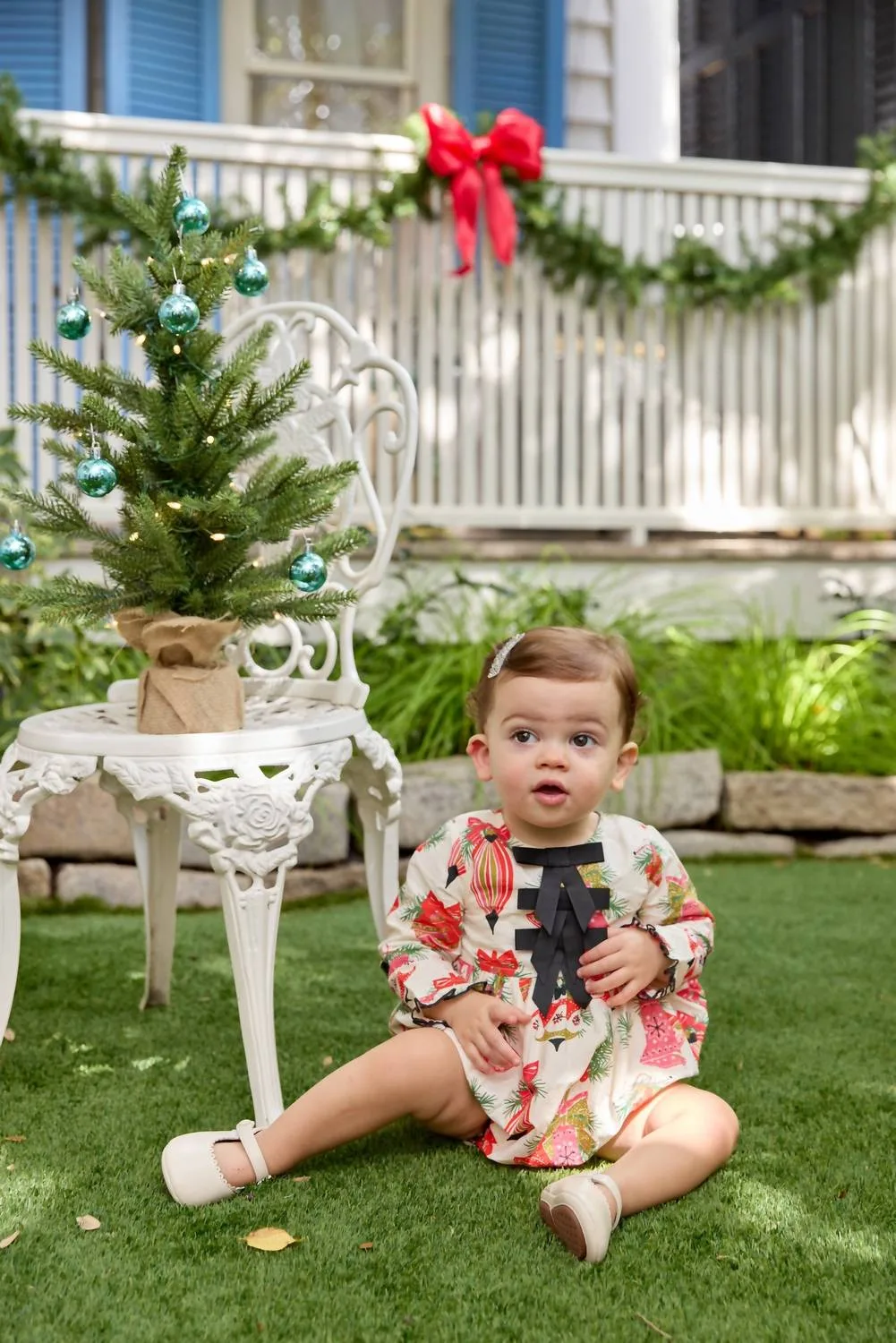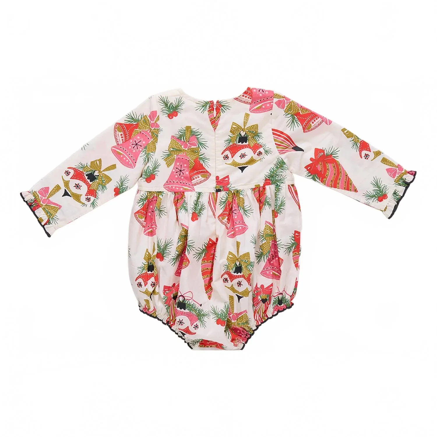 Оденьте свою малышку в праздничный наряд с помощью комбинезона «Гермиона Баббл» от Pink Chicken Girl с очаровательным узором «Колокольчики Холли». Этот очаровательный комбинезон украшен изысканными бантиками из черной грогреновой ленты на груди и оборками из черной жемчужной тесьмы на присборенных манжетах, что придает ему элегантность. Благодаря потайной застежке-молнии сзади и удобным кнопкам на ножках, смена подгузников становится легкой и приятной. Идеально подходит для праздничных мероприятий, этот комбинезон с узором станет прекрасным выбором для рождественских торжеств.