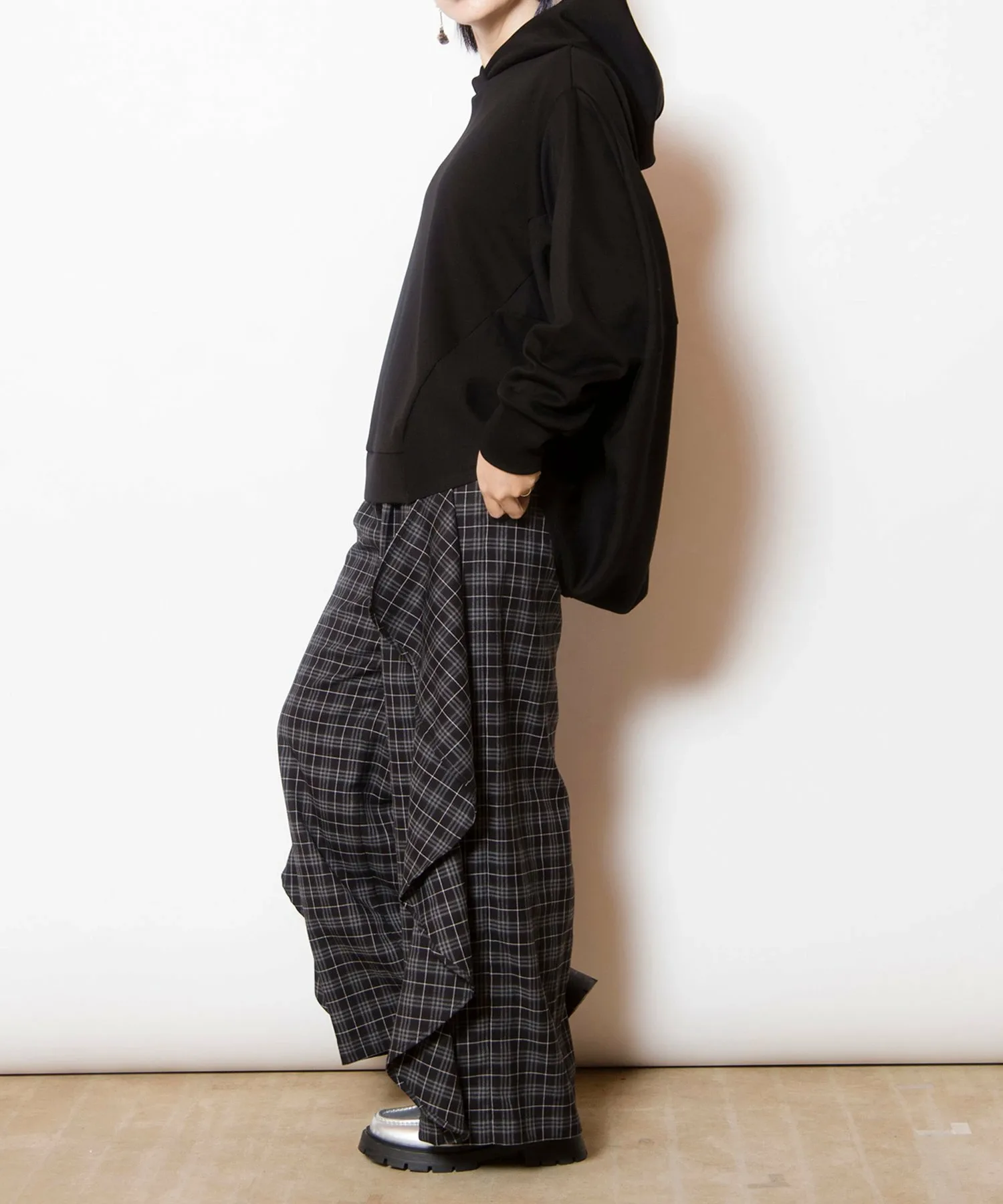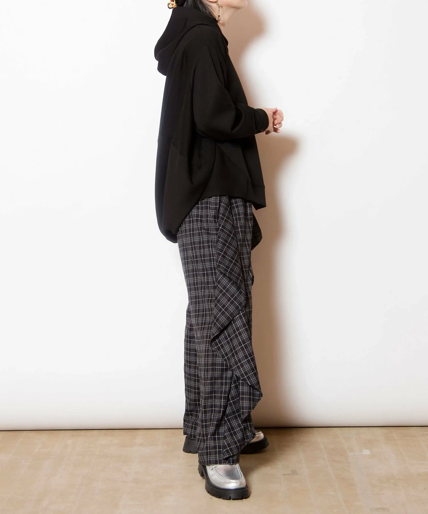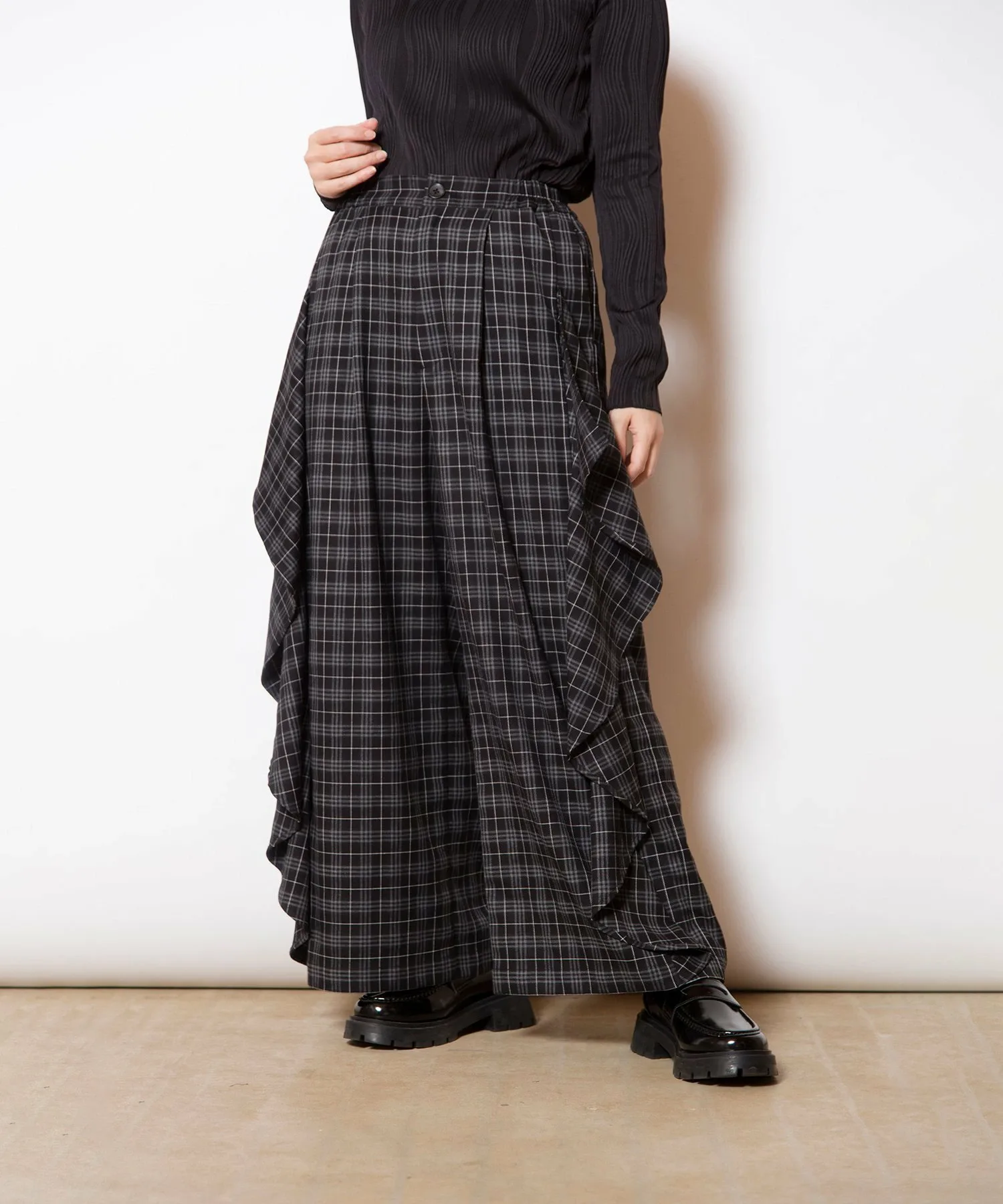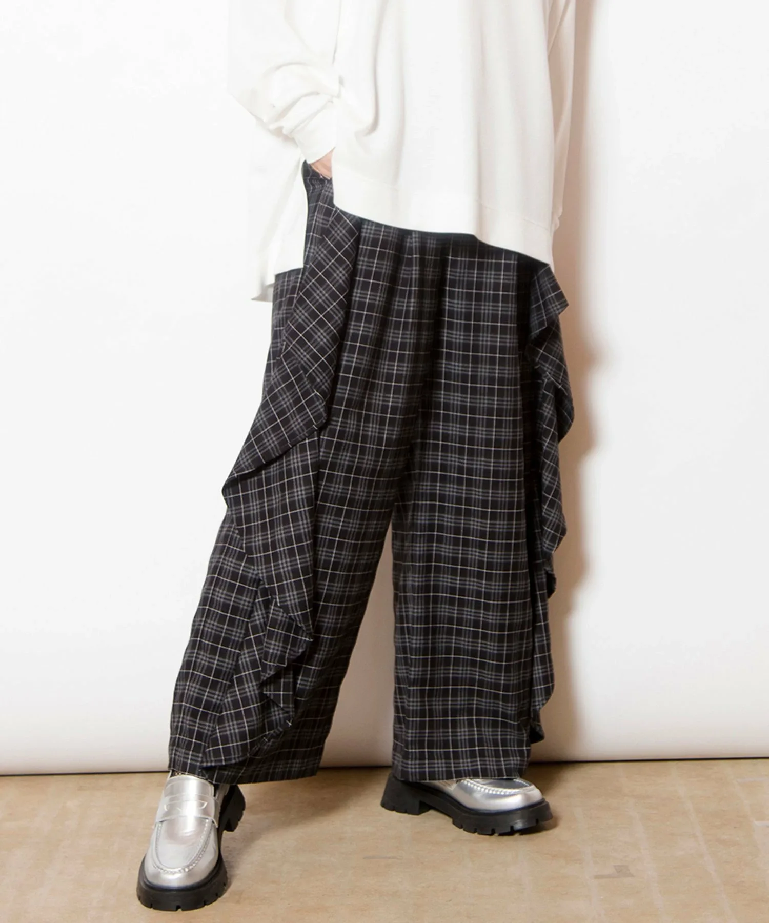 Культовые клетчатые брюки приобретают модный вид благодаря каскадному крою.
