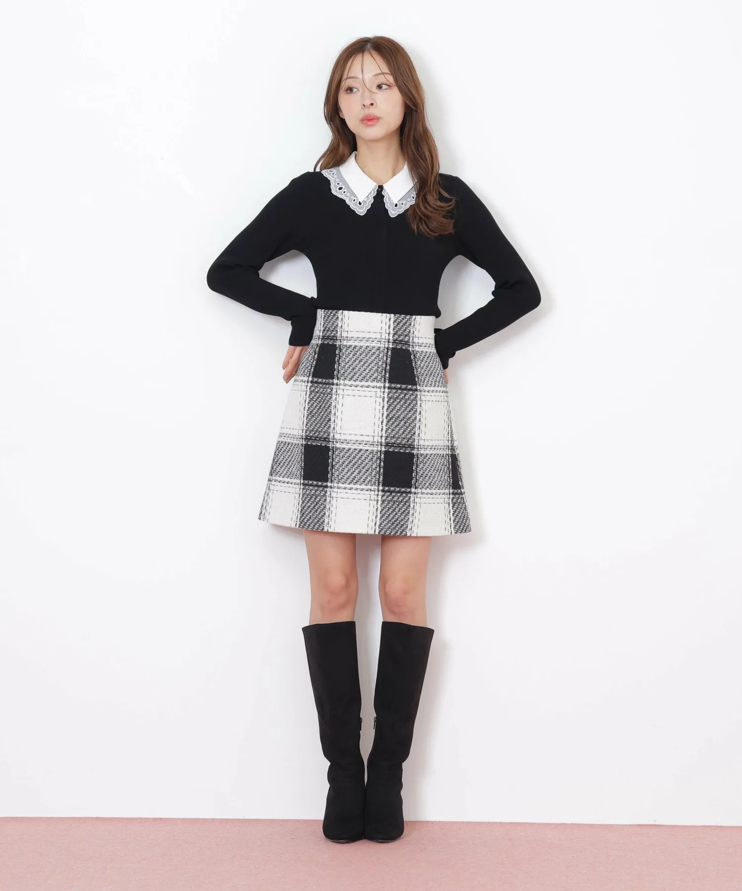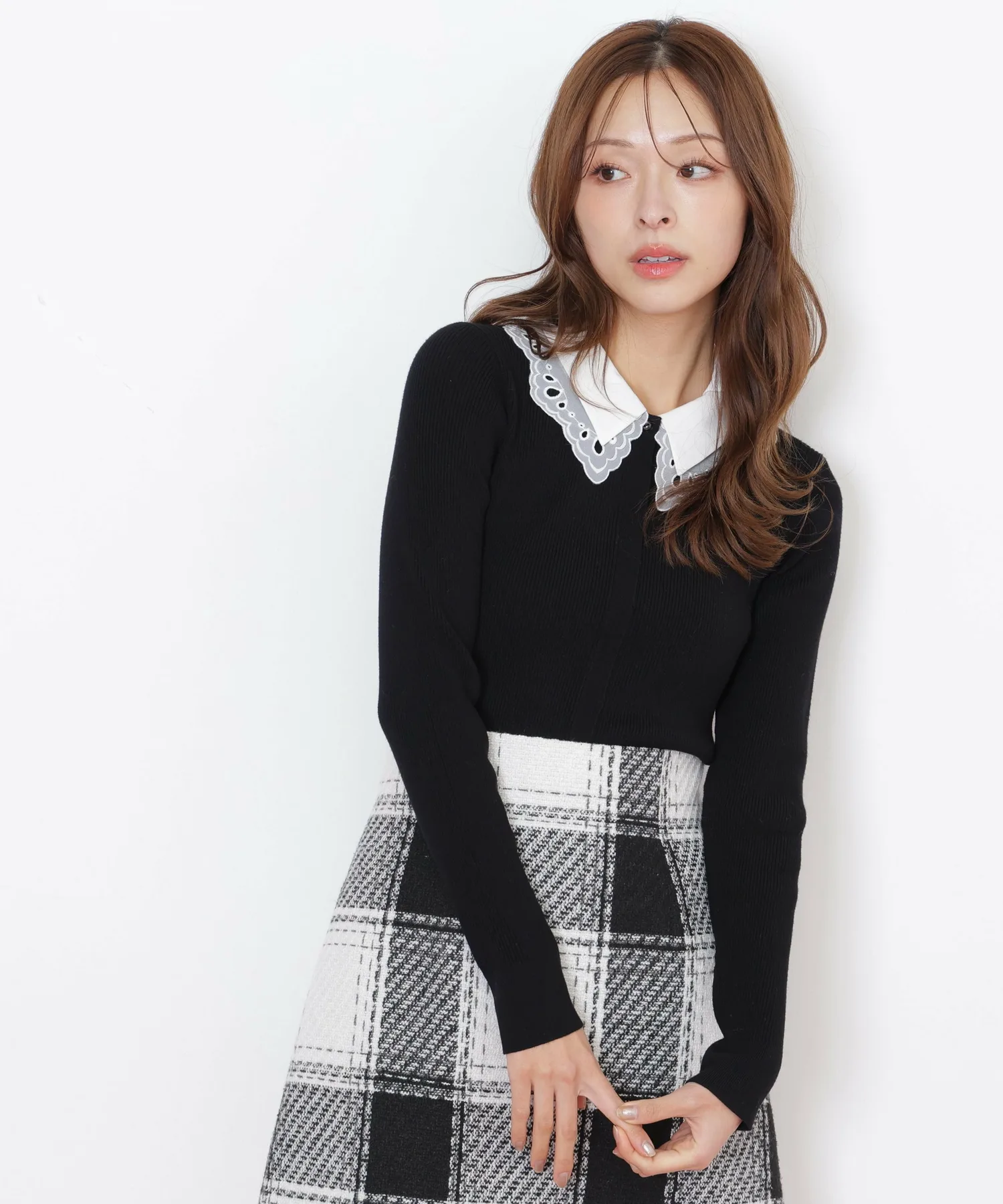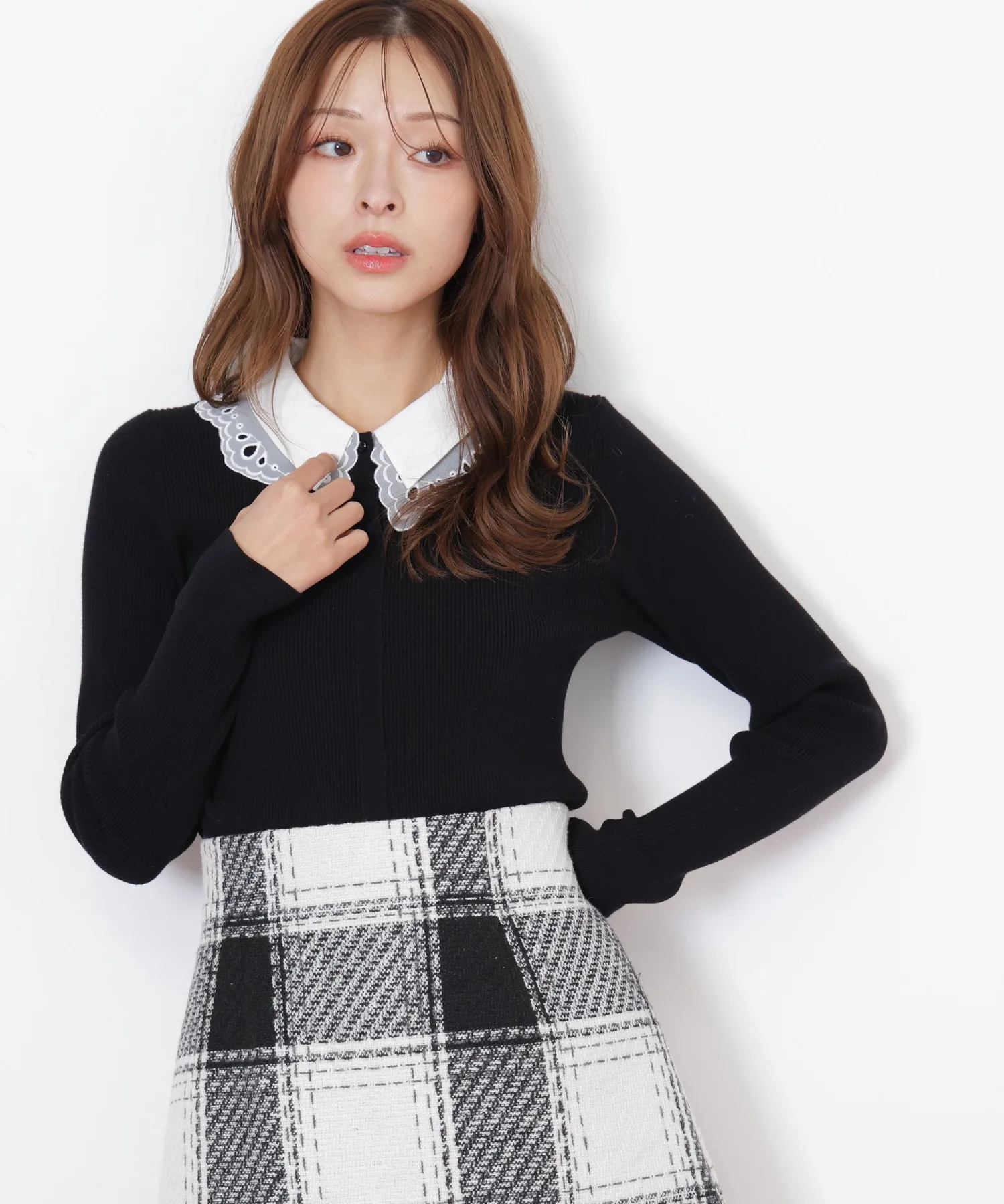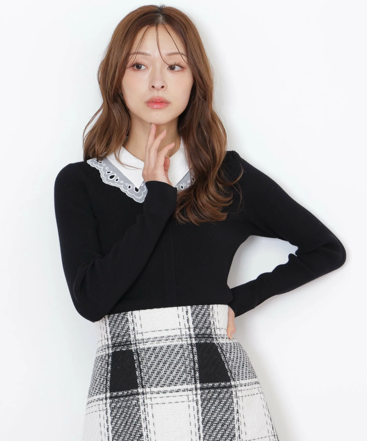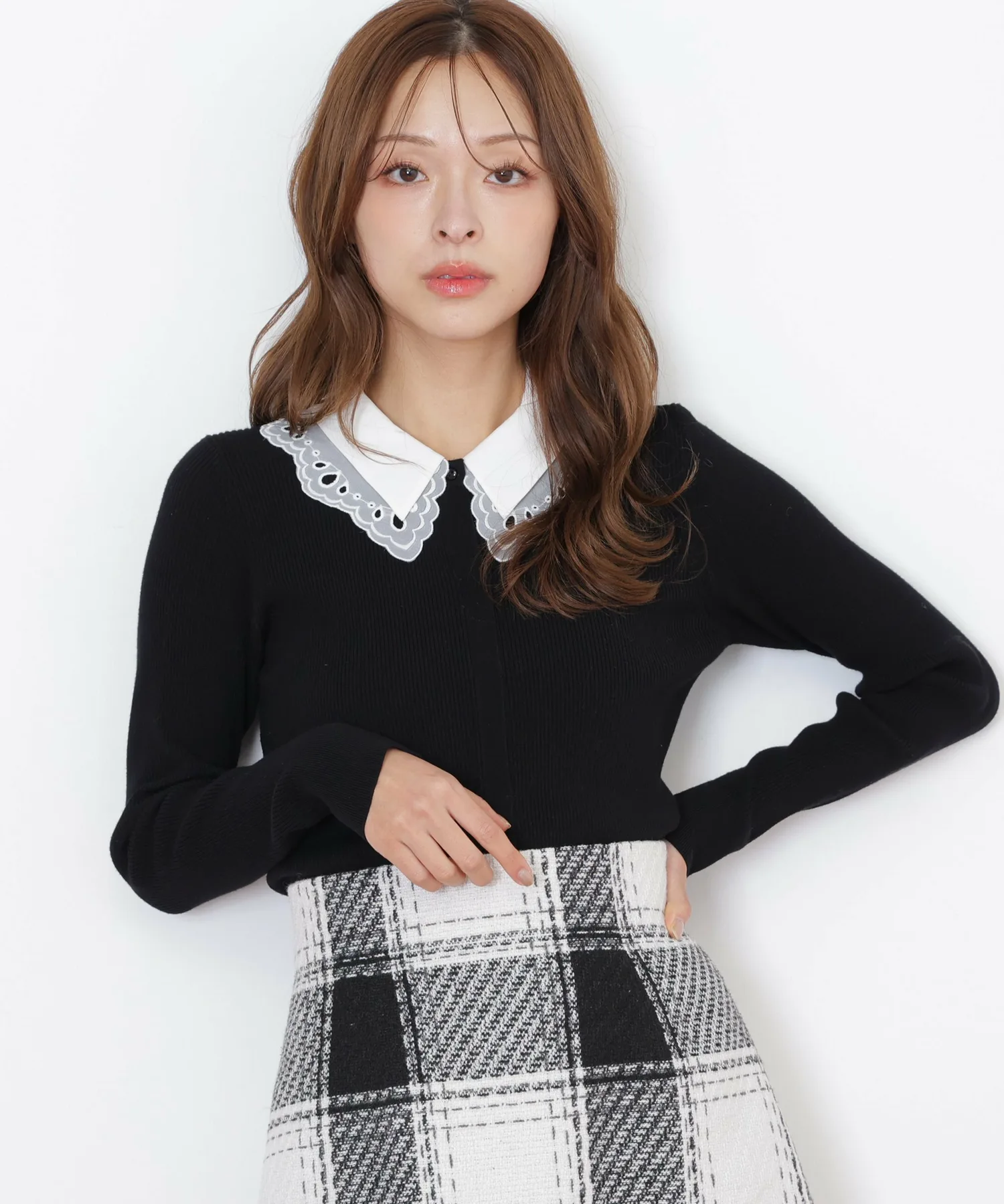 Модный трикотаж с многослойным воротником. Под кружевным воротником находится слой прозрачной органзы, а оригинальная вышивка добавляет нотку гламура. Воротник отстегивается. Декоративные пуговицы, открывающие переднюю часть, также являются изюминкой. Теплый, но при этом ребристый трикотаж позволяет легко заправить его в брюки или юбку, что делает его универсальным изделием, хорошо сочетающимся с любыми брюками или юбками. *Цвета могут выглядеть по-разному в зависимости от условий освещения во время фотосъемки.