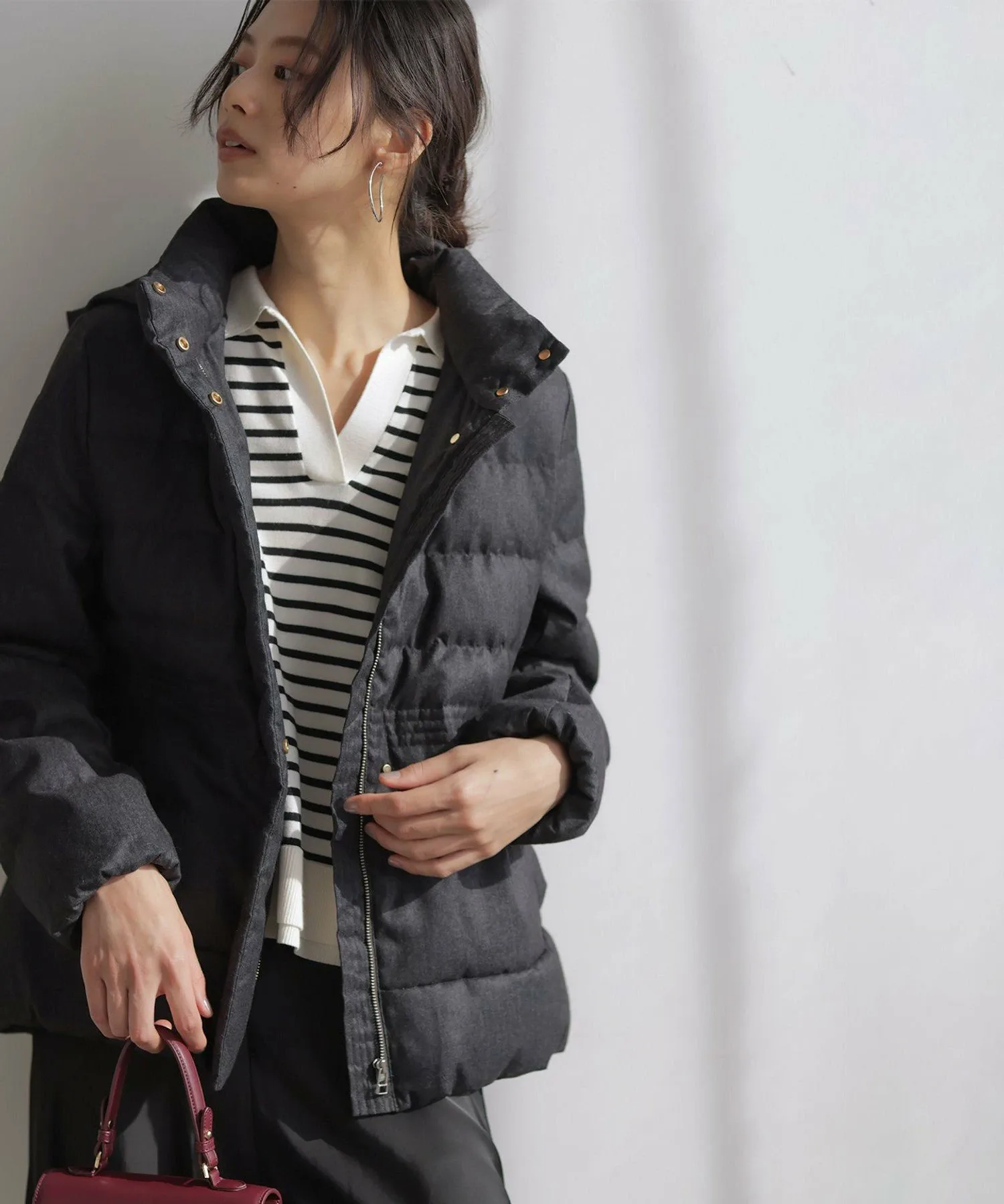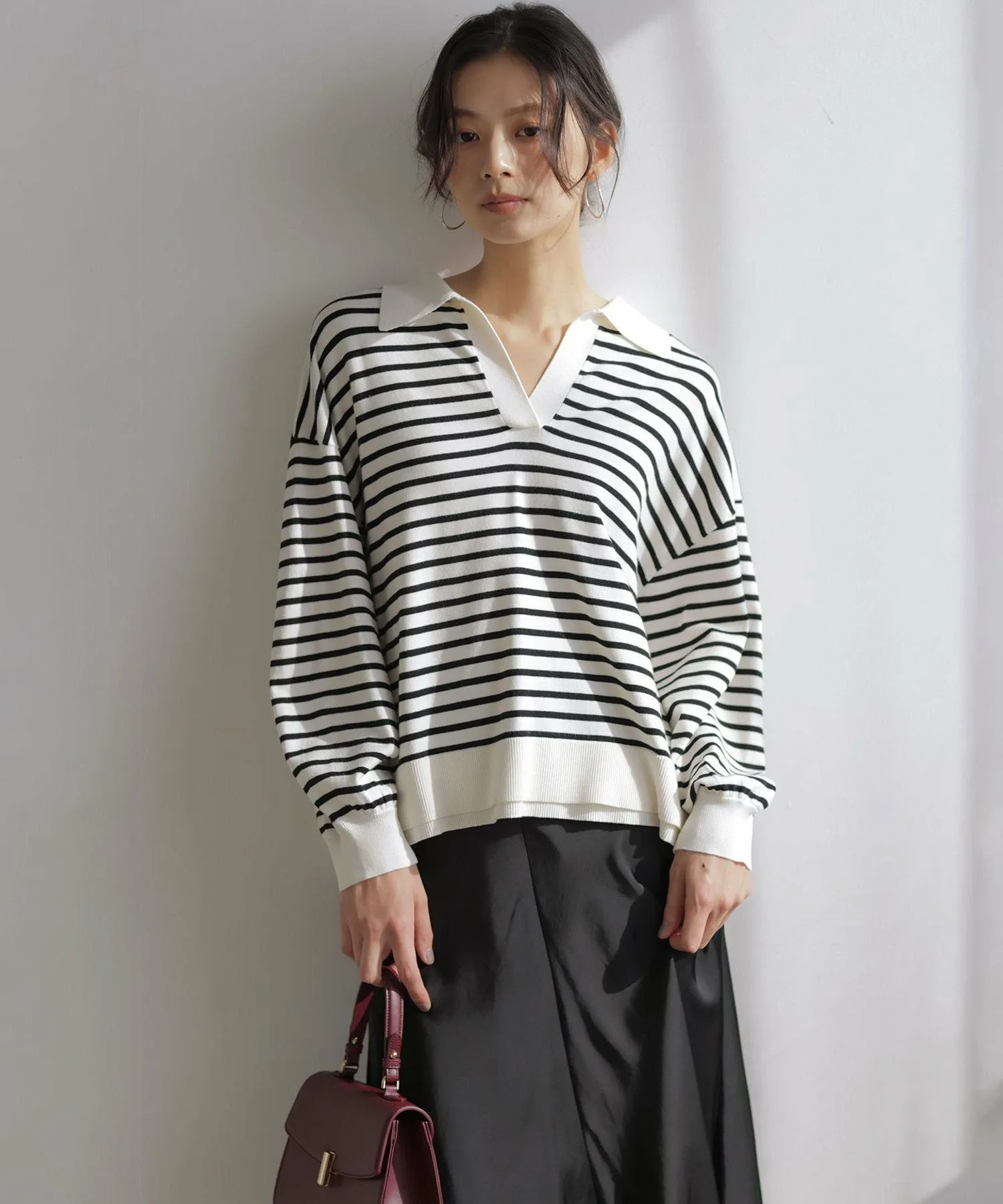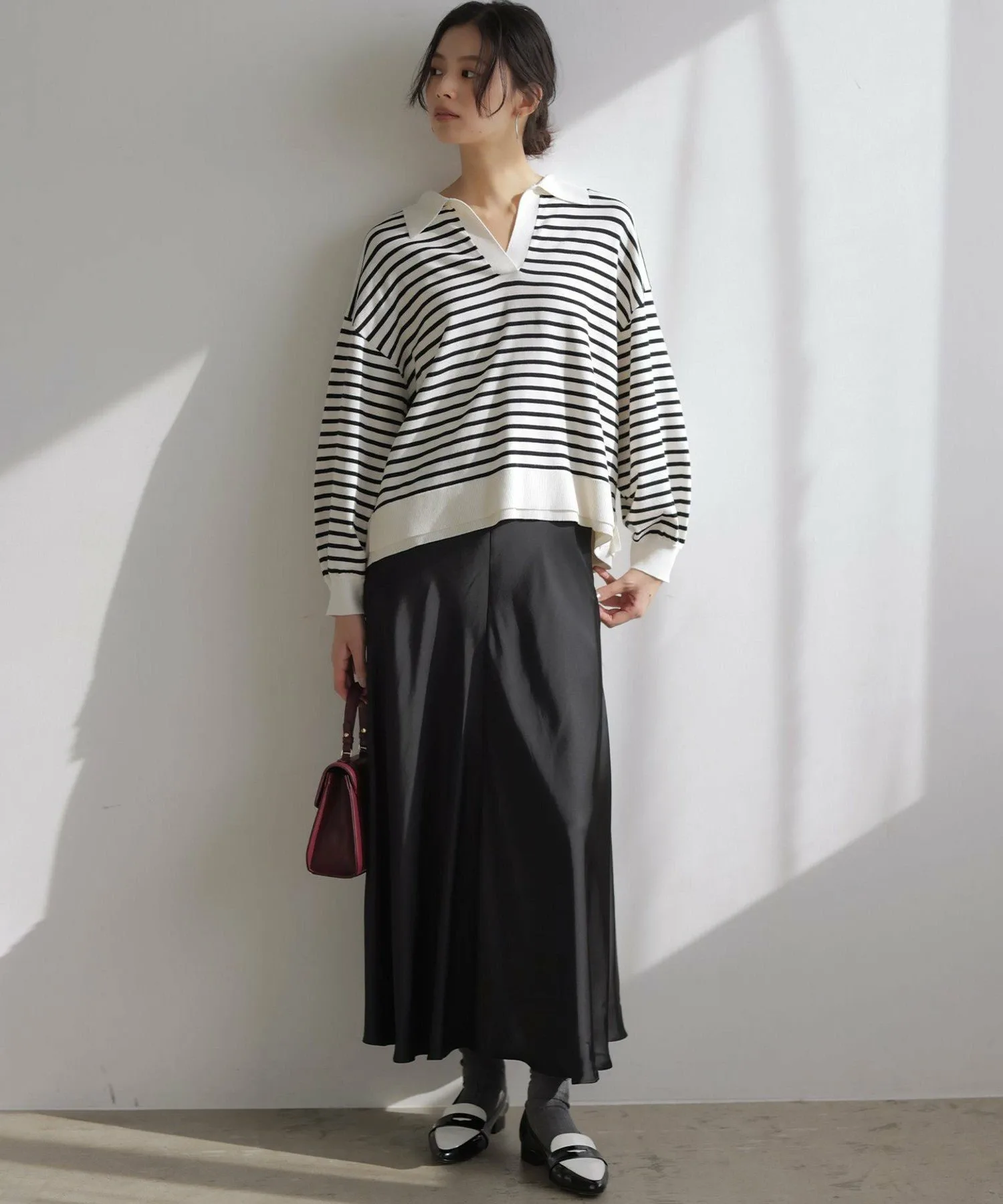 Дизайн・Мы уделили особое внимание открытому вырезу горловины, который подчеркивает женственность, идеальному размеру и объему при закатанных рукавах.・Он не подчеркивает линии тела, а подол хорошо сидит, поэтому выглядит аккуратно, заправленный в брюки или юбку.・Тонкая деталь подола позволяет создать сбалансированный образ, если заправить его.・Идеальная длина, чуть ниже бедер, позволяет легко сочетать его с любыми брюками или юбками.