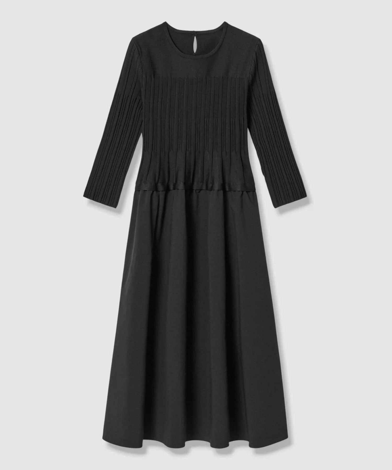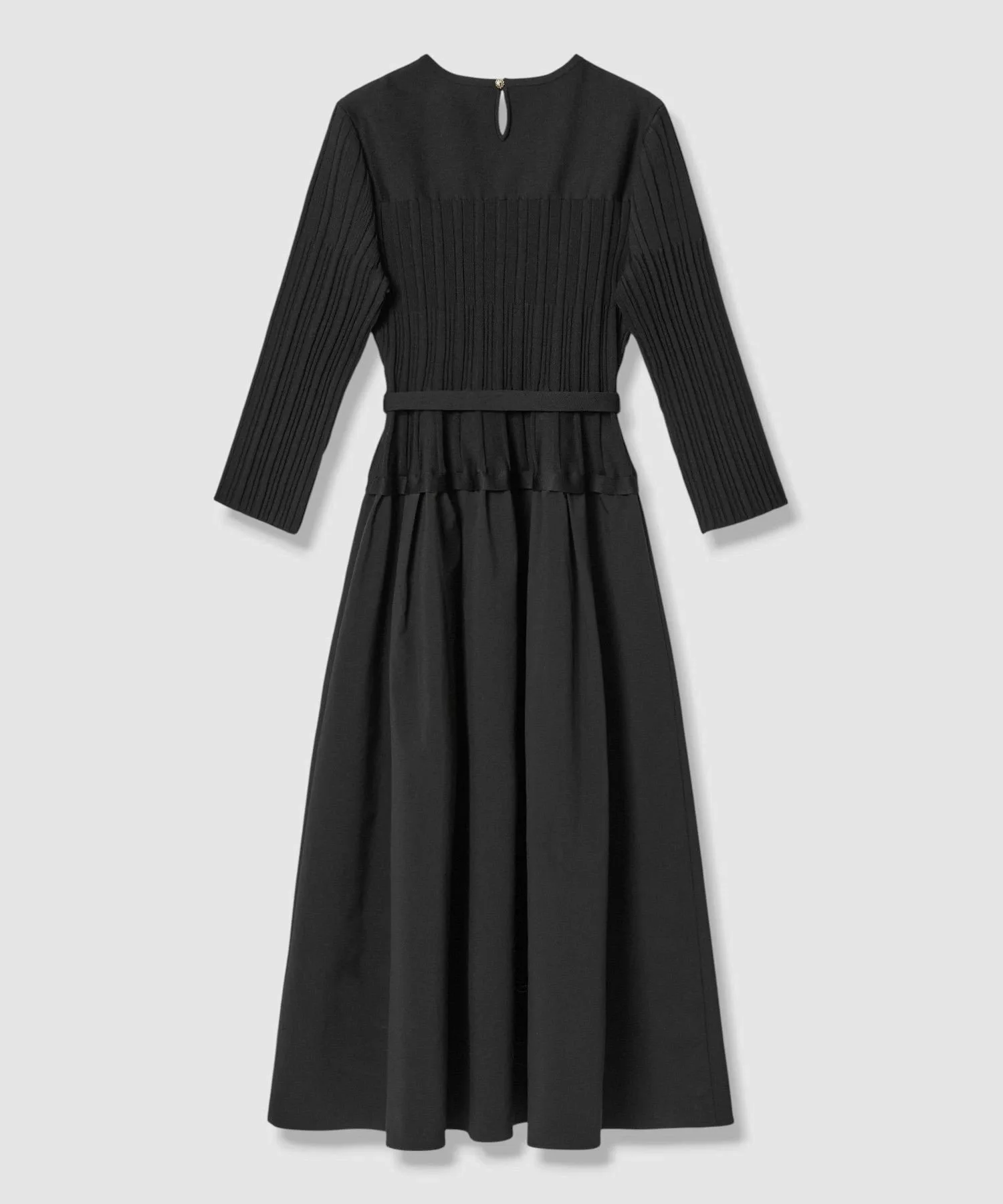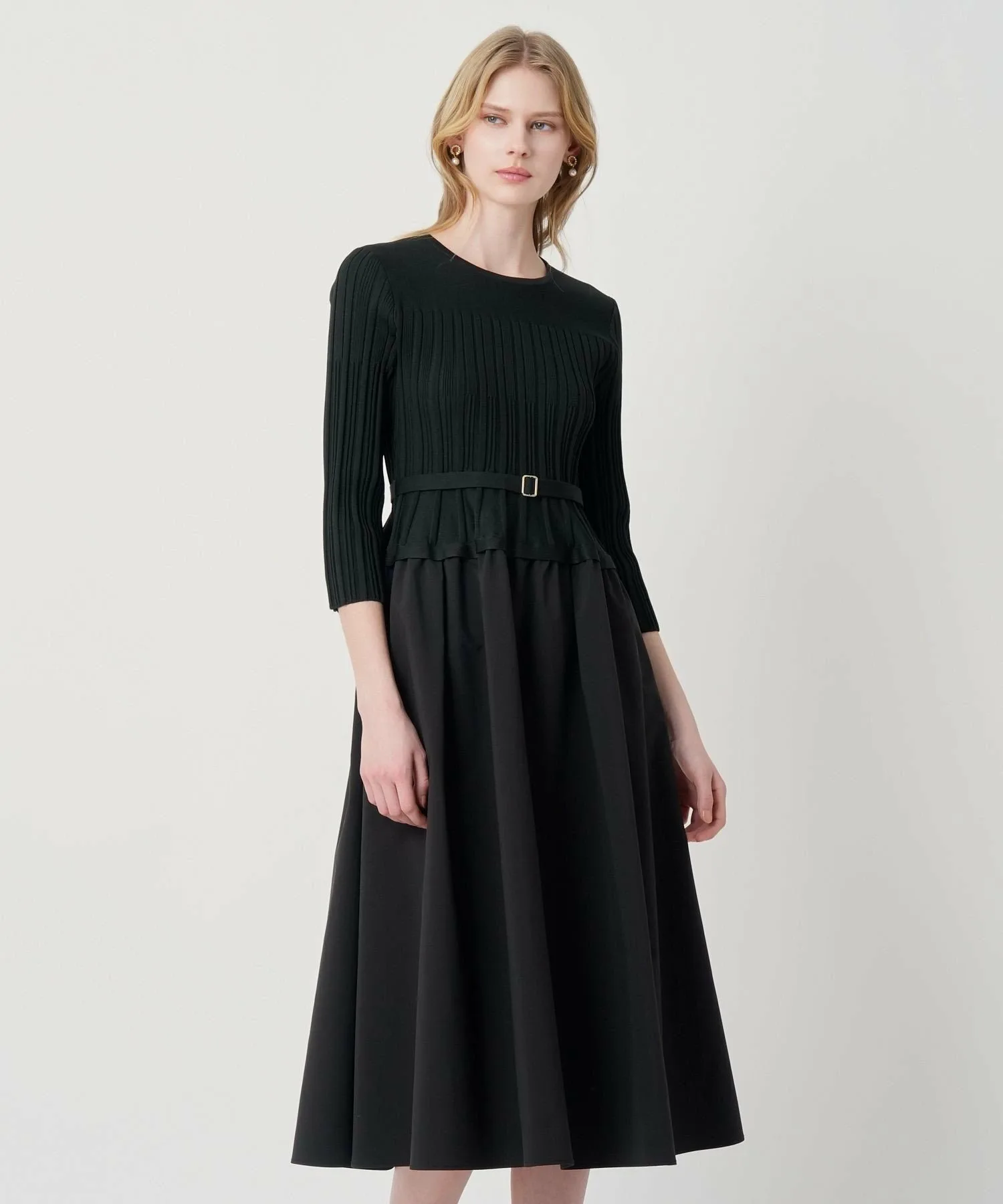 Это платье сочетает в себе ребристый верх и юбку из тафты.