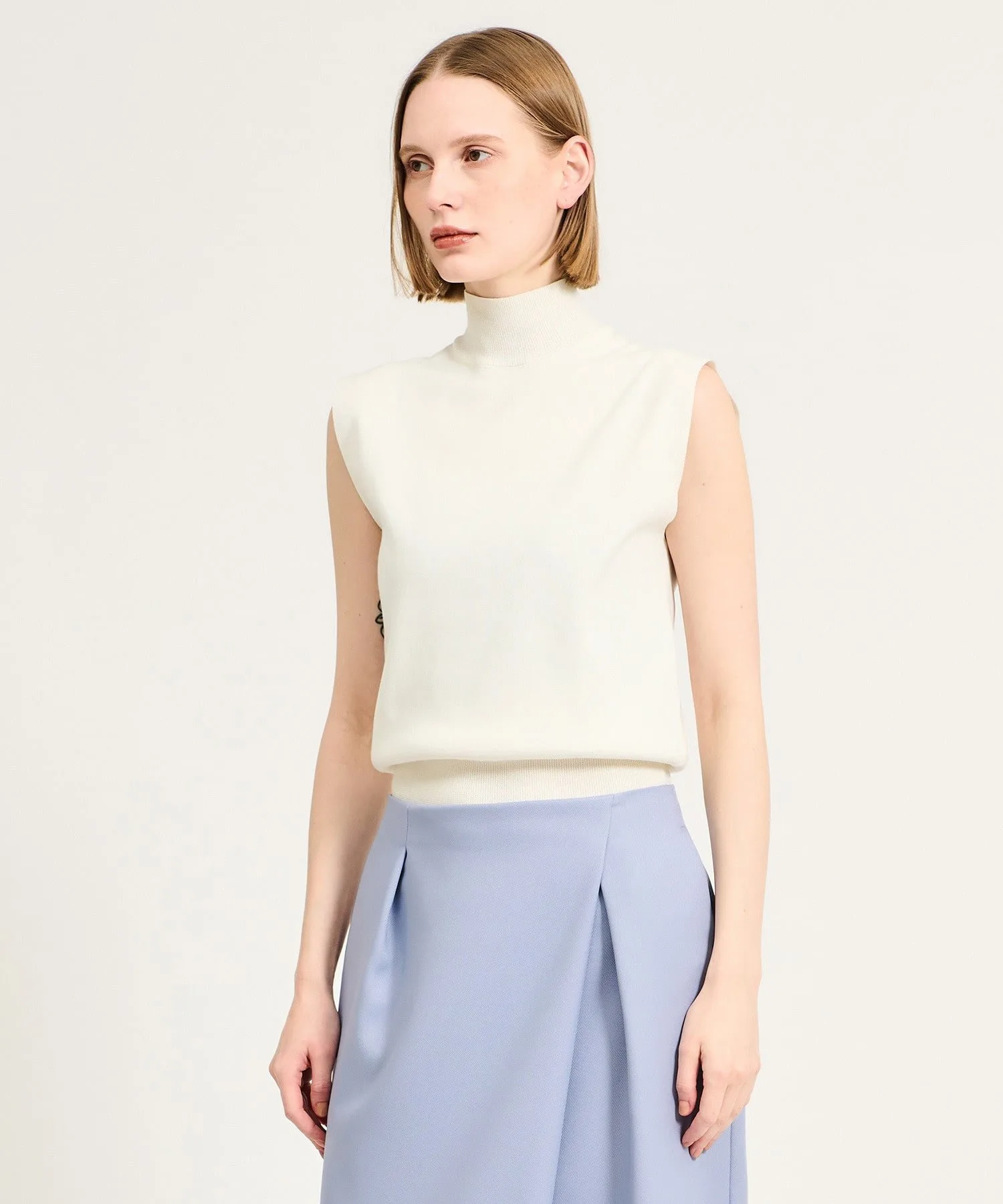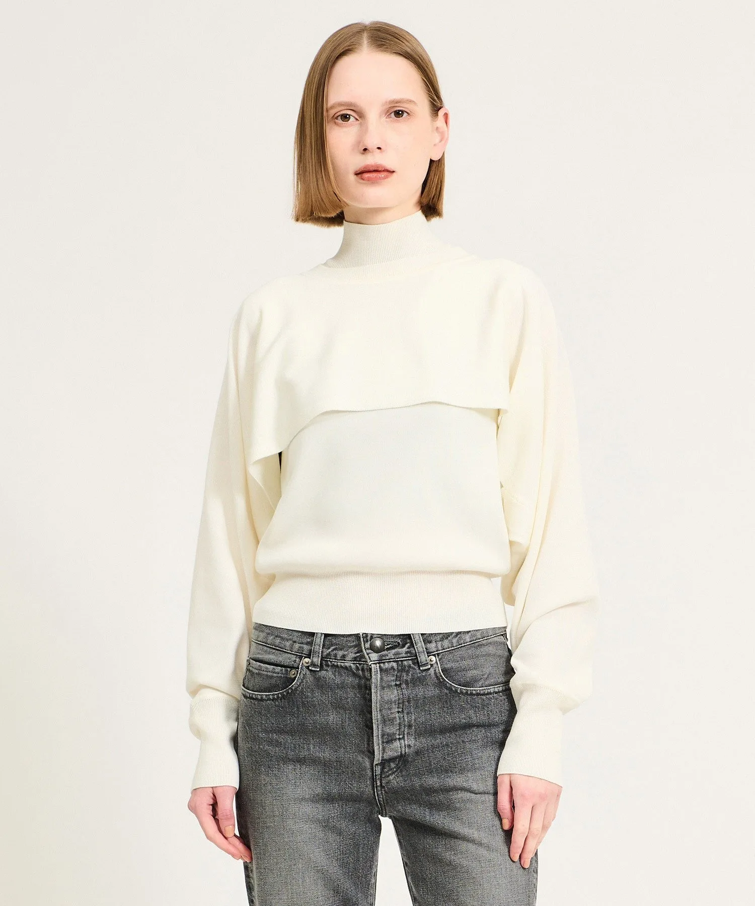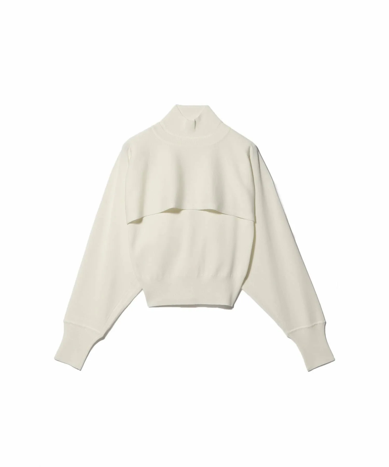 Многослойный трикотаж, сочетающий высокий воротник без рукавов и длинные рукава.