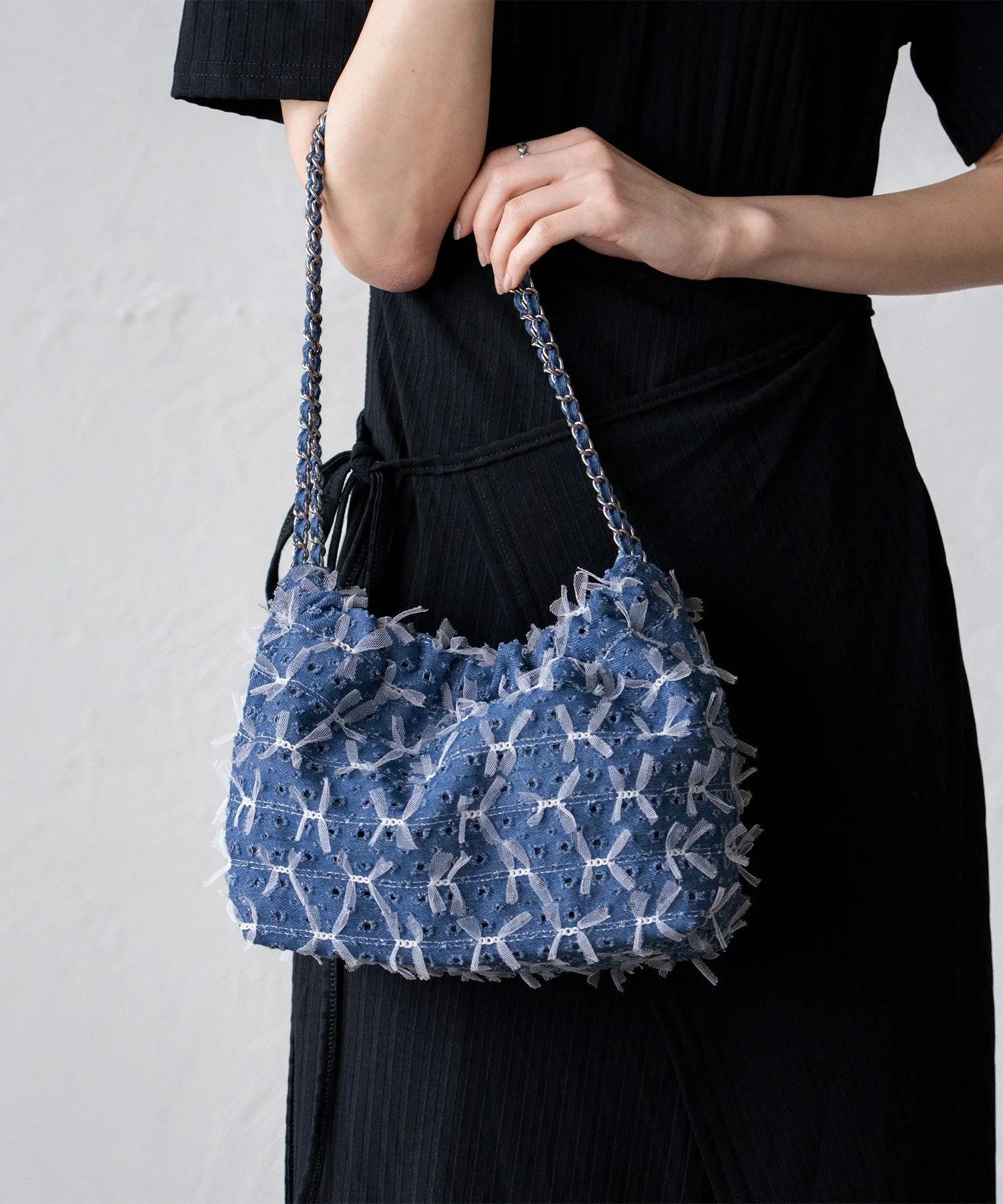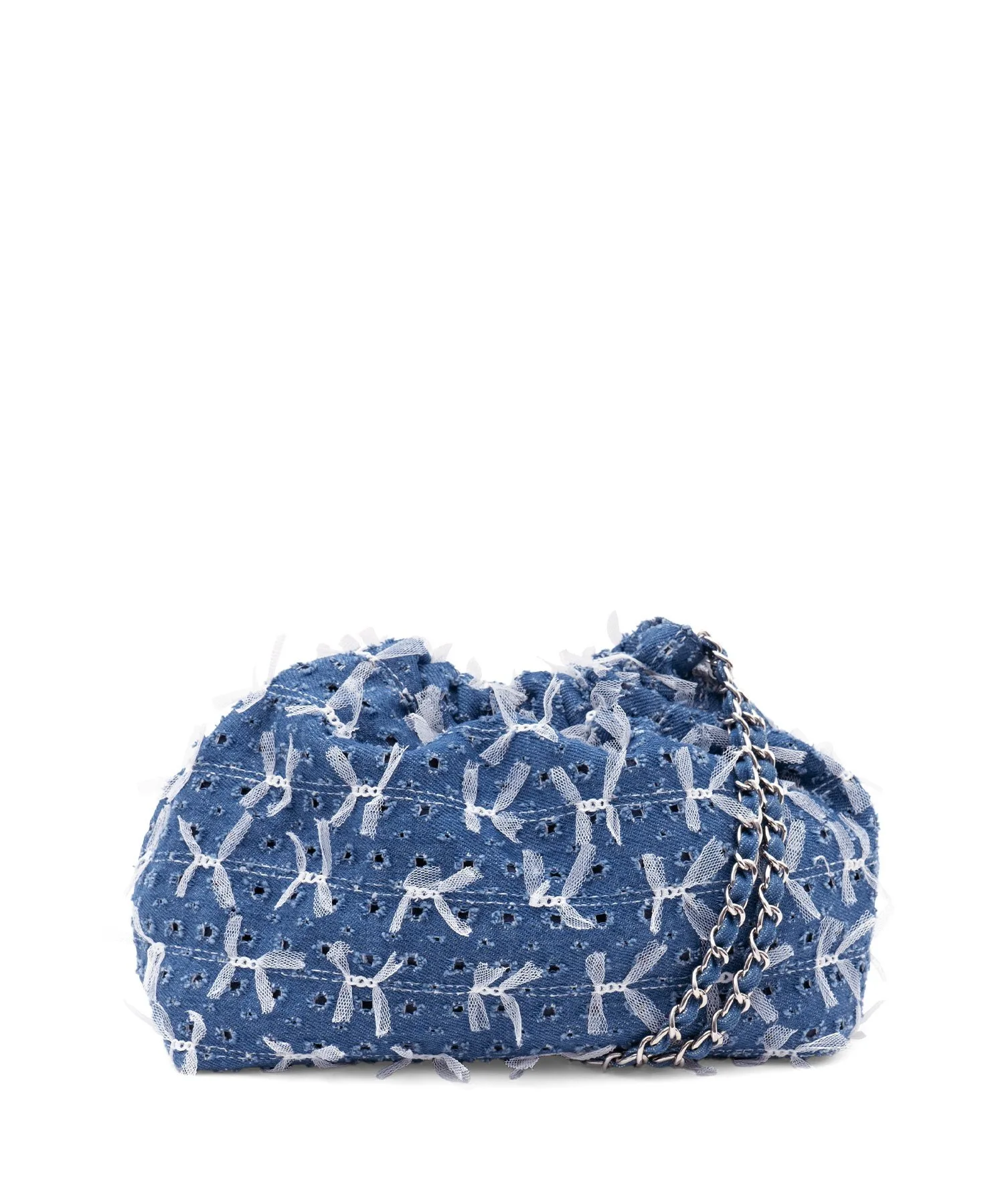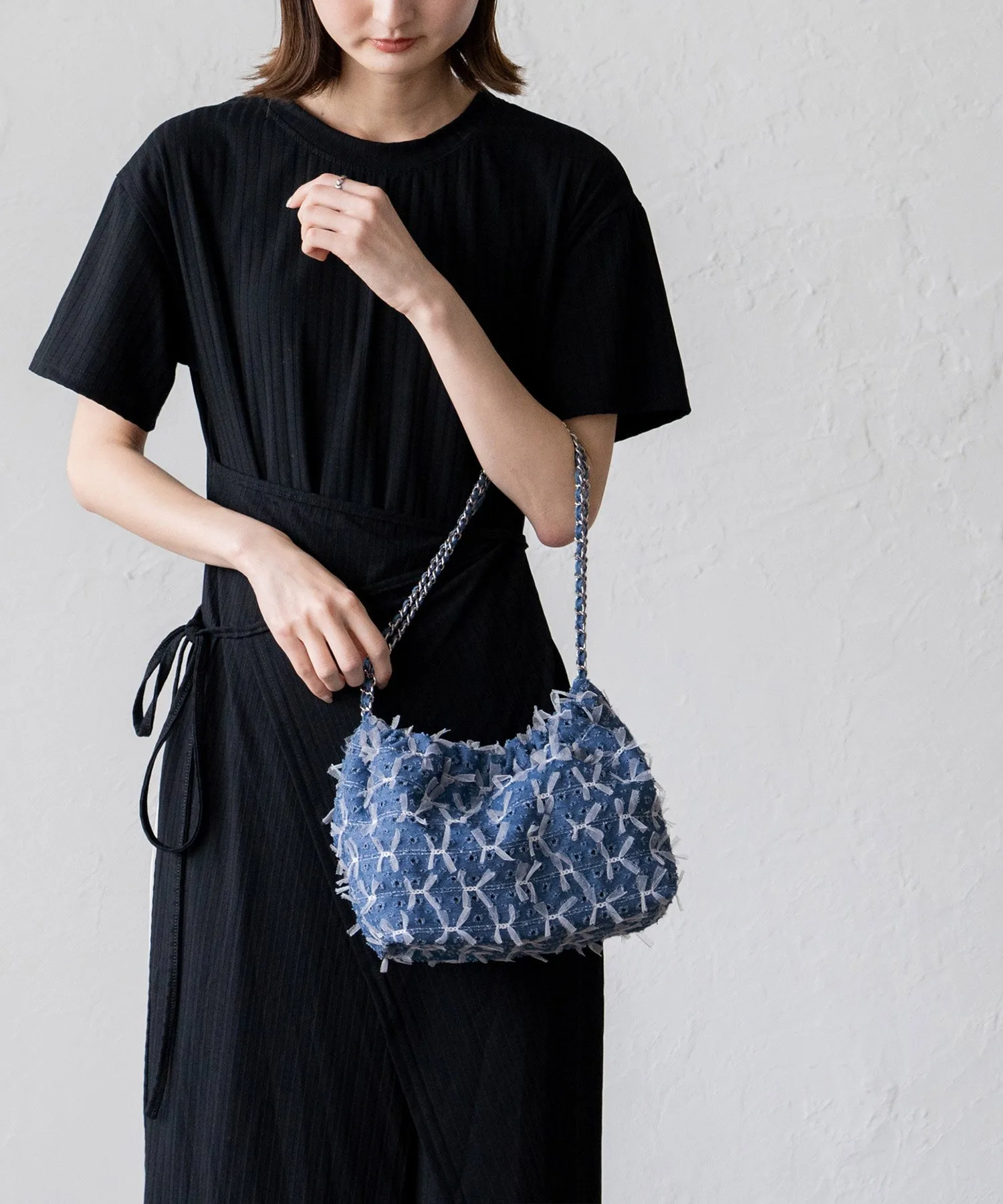 Сумка с женственным дизайном, выполненная из джинсовой ткани и лент.