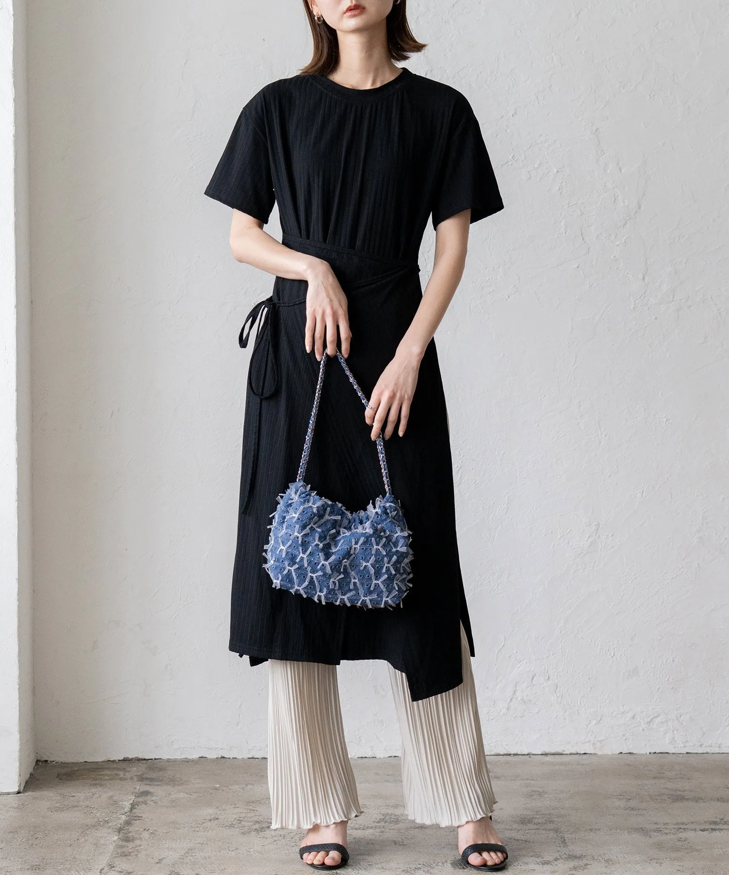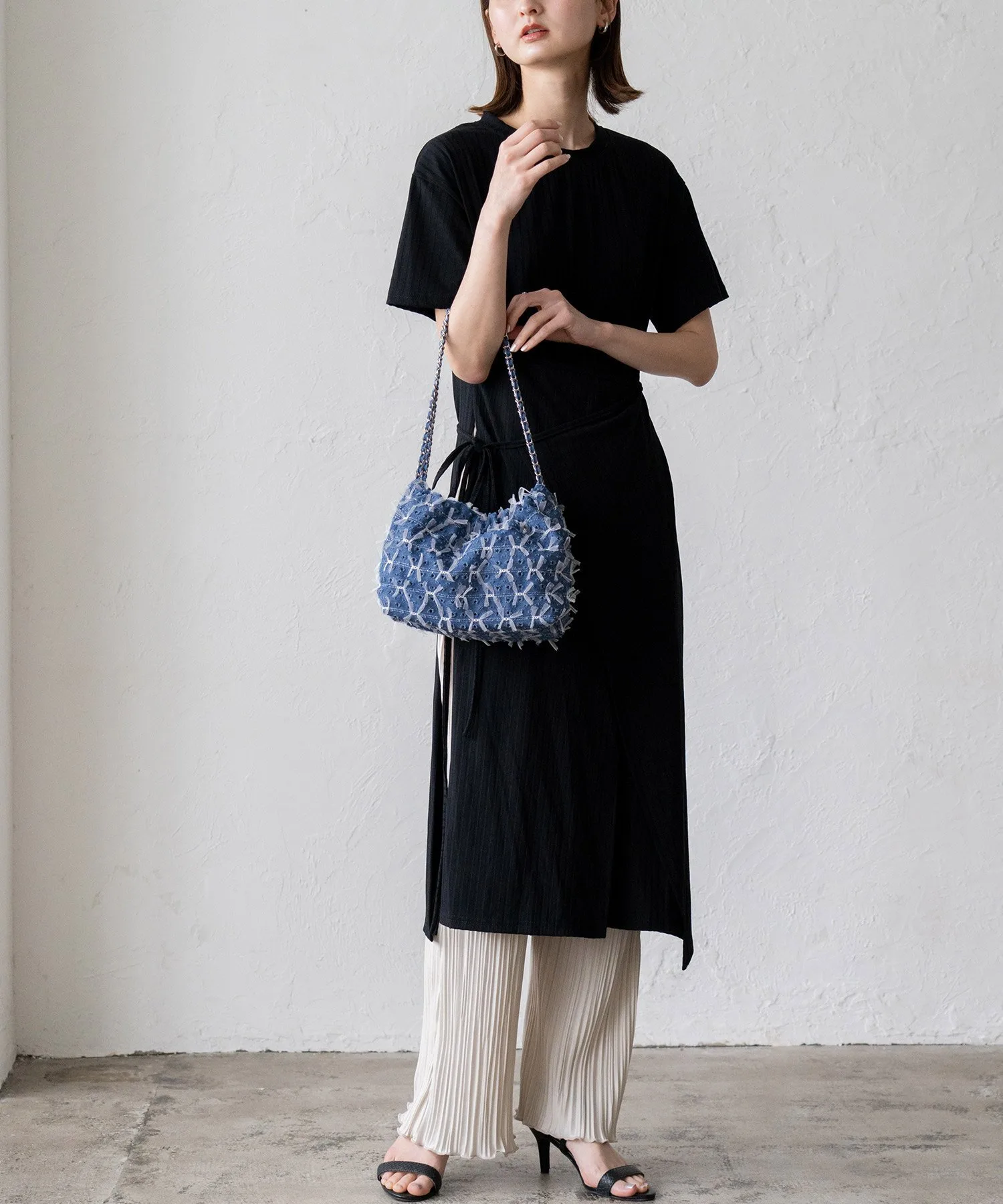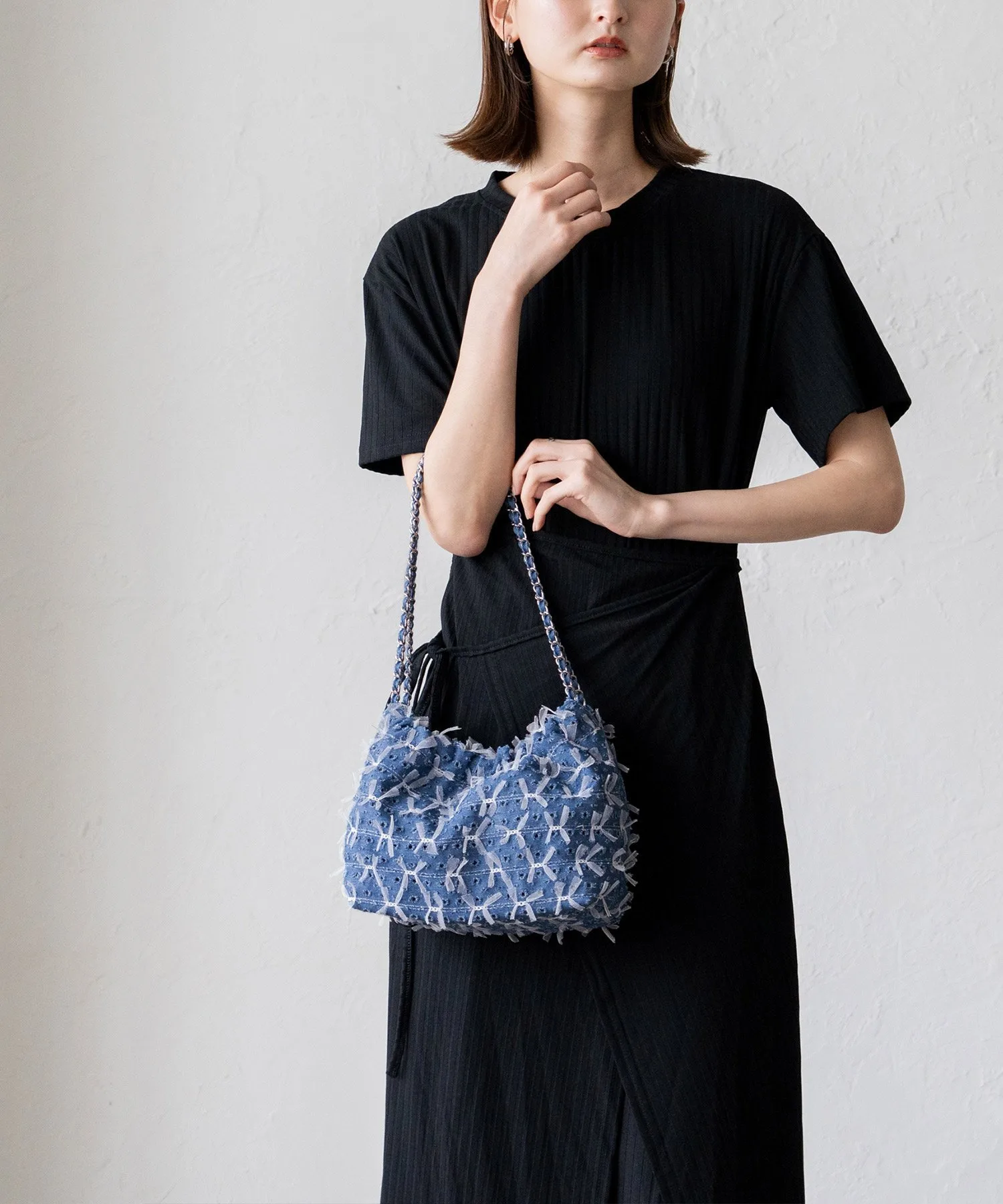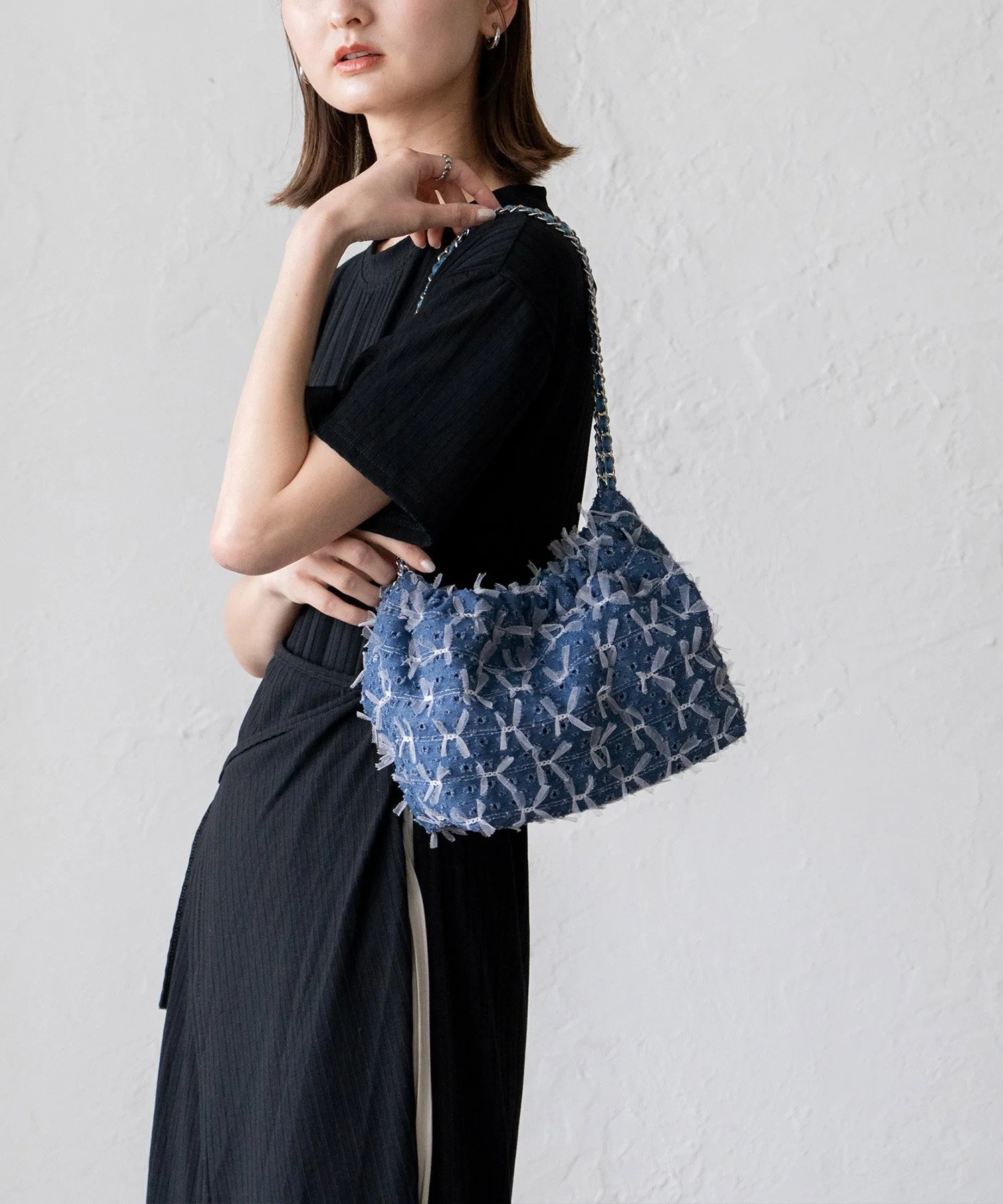Сумка с женственным дизайном, выполненная из джинсовой ткани и лент.