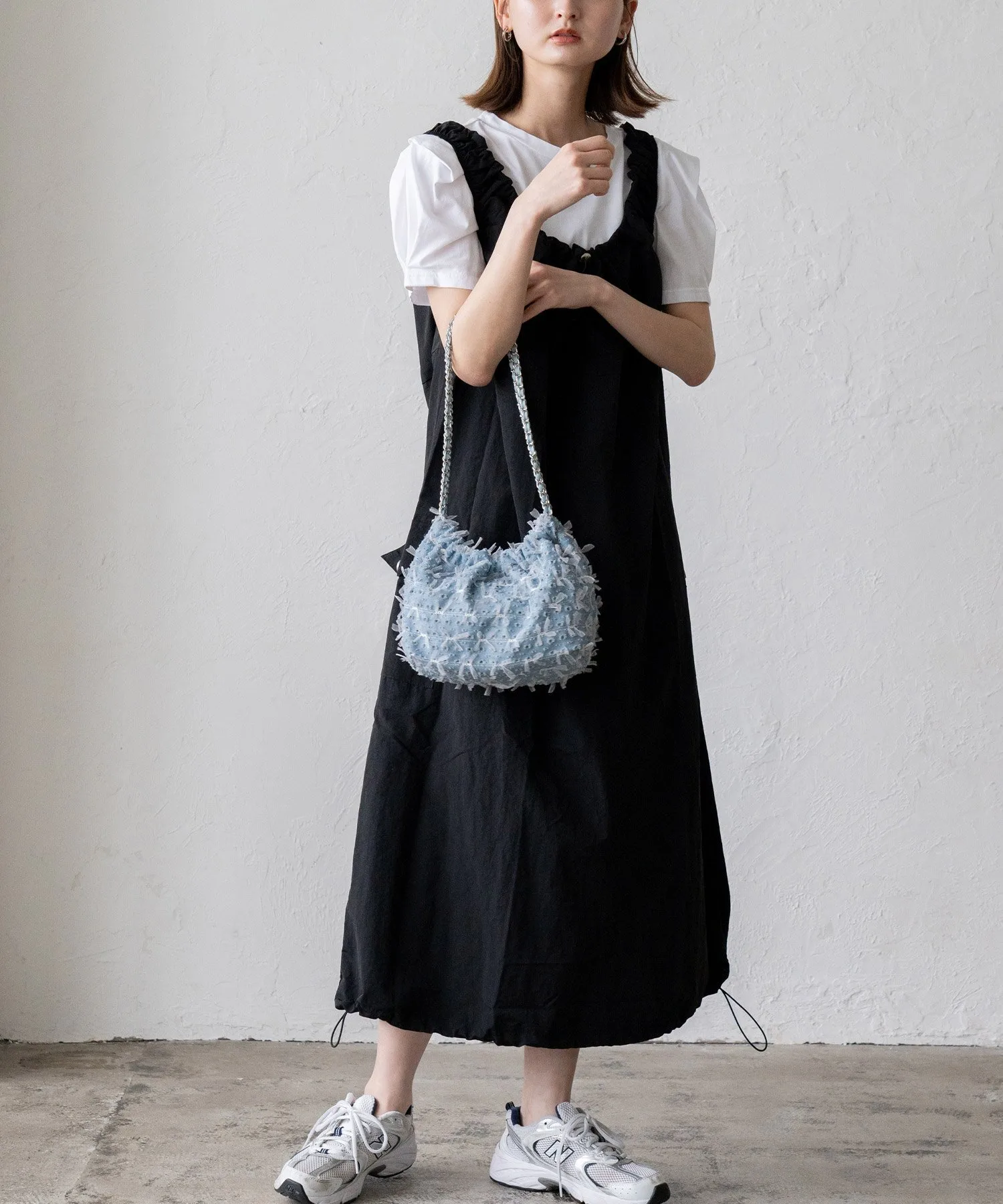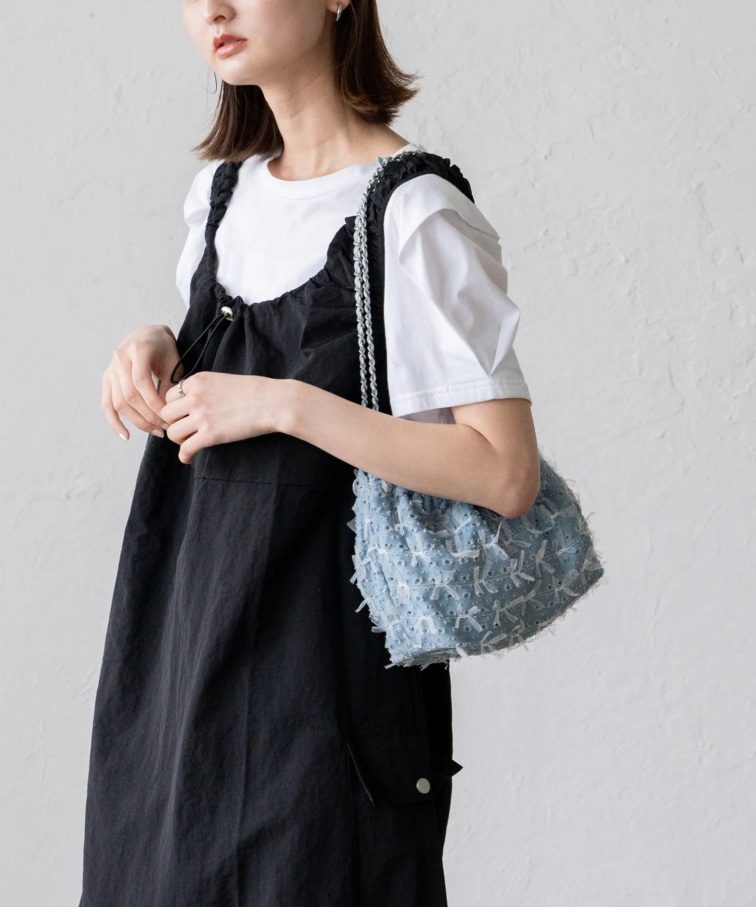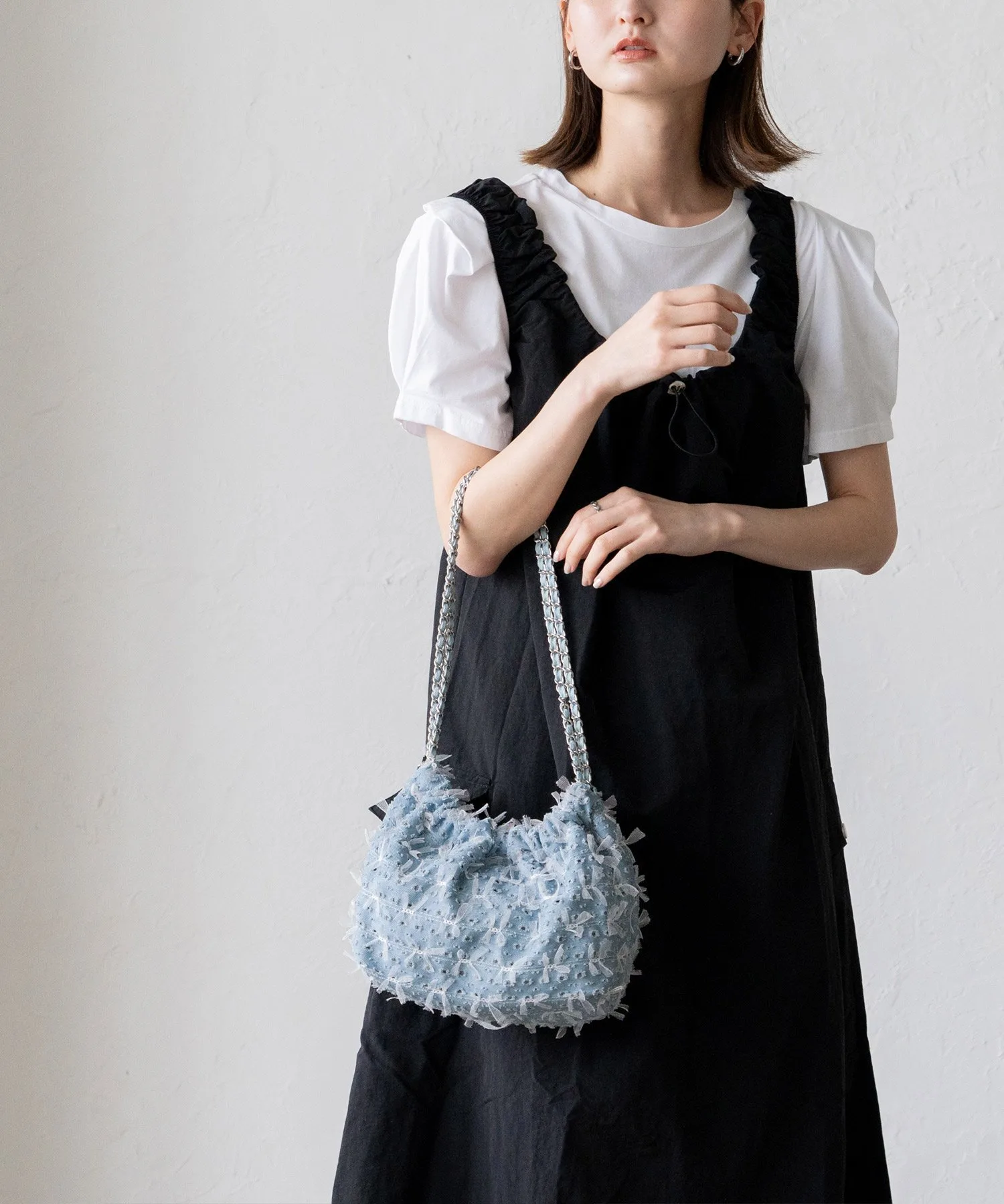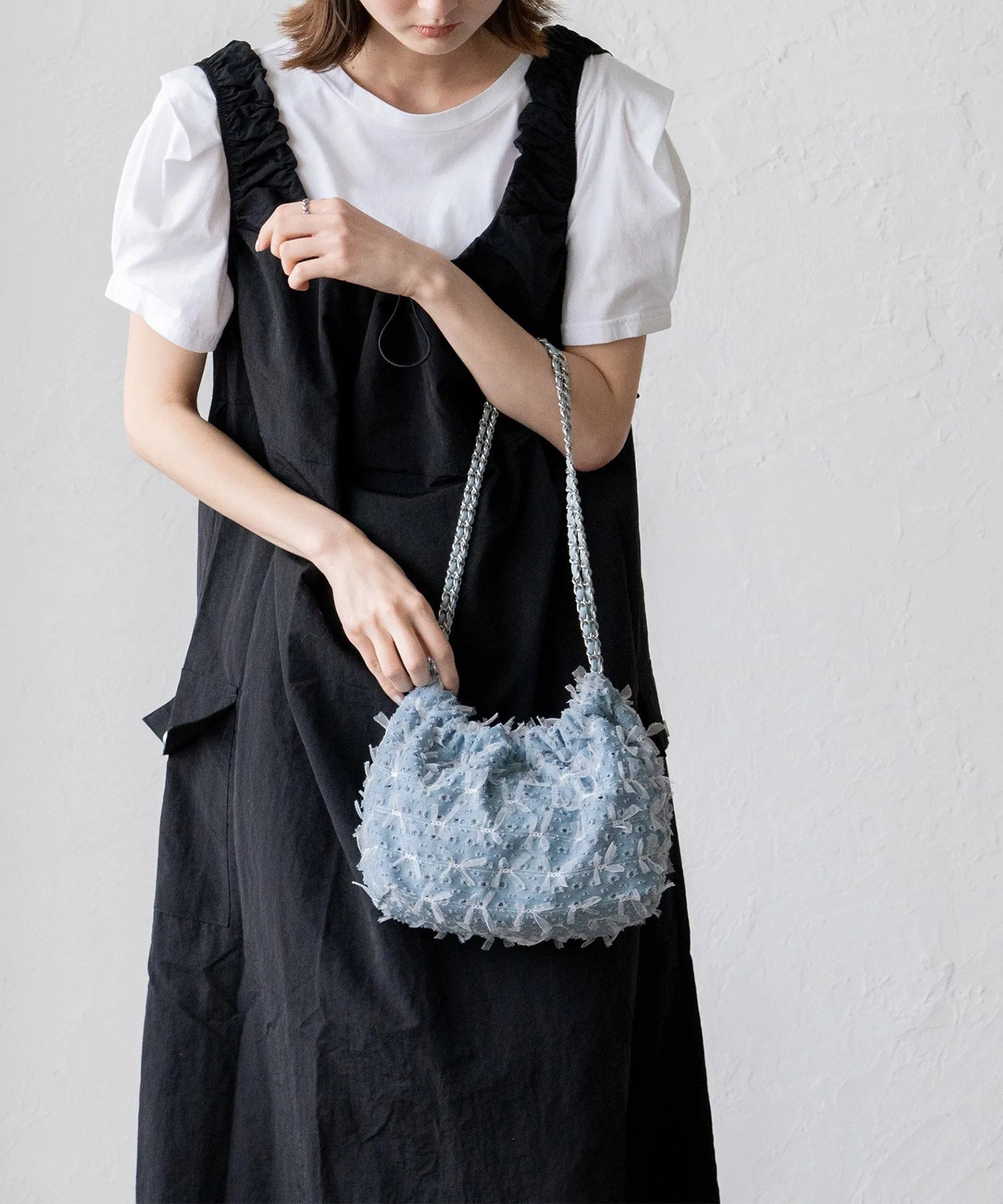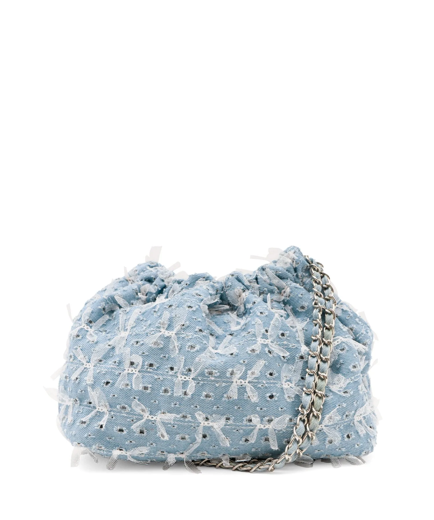 Сумка с женственным дизайном, выполненная из джинсовой ткани и лент.