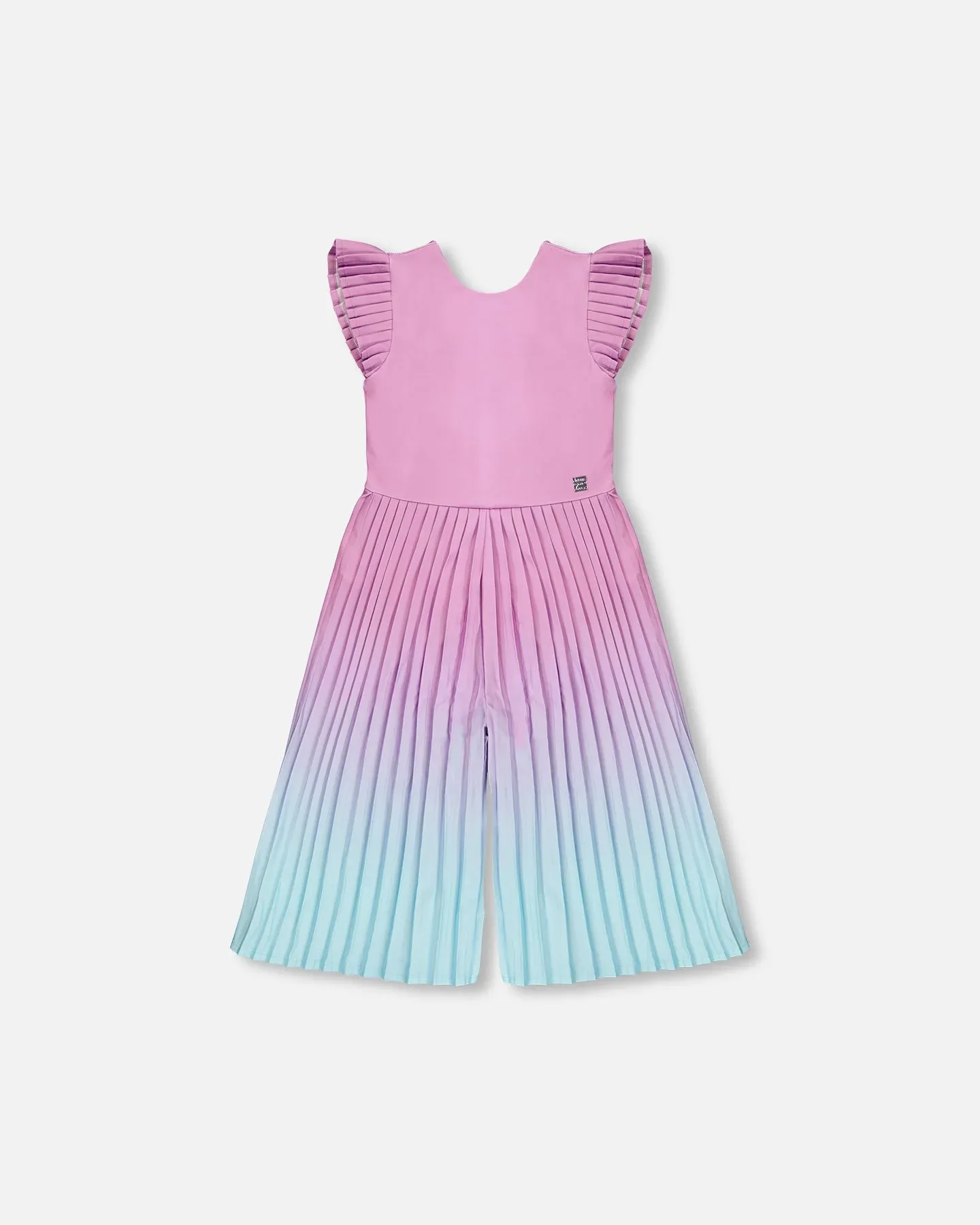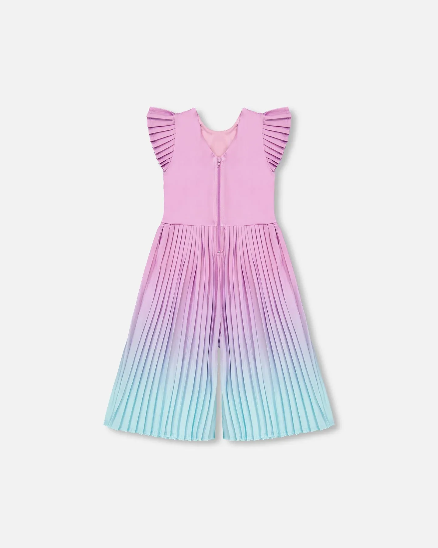 Этот комбинезон-капри сиреневого цвета с градиентом - игривый вариант для особых случаев. Комбинезон без рукавов имеет гладкий лиф с плиссированными рукавами-воланами и широкие штанины-капри с эффектным градиентом складок, переходящим от сиреневого к светло-голубому. Изготовленный из мягкого полиэстера с добавлением эластичных волокон, он обеспечивает комфорт и элегантность для юных девушек.