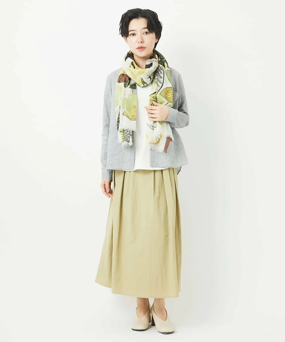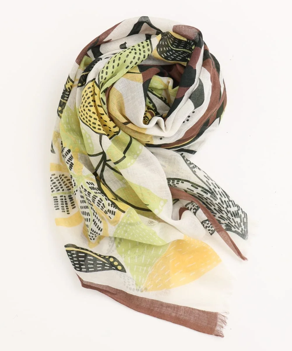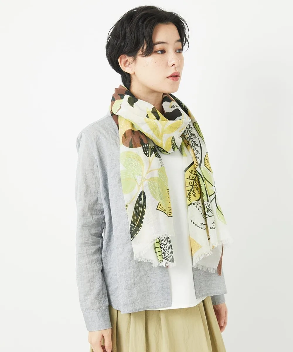 В разложенном виде многоцветный дизайн позволяет легко носить его на шее, так как он хорошо отражает цвет лица, а бежевый базовый цвет хорошо сочетается с цветом лица.