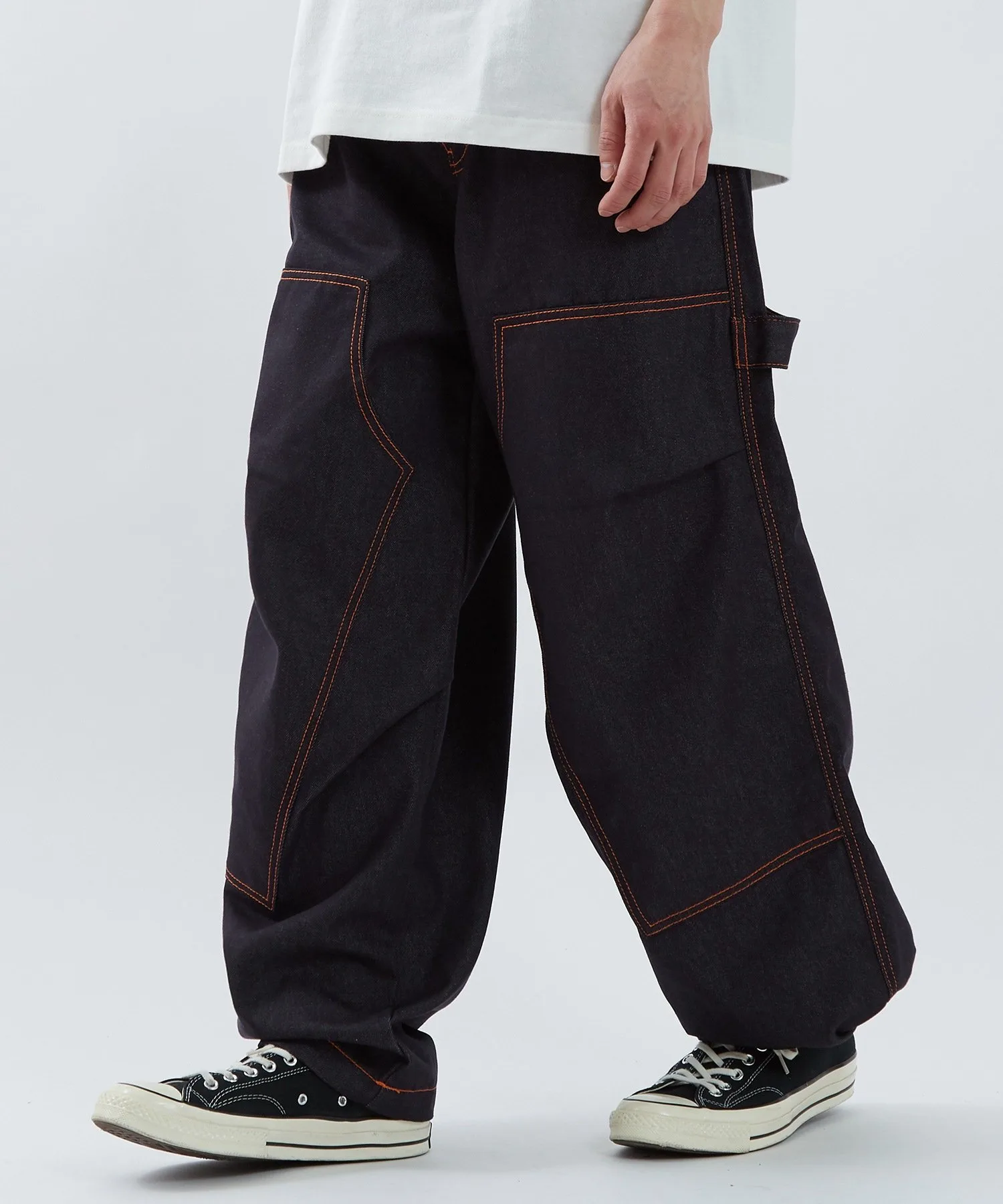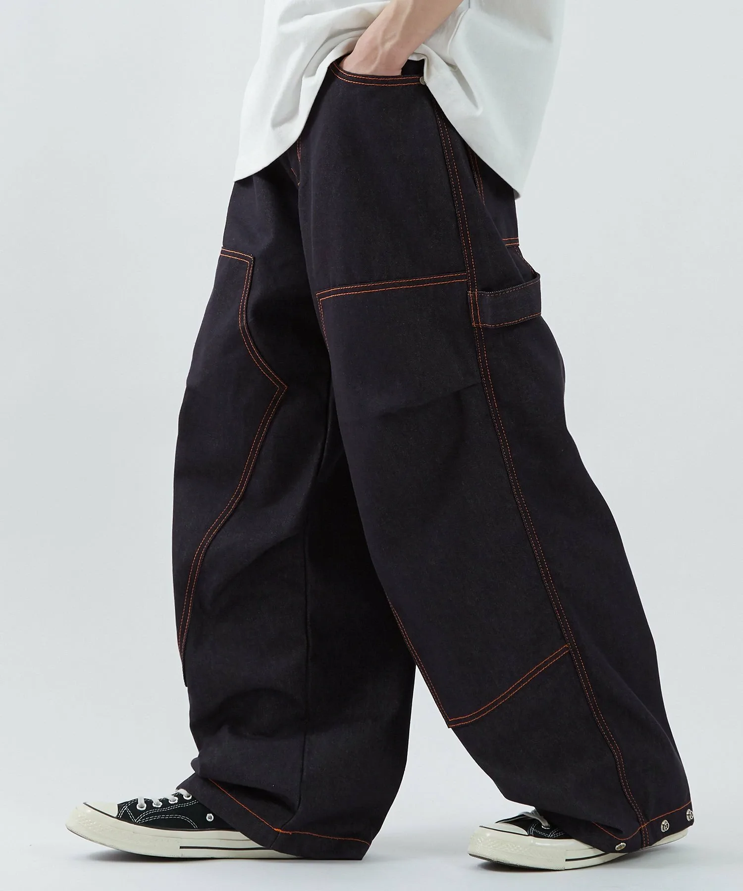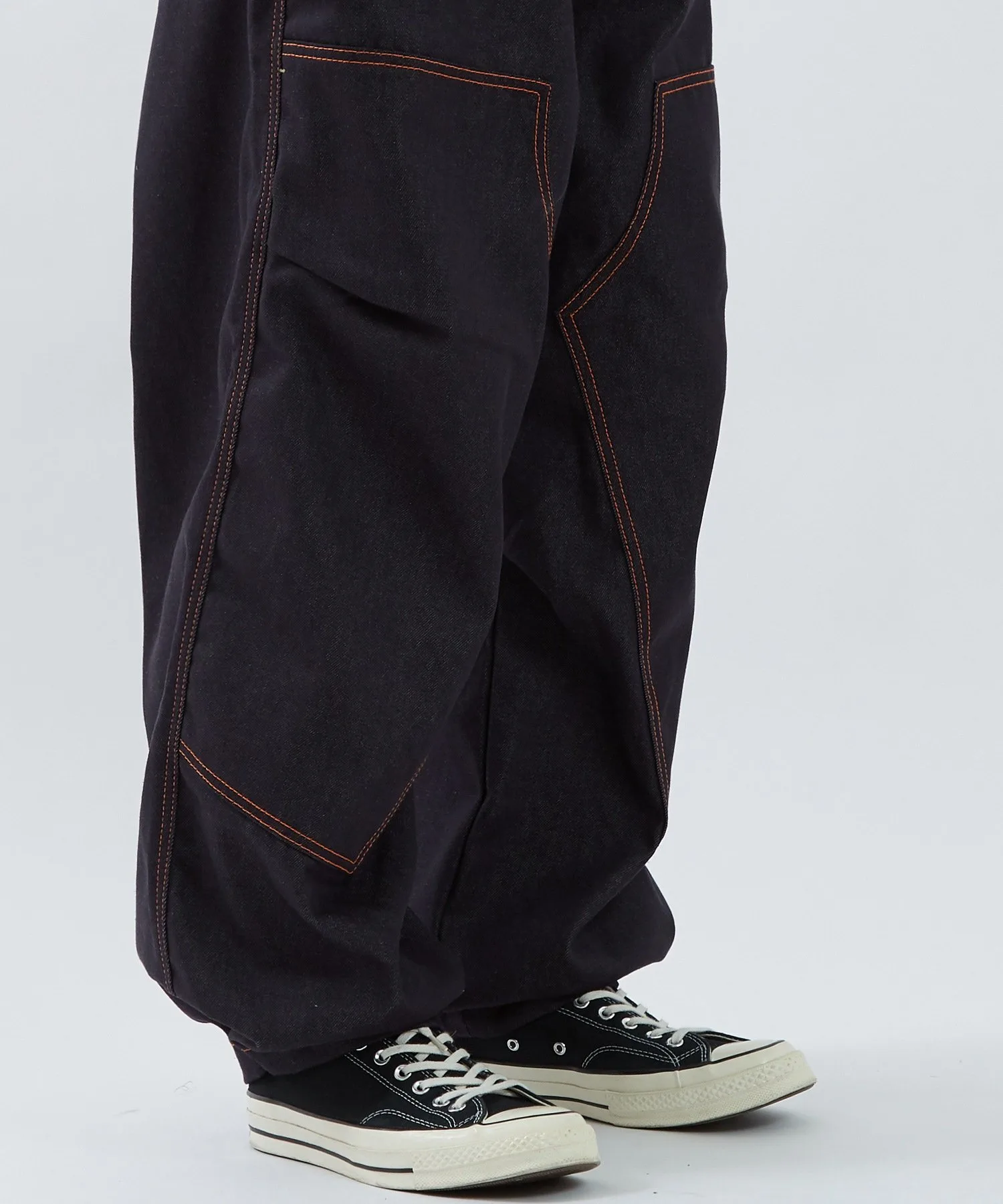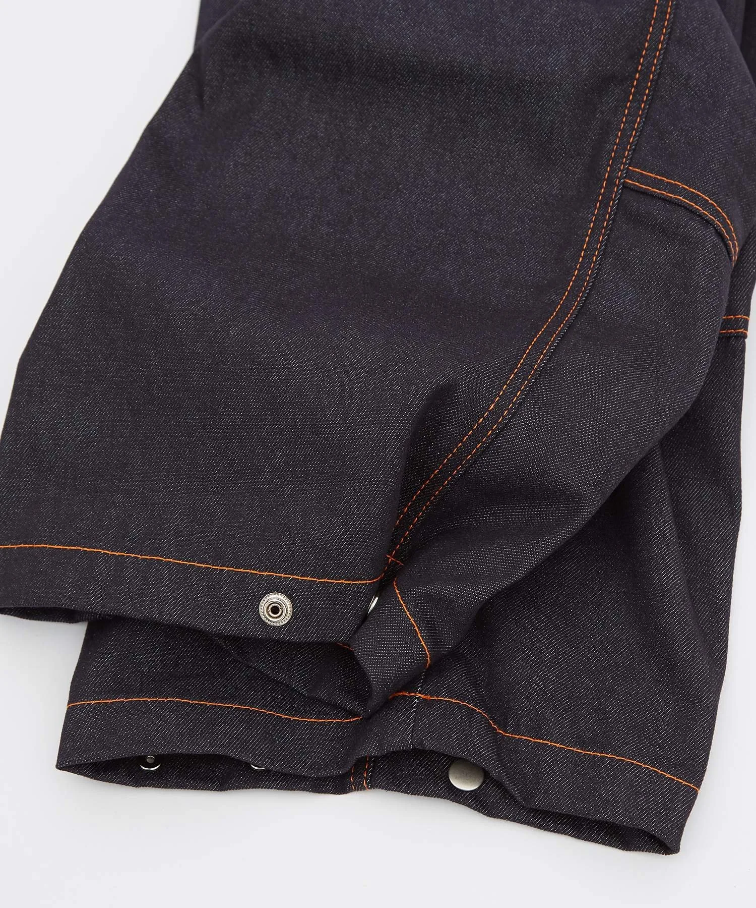 ●Оранжевая строчка выделяется на фоне темно-синего денима. Она подчеркивает линии швов и добавляет акцент в дизайн.