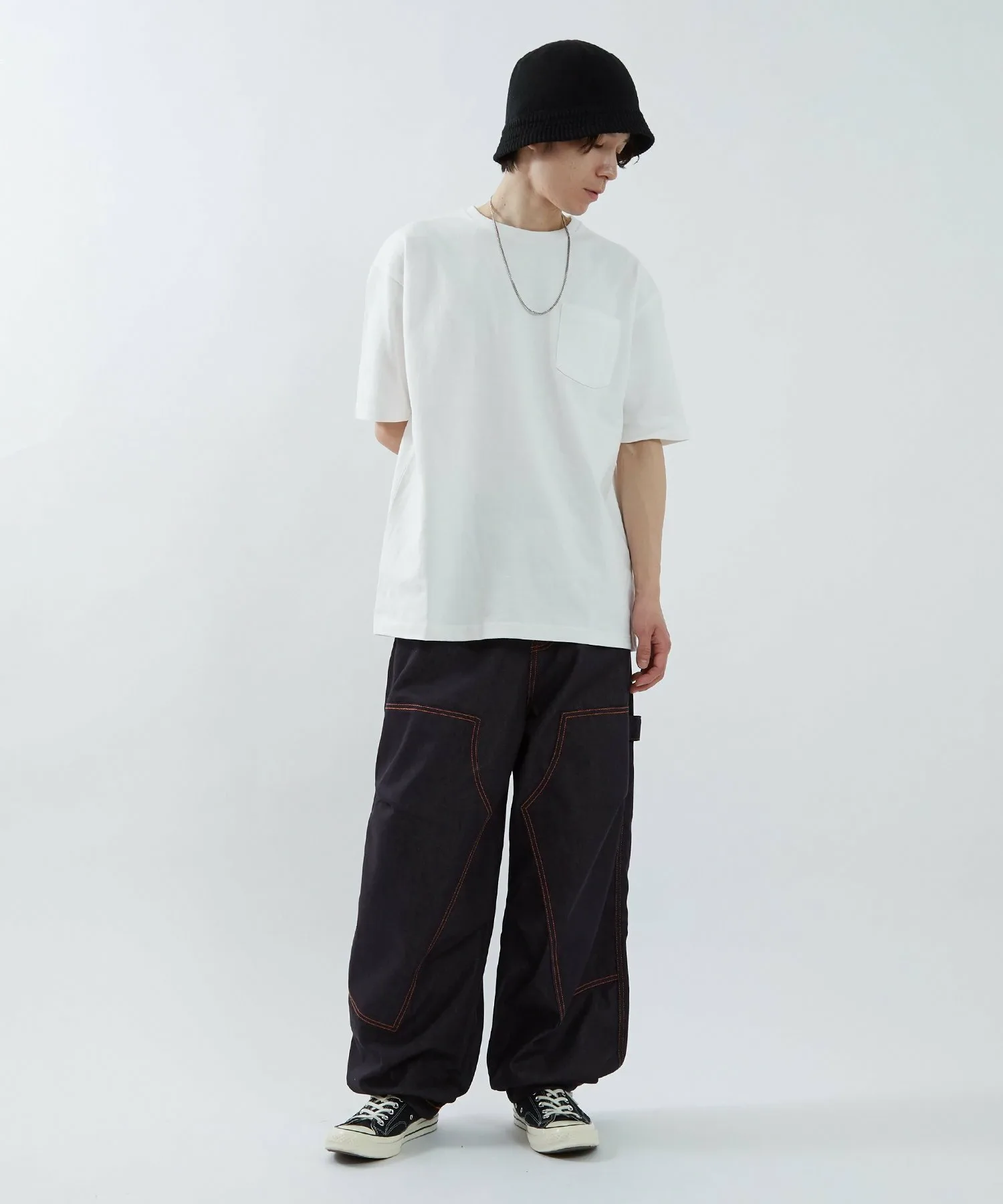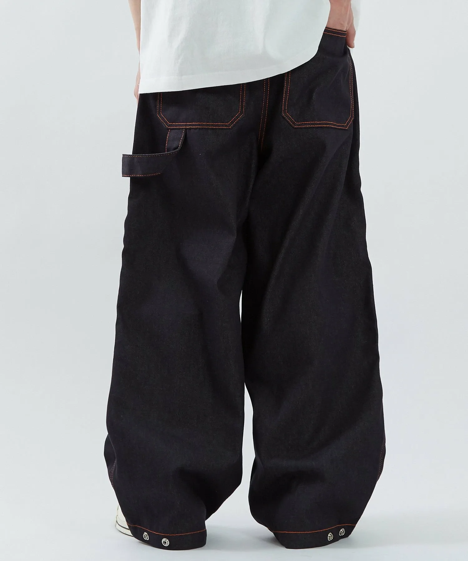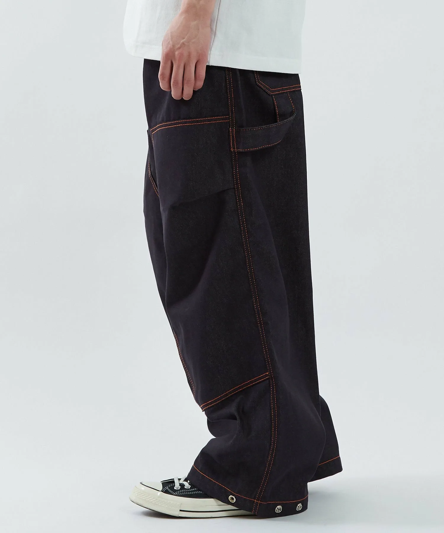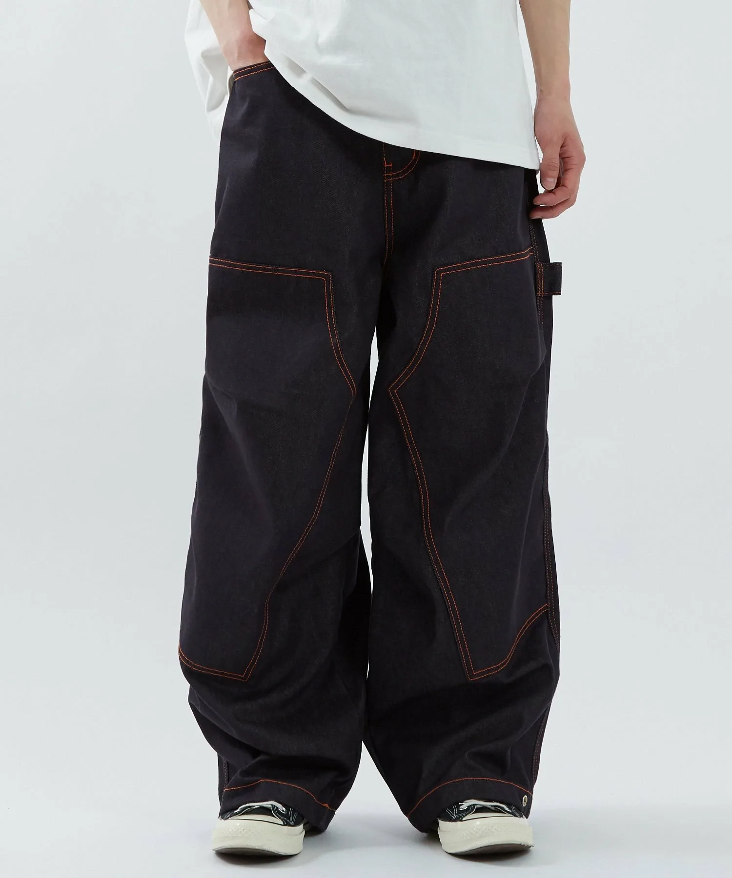 ●Оранжевая строчка выделяется на фоне темно-синего денима. Она подчеркивает линии швов и добавляет акцент в дизайн.