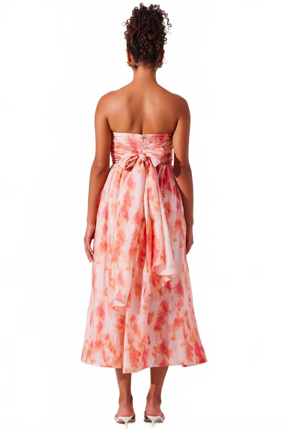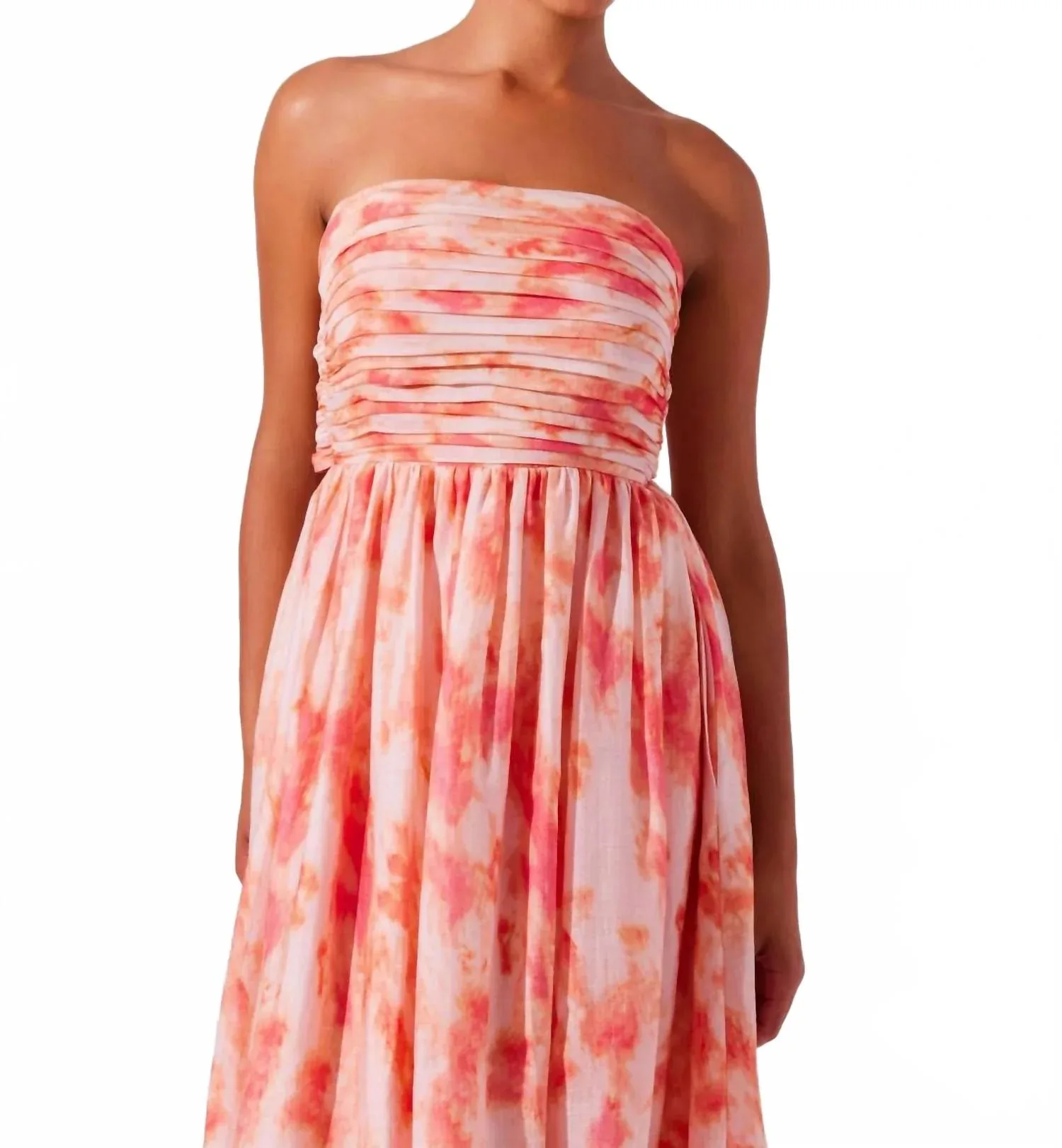 Просто добавьте шлепанцы или мюли, и вы готовы. Представляем платье ASTR Aneesha - потрясающее платье без бретелей в очаровательном коралловом цвете с эффектом тай-дай для шикарного летнего образа. Это платье миди в стиле бохо имеет силуэт «приталенное и расклешенное», подчеркнутый боковыми вставками и противоскользящей лентой по внутреннему краю подола для надежной фиксации. Оно изготовлено из смеси 85% лиоцелла и 15% полиэстера со 100% вискозной подкладкой, обеспечивая стиль и комфорт. Платье имеет регулируемый большой бант на завязках сзади, функциональные боковые карманы и скрытую молнию сзади для непринужденной элегантности. Уход - только химчистка.