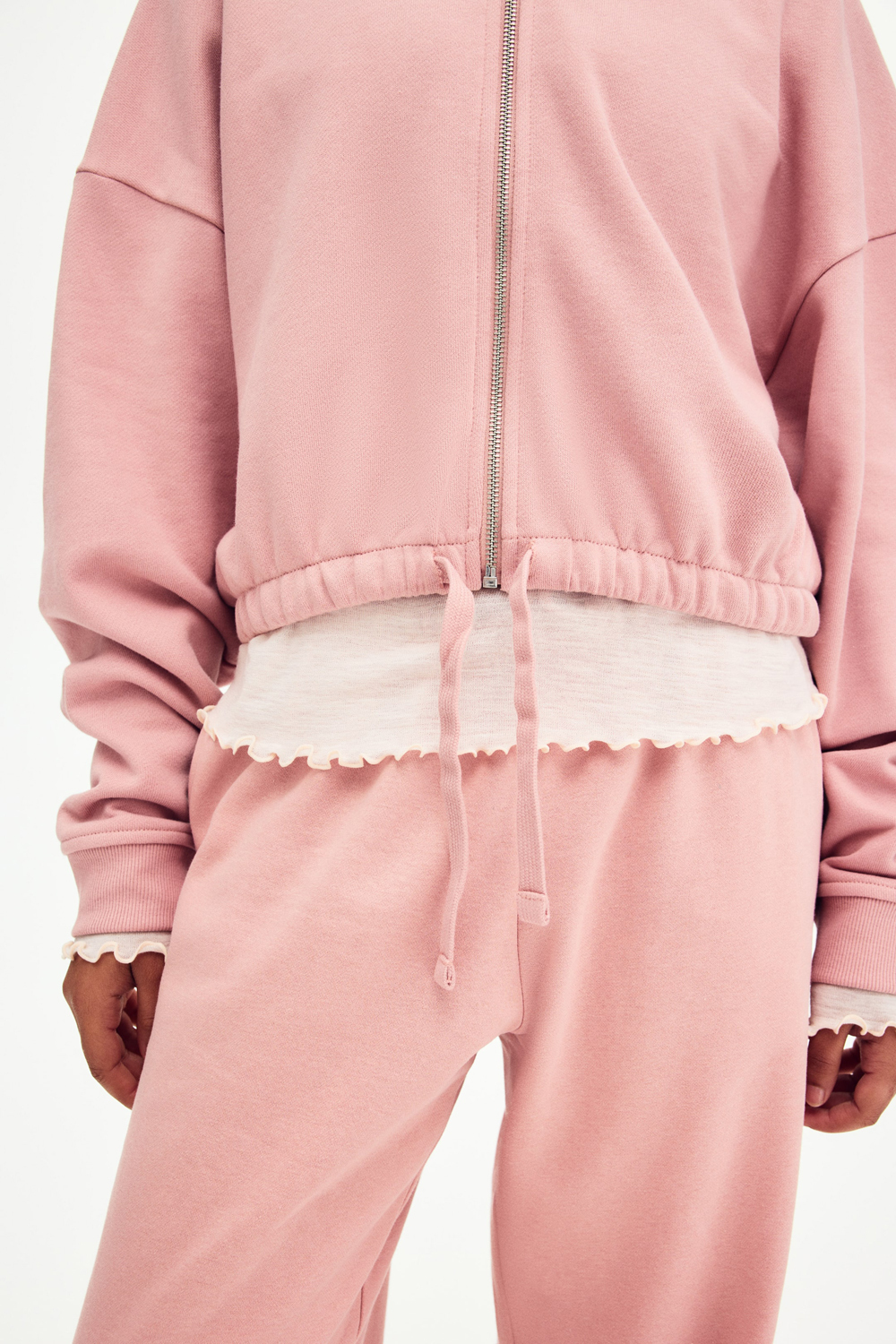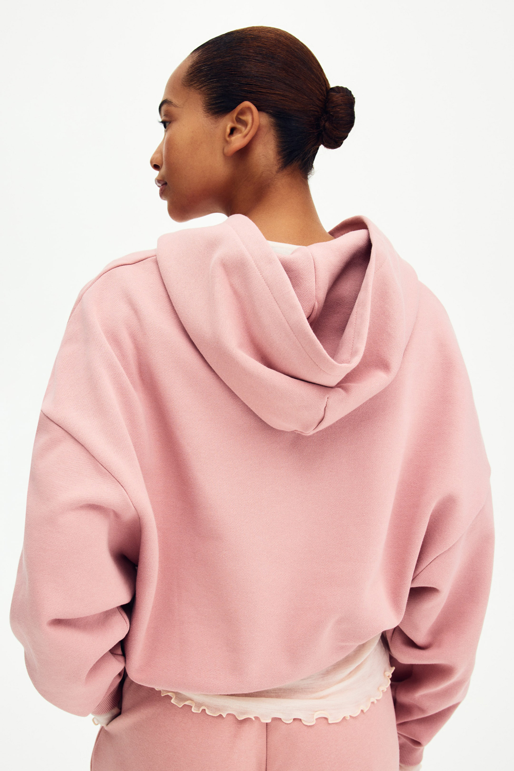 Укороченная длина — главный тренд сезона. Она визуально удлиняет силуэт и отлично сочетается с джинсами с высокой посадкой, юбками или леггинсами. Капюшон с мягкой джерсовой подкладкой защитит от ветра, а удобная застежка-молния позволяет регулировать степень открытости. Сильно опущенная линия плеча создает тот самый расслабленный, небрежный силуэт, который так ценится в уличной моде. Манжеты на рукавах и кулиска по низу позволяют подогнать худи точно по фигуре, создавая идеальный баланс между объемом и формой.