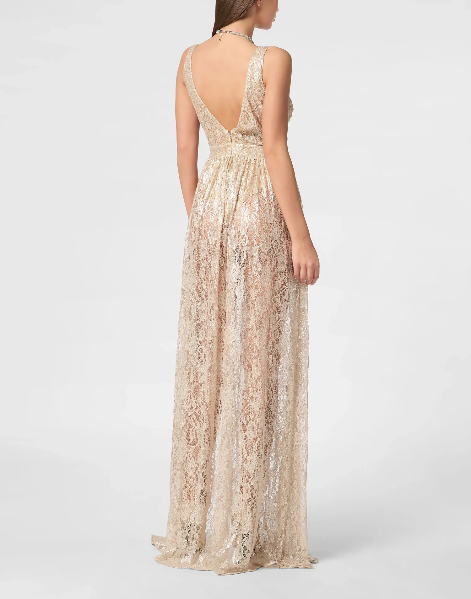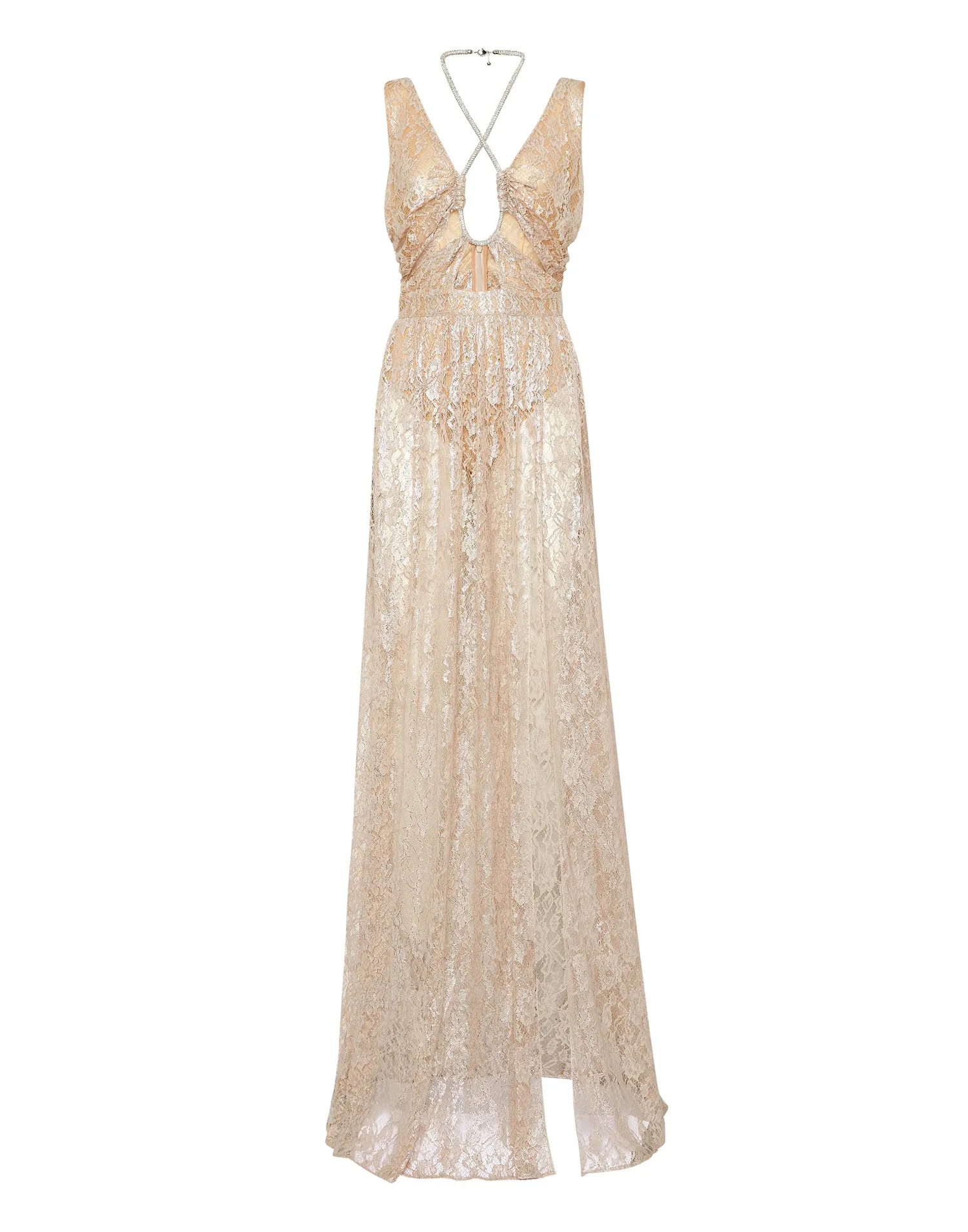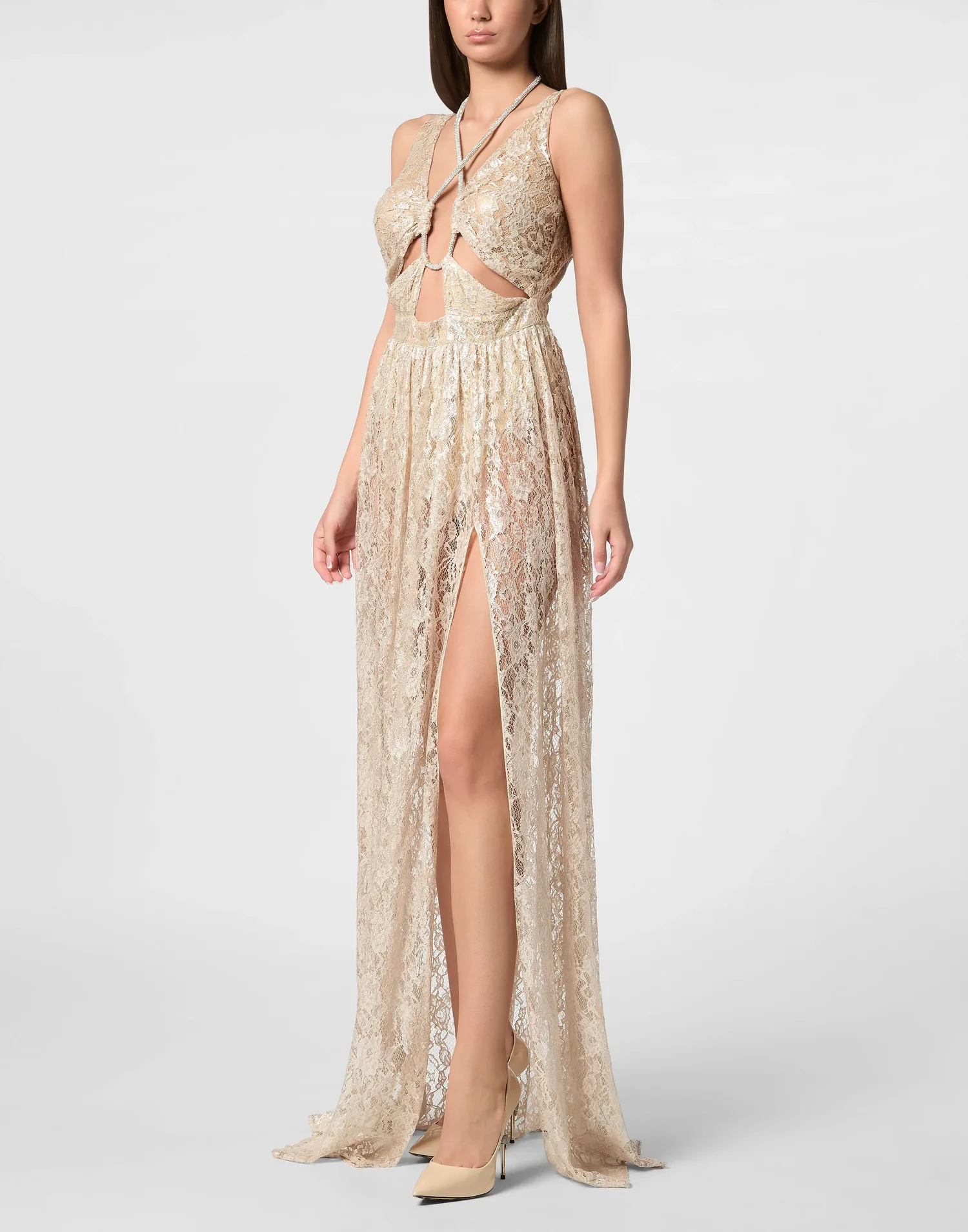 В этом изысканном кружевном длинном платье, созданном для того, чтобы очаровывать на любом торжественном мероприятии, элегантность сочетается с дерзкой утонченностью.