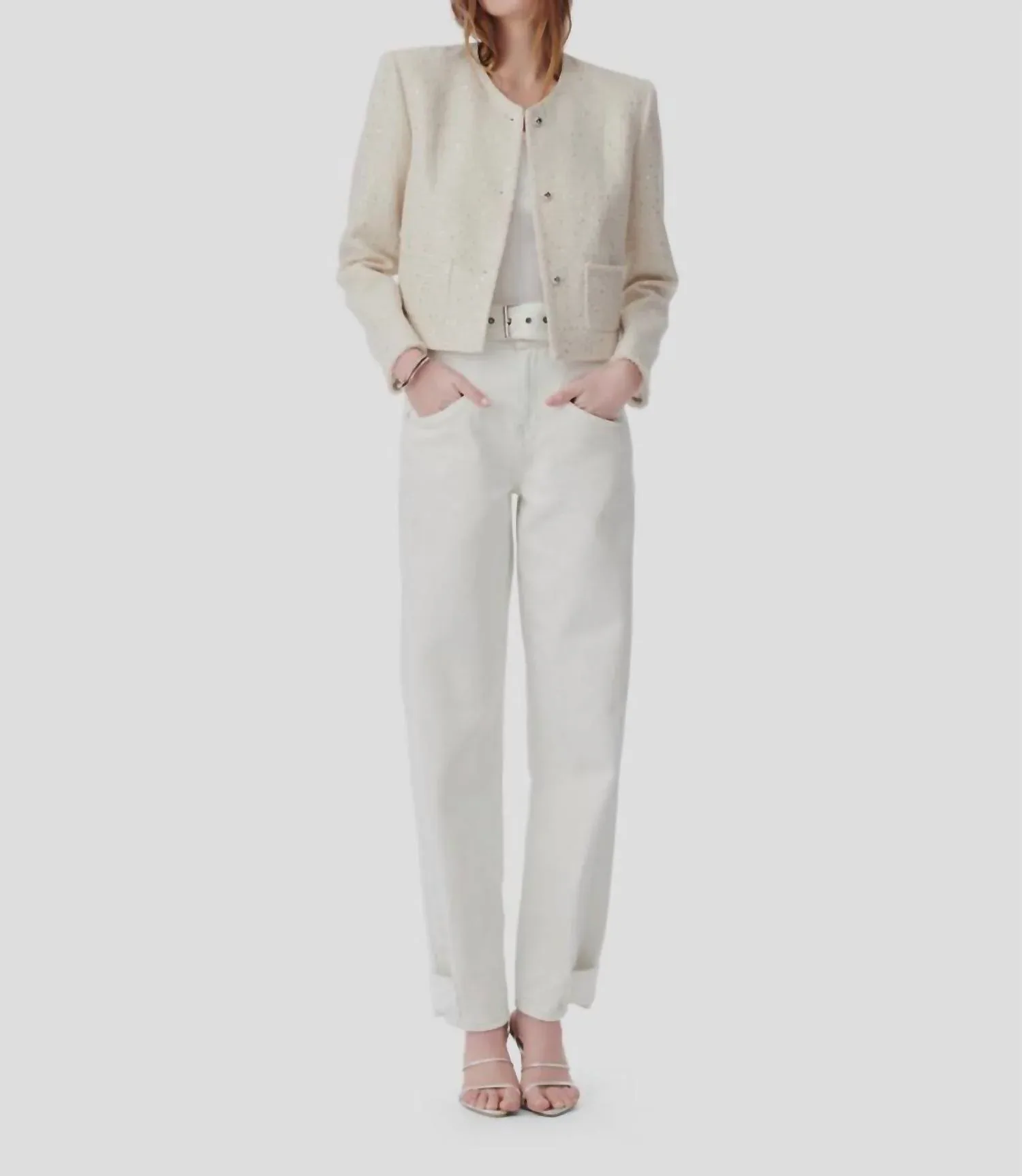 Усовершенствованная версия вашего любимого классического блейзера. Представляем жакет Qaranne от IRO - шикарное дополнение к любому гардеробу, выполненное в изысканном кремовом оттенке. Этот жакет с длинными рукавами искусно сшит из полиэстера, демонстрируя фактурный твидовый узор, украшенный пайетками для дополнительного гламура. Он имеет практичные карманы и классический круглый вырез горловины, застегивающийся на пуговицы. Идеальный для придания элегантности образу, этот блейзер добавит нотку роскоши вашему стилю.