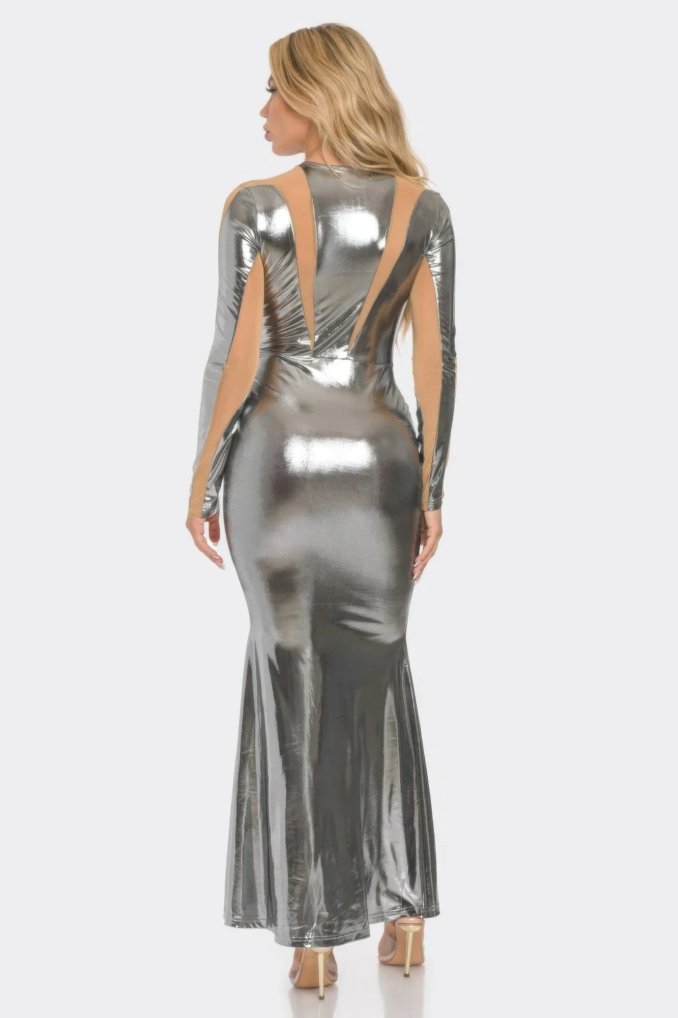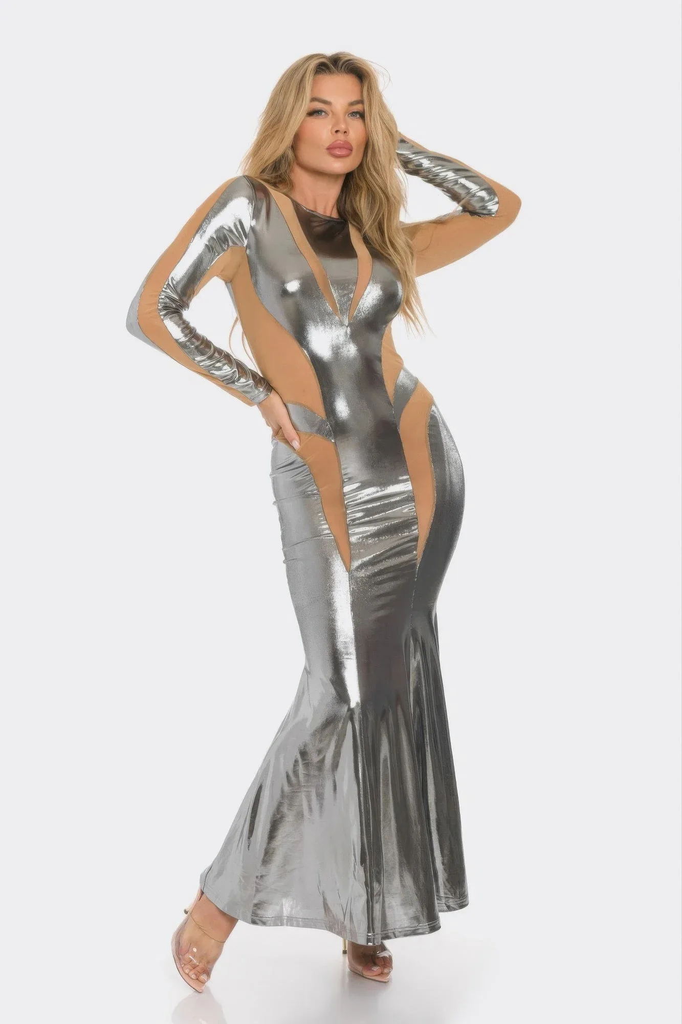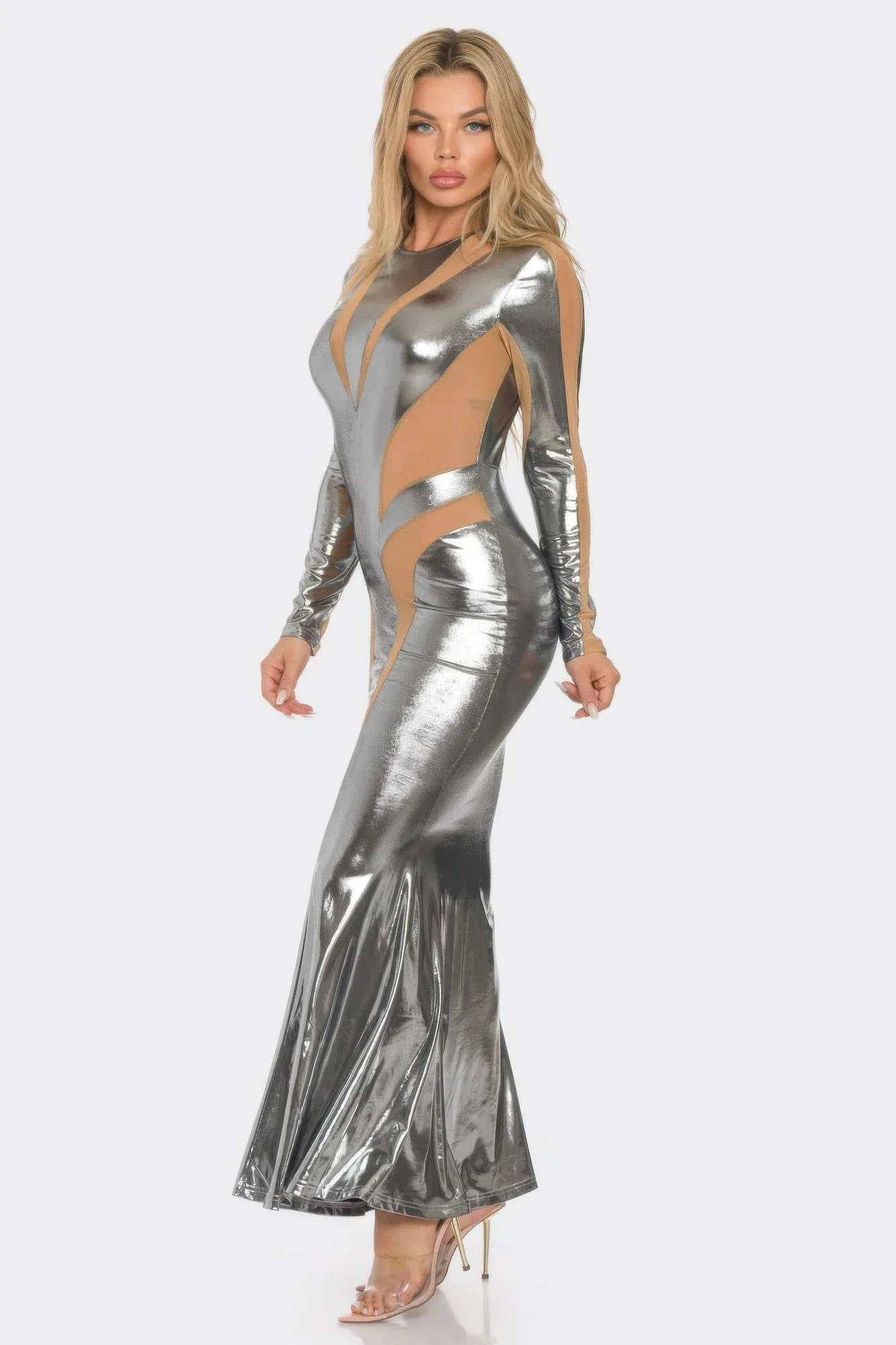 Эффектное и смелое, это макси-платье из сетчатой ткани с вырезами привнесет дерзкую элегантность в любой вечерний образ. Длинные рукава и облегающий силуэт, оно выполнено из прозрачной сетчатой ткани с эффектными вырезами, которые подчеркивают его соблазнительную привлекательность. Расклешенный подол добавляет изящества, а металлизированная отделка создает сияющий, блестящий эффект. Изготовленное из эластичной полиэстеровой ткани, это платье движется вместе с вами, сохраняя при этом гладкий, структурированный силуэт. Идеально подходит для изысканных вечеринок или торжественных мероприятий, оно станет настоящим украшением вечера.