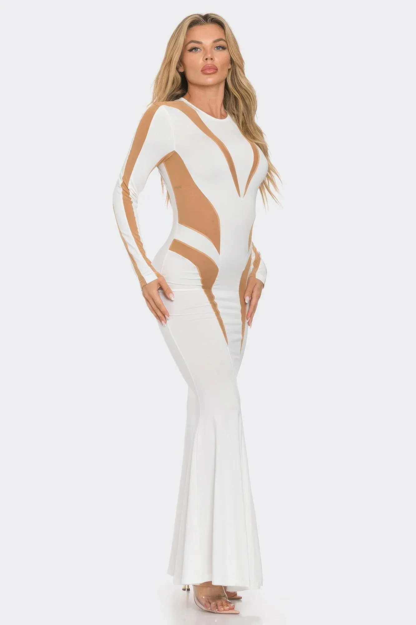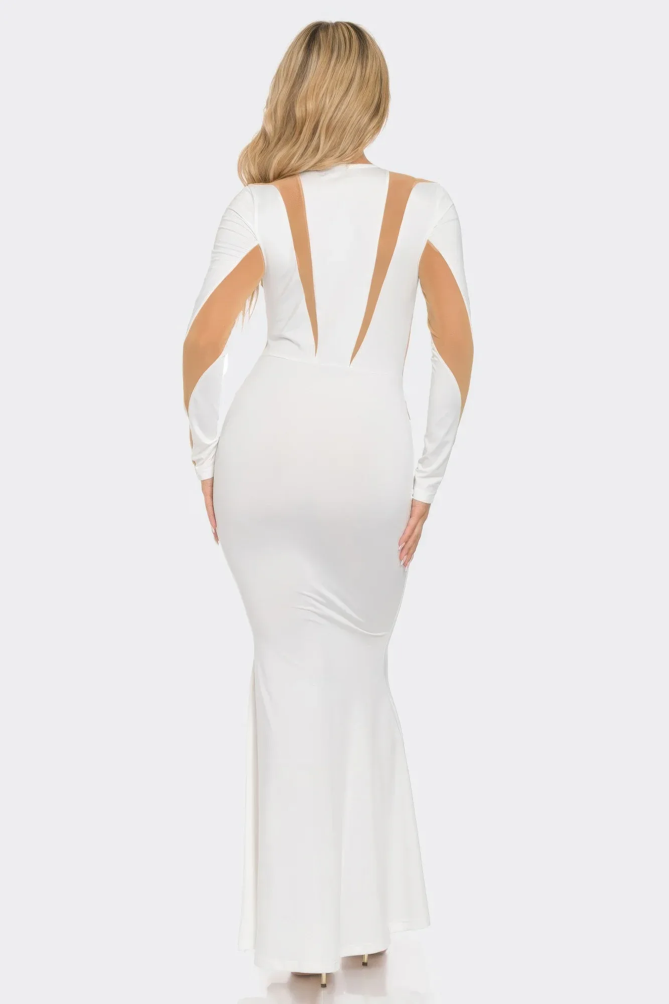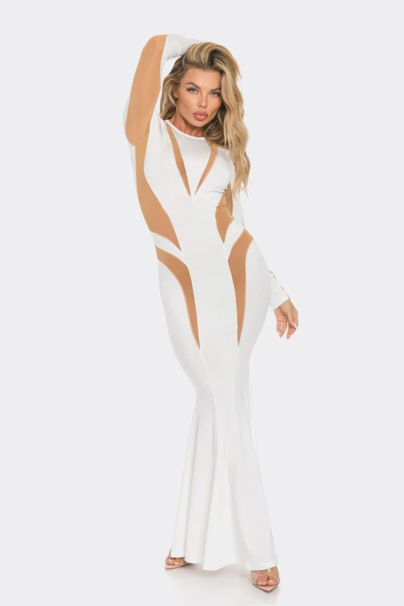 Подчеркните свой вечерний образ этим длинным платьем с сетчатыми вставками и вырезами, созданным для того, чтобы произвести яркое впечатление благодаря изысканному стилю. Силуэт с длинными рукавами, украшенный прозрачными сетчатыми вставками и смелыми вырезами, сочетает в себе очарование и утонченность. Расклешенный подол добавляет движения и драматизма, а металлизированная отделка создает блестящий, гламурный эффект. Изготовленное из гладкой, эластичной смеси полиэстера и спандекса, платье прекрасно облегает фигуру, обеспечивая комфорт на протяжении всего вечера. Идеально подходит для торжественных мероприятий, вечеринок или эффектных выходов, это платье приковывает внимание со всех сторон.