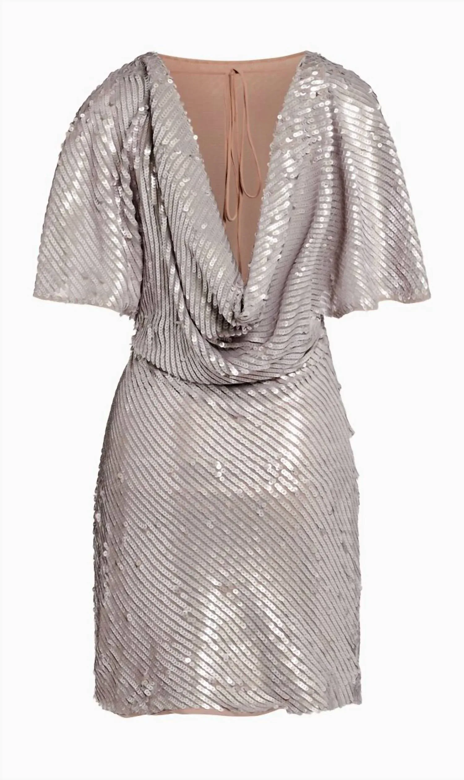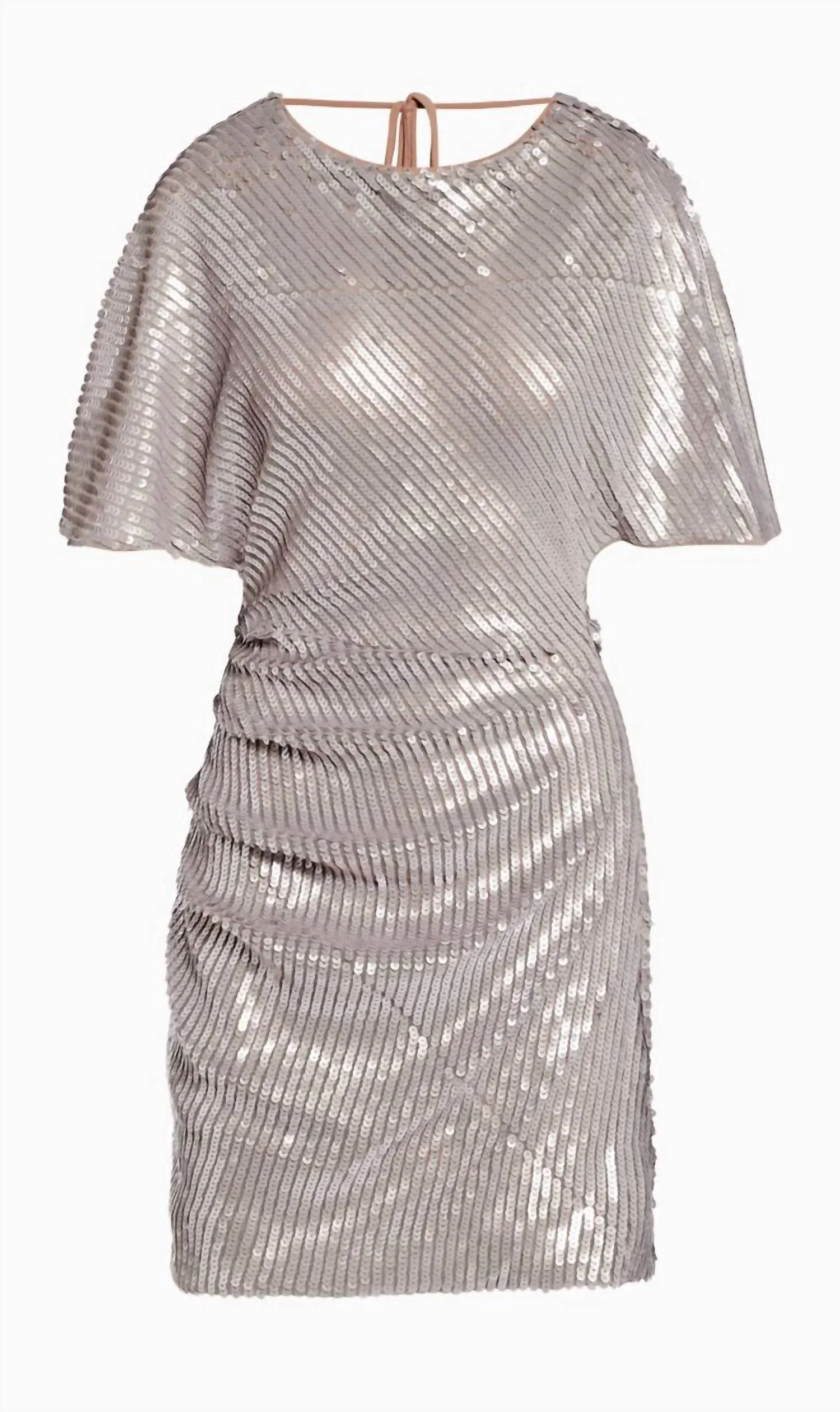 Это мини-платье Hermatite с драпировкой, украшенной пайетками, имеет открытую спину и элегантный силуэт футляра. Изготовленное из 100% полиэстера, оно имеет вырез-лодочку, короткие рукава и облегающую застежку для комфорта и удобства надевания.
