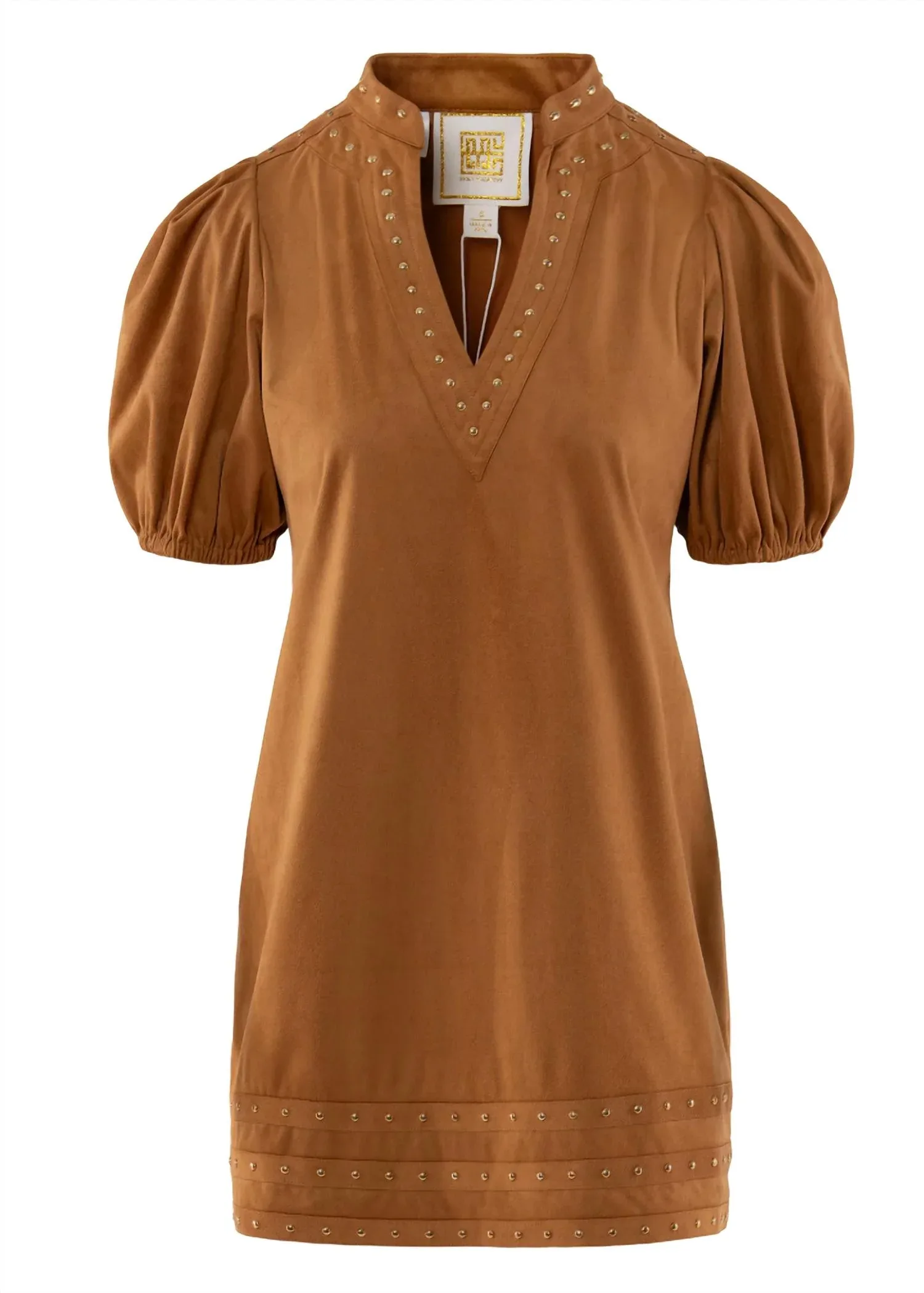 Это легкое и элегантное платье, которое вы будете носить весь сезон. Платье с воротником-стойкой, V-образным вырезом и пышными рукавами сочетает в себе строгий силуэт и непринужденность. Изготовленное из мягкой замши коричневого цвета, оно идеально подходит для этого сезона благодаря своей богатой текстуре. Золотистые заклепки украшают вырез и продолжаются по подолу, придавая этому классическому стилю свежий, современный вид. Состав: 90% полиэстер / 10% спандекс.