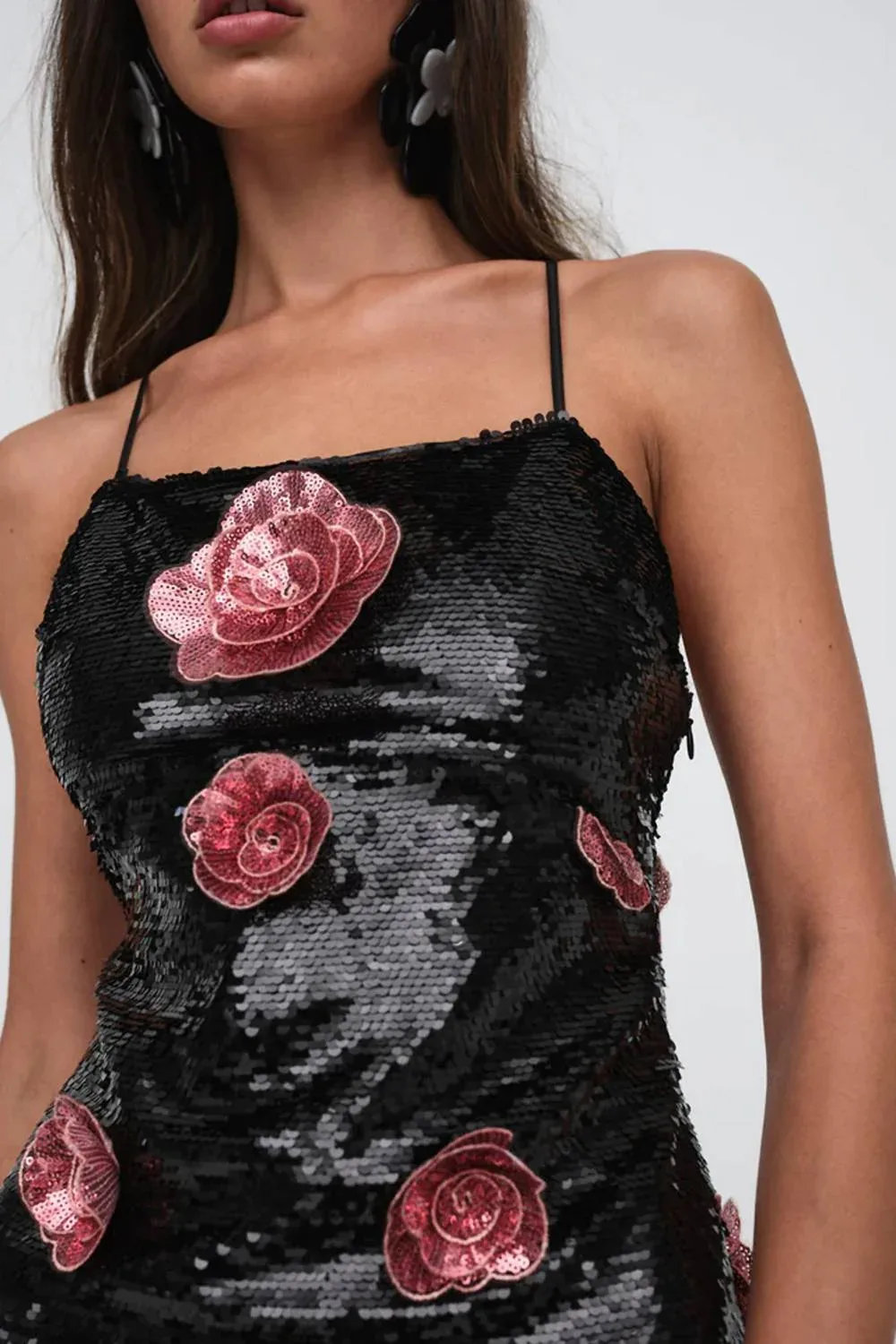 Короткое и воздушное платье для теплых дней. Дополните свой вечерний гардероб мини-платьем Jude от For Love & Lemons - изысканным черным вариантом для создания потрясающего стиля. Платье с тонкими бретелями и шикарным А-образным силуэтом изготовлено из 97% переработанного полиэстера и 3% спандекса, излучая экологичную элегантность. Платье длиной 29,52 дюйма, произведенное в Китае, выполнено из ткани средней плотности, украшенной пайетками и контрастными розочками, что придает ему текстуру и визуальную привлекательность. Застежка - незаметная потайная боковая молния. Для сохранения очарования рекомендуется химчистка.
