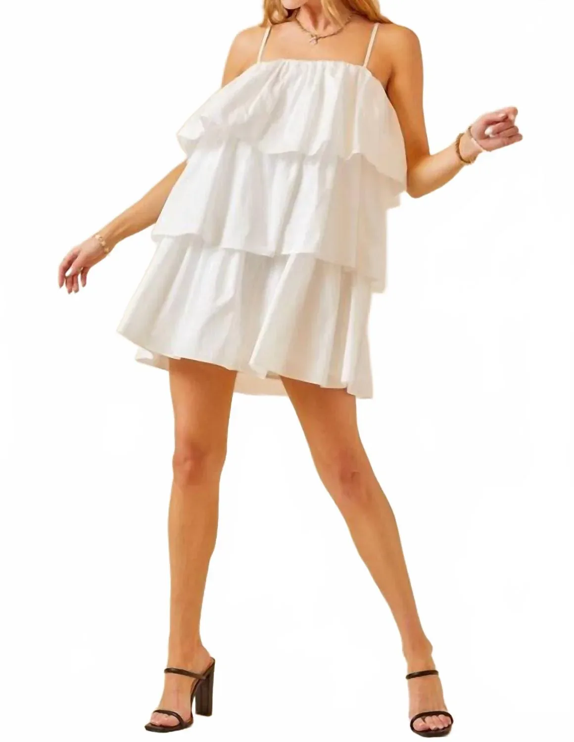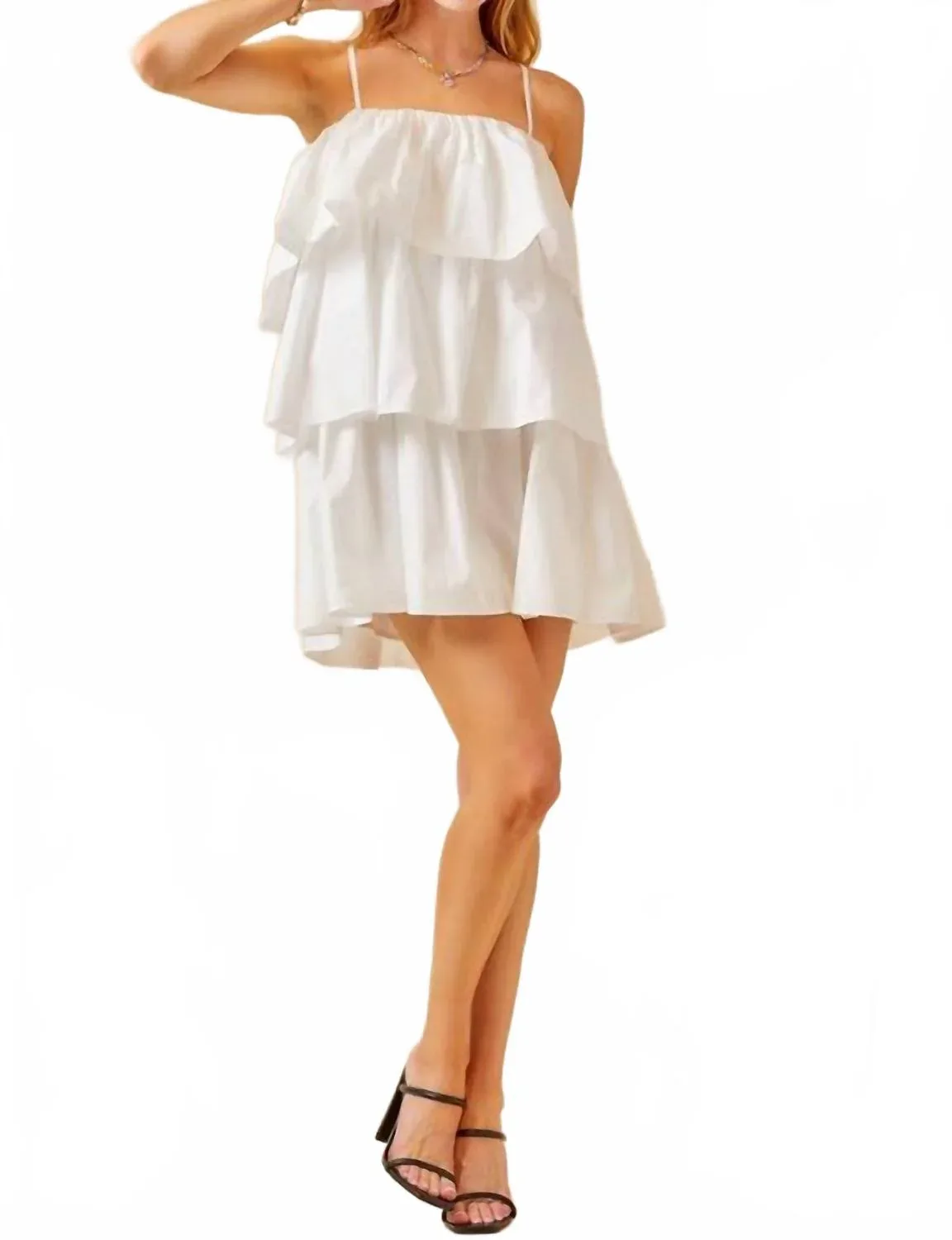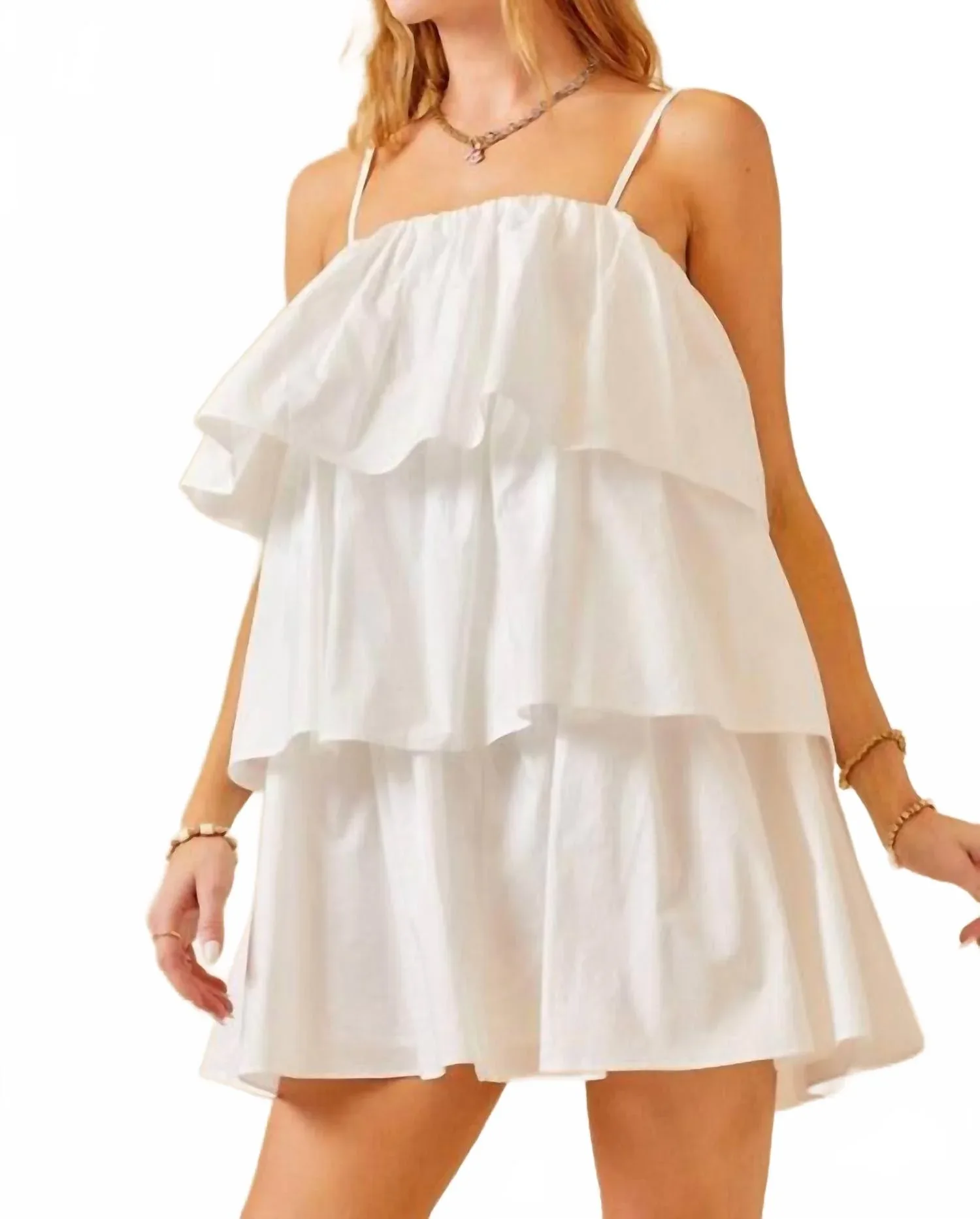Платье, которое будет удобным и выгодно подчеркивать фигуру, и вы будете носить его весь сезон. Представляем мини-платье Ruffles For Days от day + moon - шикарный и модный выбор для вашего весеннего гардероба. Это однотонное белое платье-футляр с элегантными тонкими бретелями и эффектным квадратным вырезом идеально подходит для праздничных вечеринок, включая День благодарения. Изготовленное из мягкого хлопка, оно обеспечивает комфортную посадку, а стильные ярусы с оборками добавляют игривости. Идеально подходит для любителей минималистичной моды, это платье имеет современную застежку-молнию для удобства надевания.
