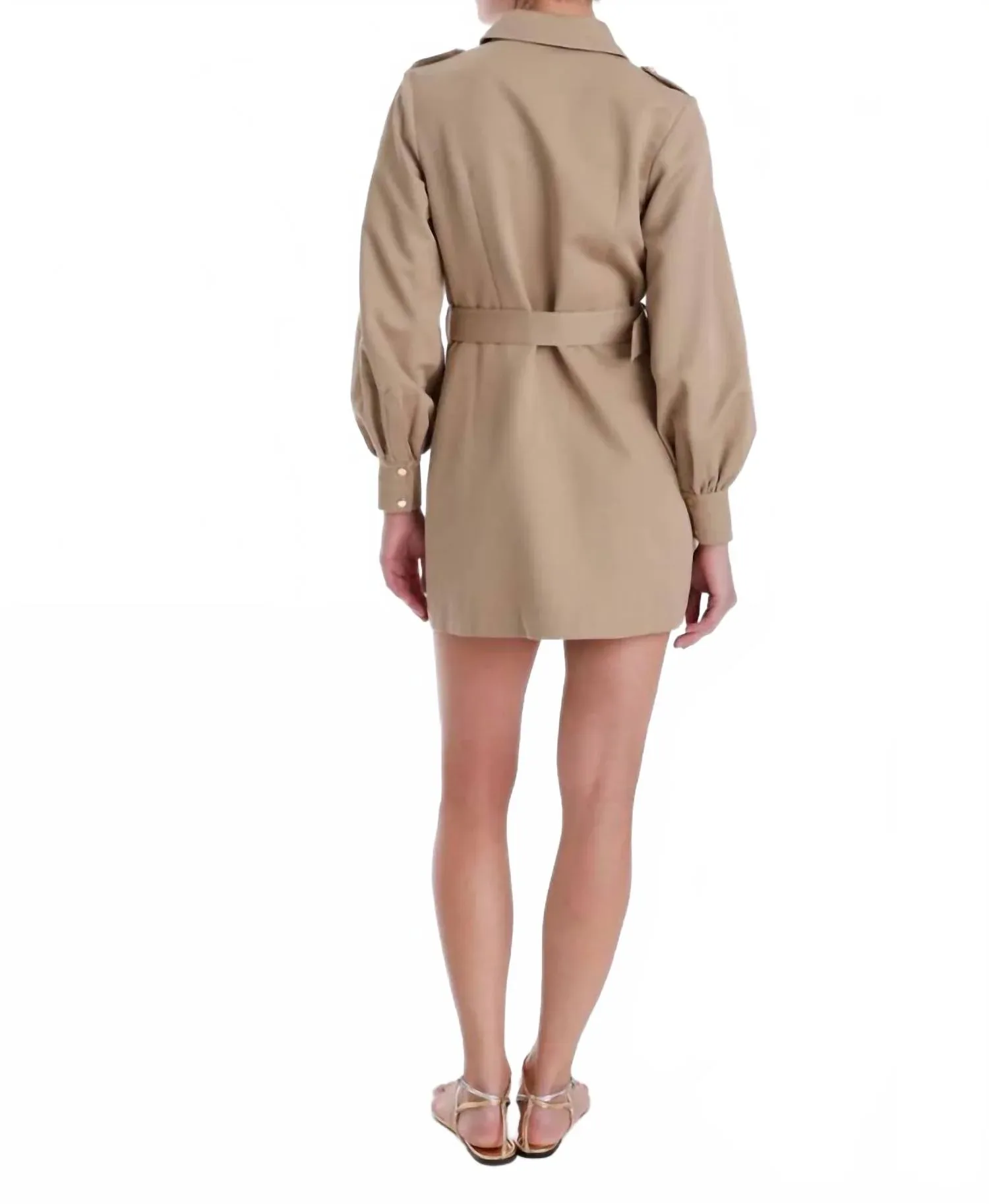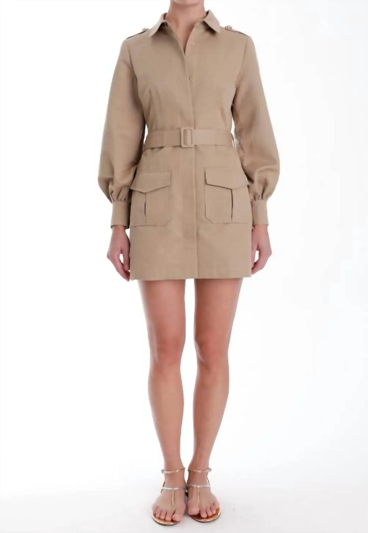 Идеальное мини-платье для теплых месяцев. Представляем мини-платье Tiffany от Karina Grimaldi - шикарную модель изысканного цвета хаки, созданную для современной женщины. Изготовленное из хлопка, это мини-платье имеет силуэт рубашки с длинными рукавами и стильным воротником для элегантного образа. Однотонный крой и универсальный дизайн делают его идеальным для самых разных случаев, от неформальных бранчей до коктейльных вечеринок. Разработанное с учетом функциональности, оно имеет карманы и лучше всего подходит для химчистки.
