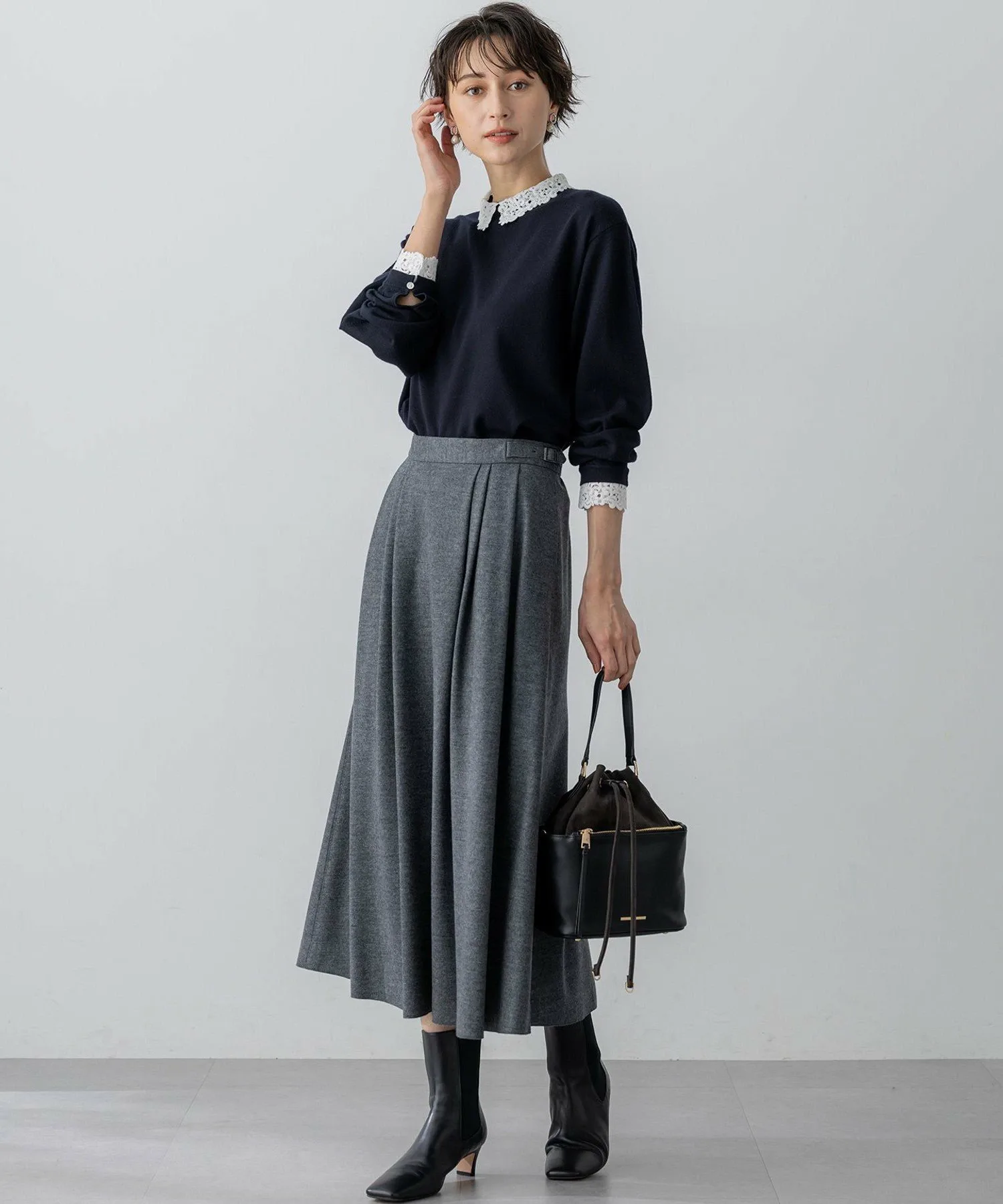 Чрезвычайно популярная вещь из коллекции Pre-Spring 2024 возвращается в новых цветах! Этот трикотажный пуловер украшен великолепным вышитым кружевом на воротнике и манжетах. Его дизайн создает впечатление, будто под ним надет кружевной блузка, что само по себе придает образу гламурность. Пуговицы на вырезе сзади облегчают надевание и снимание. Трикотажная часть выполнена из джерси для обтекаемой посадки. Идеальная длина позволяет легко сочетать его с брюками или юбками, что делает его чрезвычайно универсальным. Доступен в трех цветах: шикарный черный (#005), темно-синий (#075) и спокойный серый (#004).
