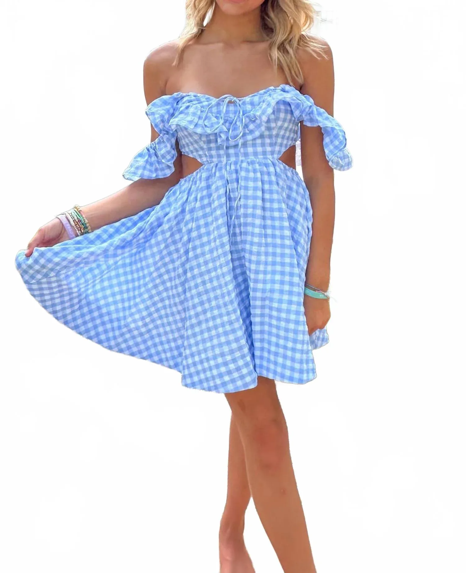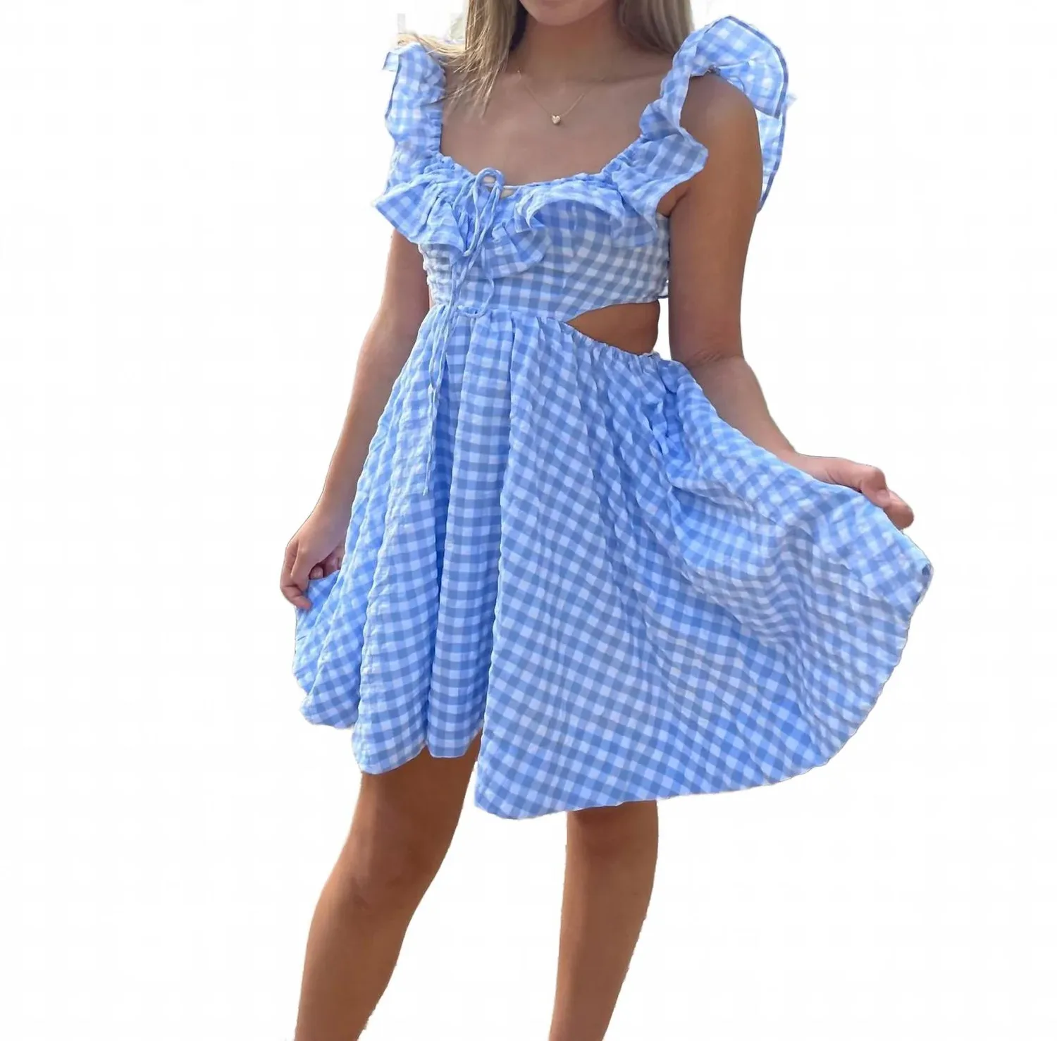 Легкое и элегантное платье, которое вы будете носить весь сезон. Представляем мини-платье Sweetheart от MABLE - очаровательное дополнение к вашему весеннему гардеробу, идеально подходящее для праздничных вечеринок. Это синее платье в клетку имеет открытый вырез с оборками и не имеет рукавов, что придает ему женственный вид. Изготовленное из хлопковой смеси, это мини-платье в винтажном стиле демонстрирует А-образный силуэт с вырезами по бокам и на спине. Платье застегивается на резинку и идеально подходит для особого наряда на День благодарения.
