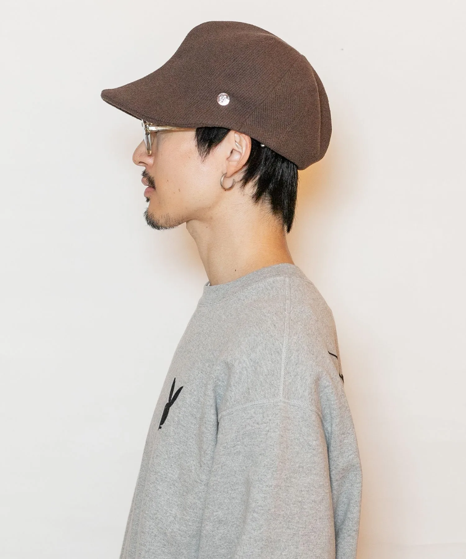 Это уникальная модель, сочетающая в себе элементы шляпы-тюльпана и кепки-газетчицы. Значок сбоку добавляет акцент.
