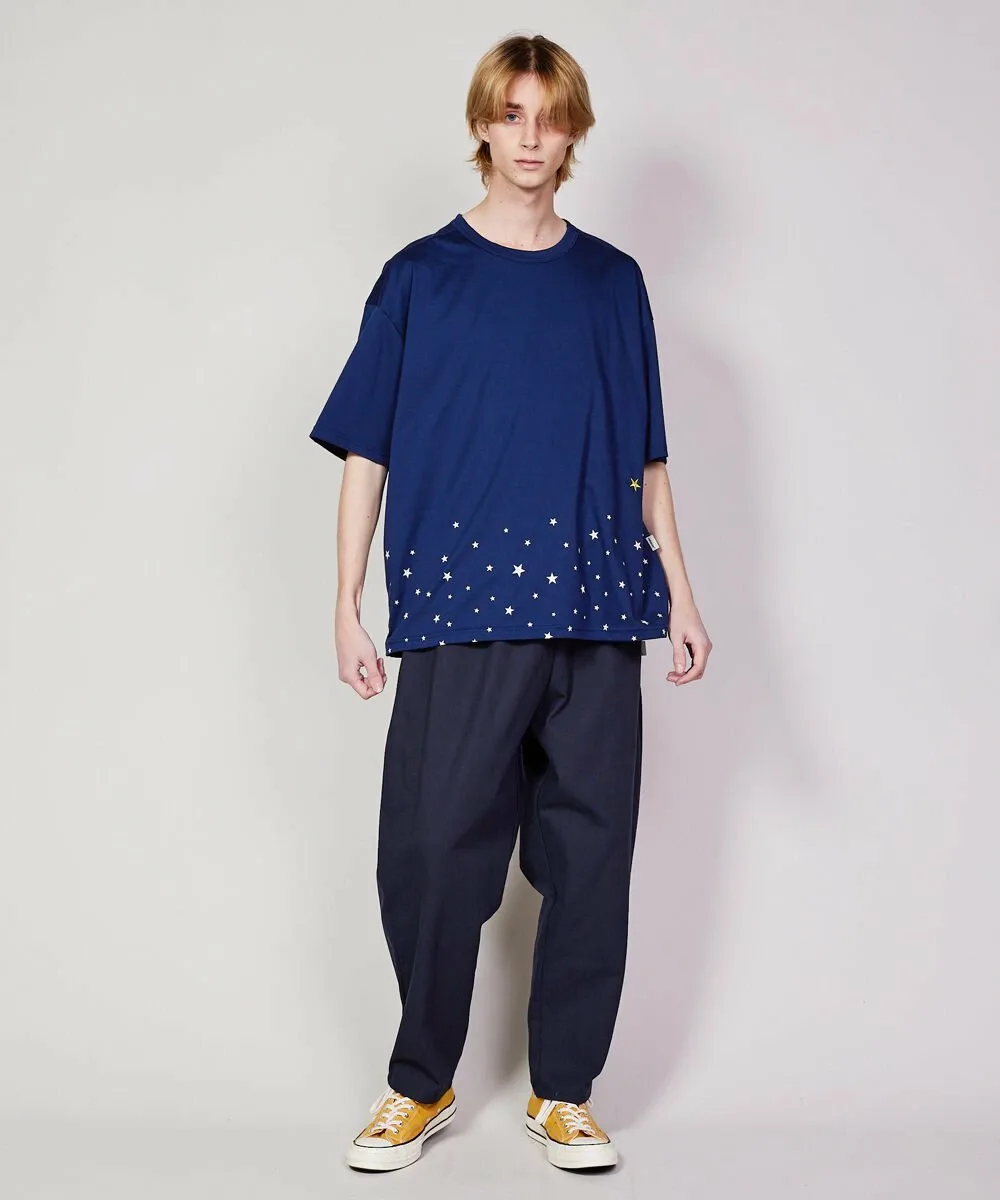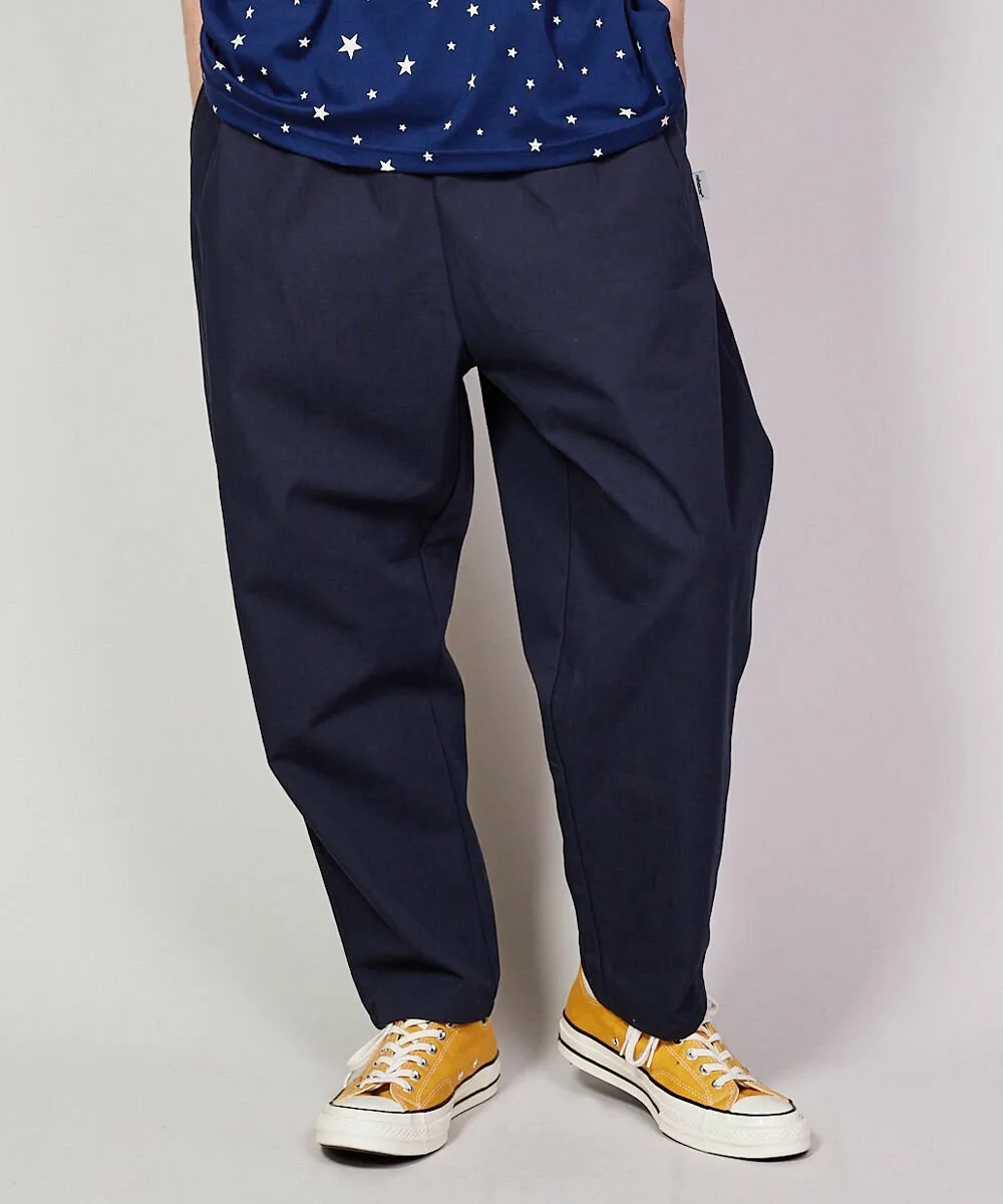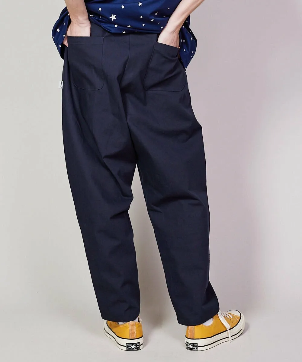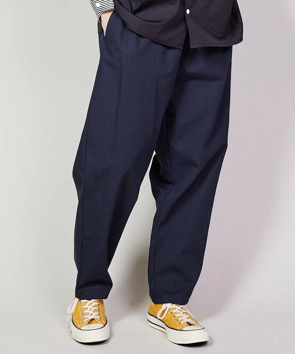Силуэт имеет глубокую посадку, и хотя в области бедер и ягодиц есть достаточно места, он изящно сужается, создавая широкий силуэт, который, тем не менее, производит впечатление элегантности.