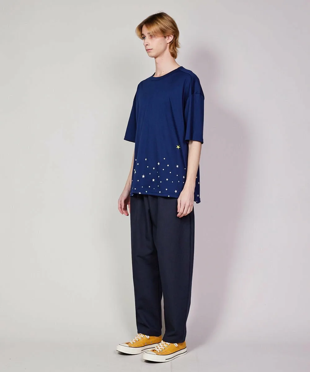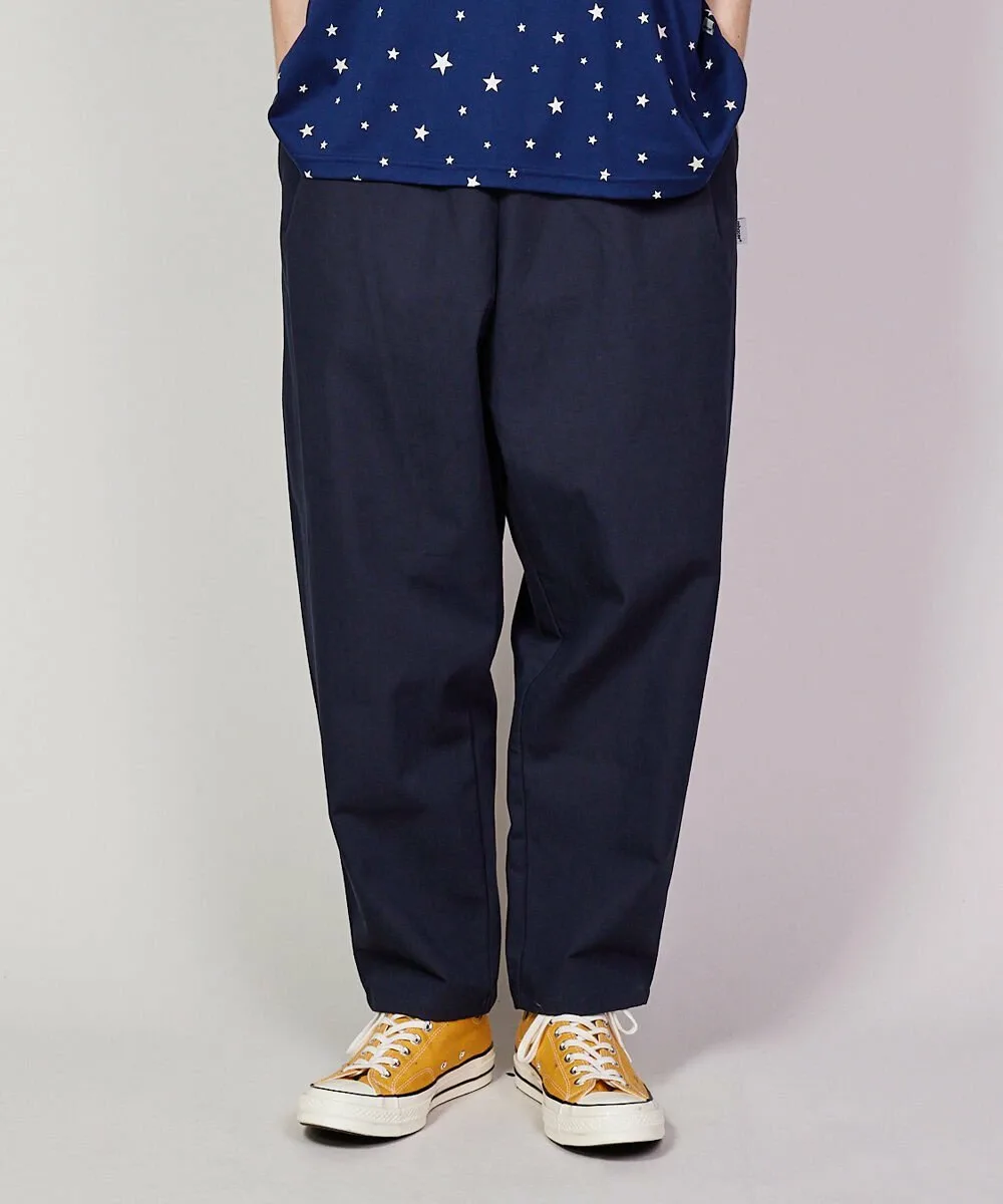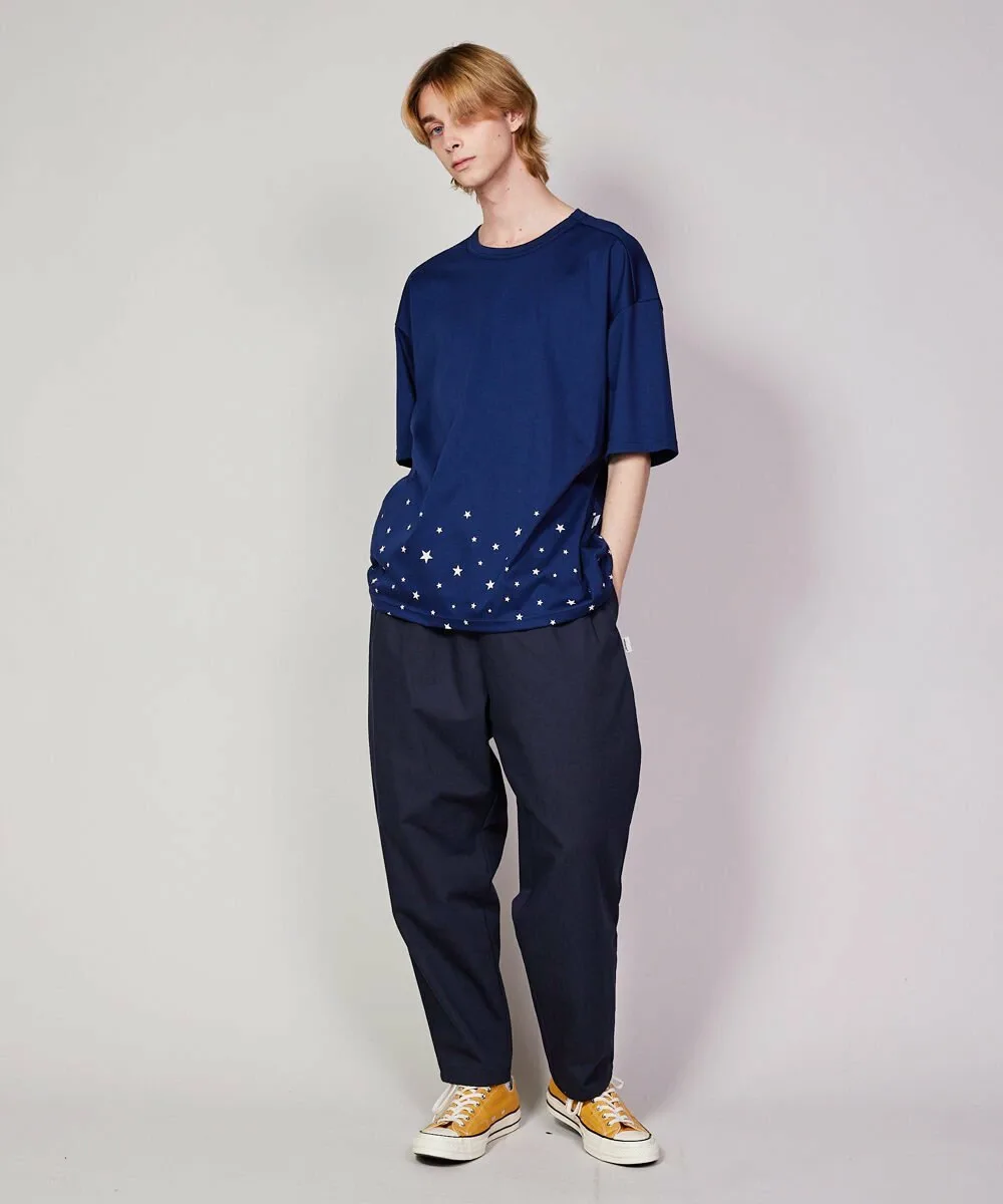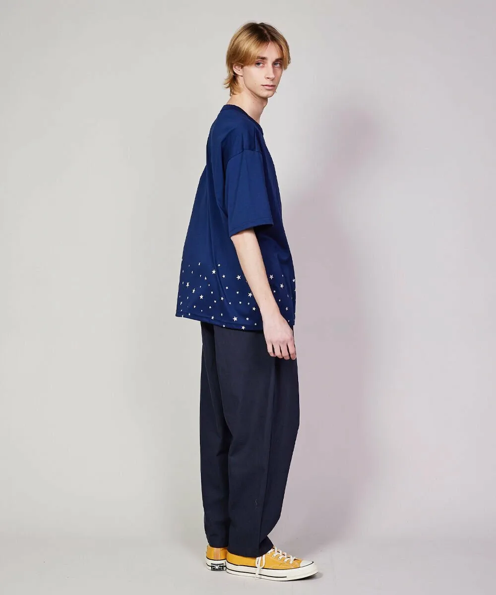 Силуэт имеет глубокую посадку, и хотя в области бедер и ягодиц есть достаточно места, он изящно сужается, создавая широкий силуэт, который, тем не менее, производит впечатление элегантности.