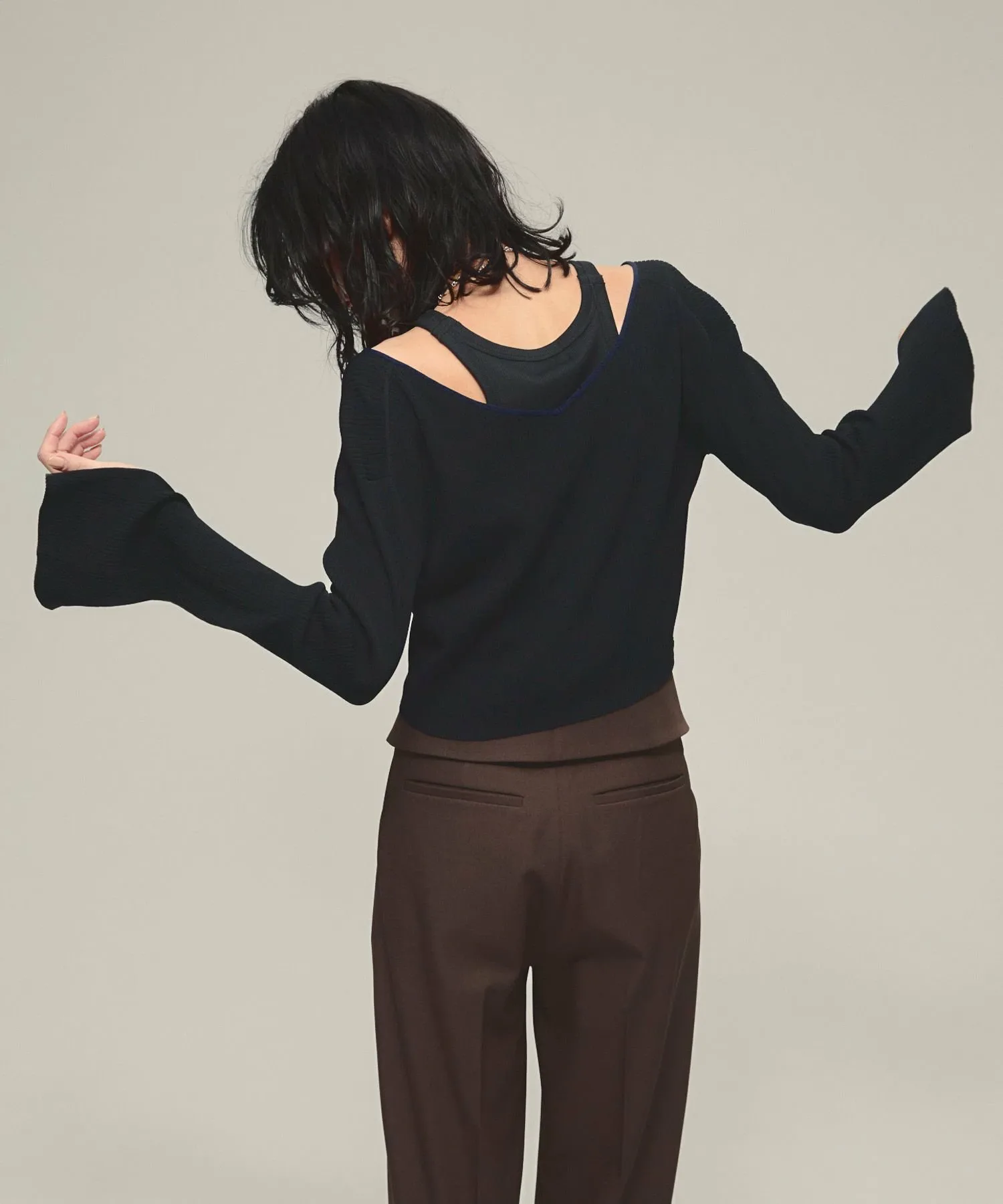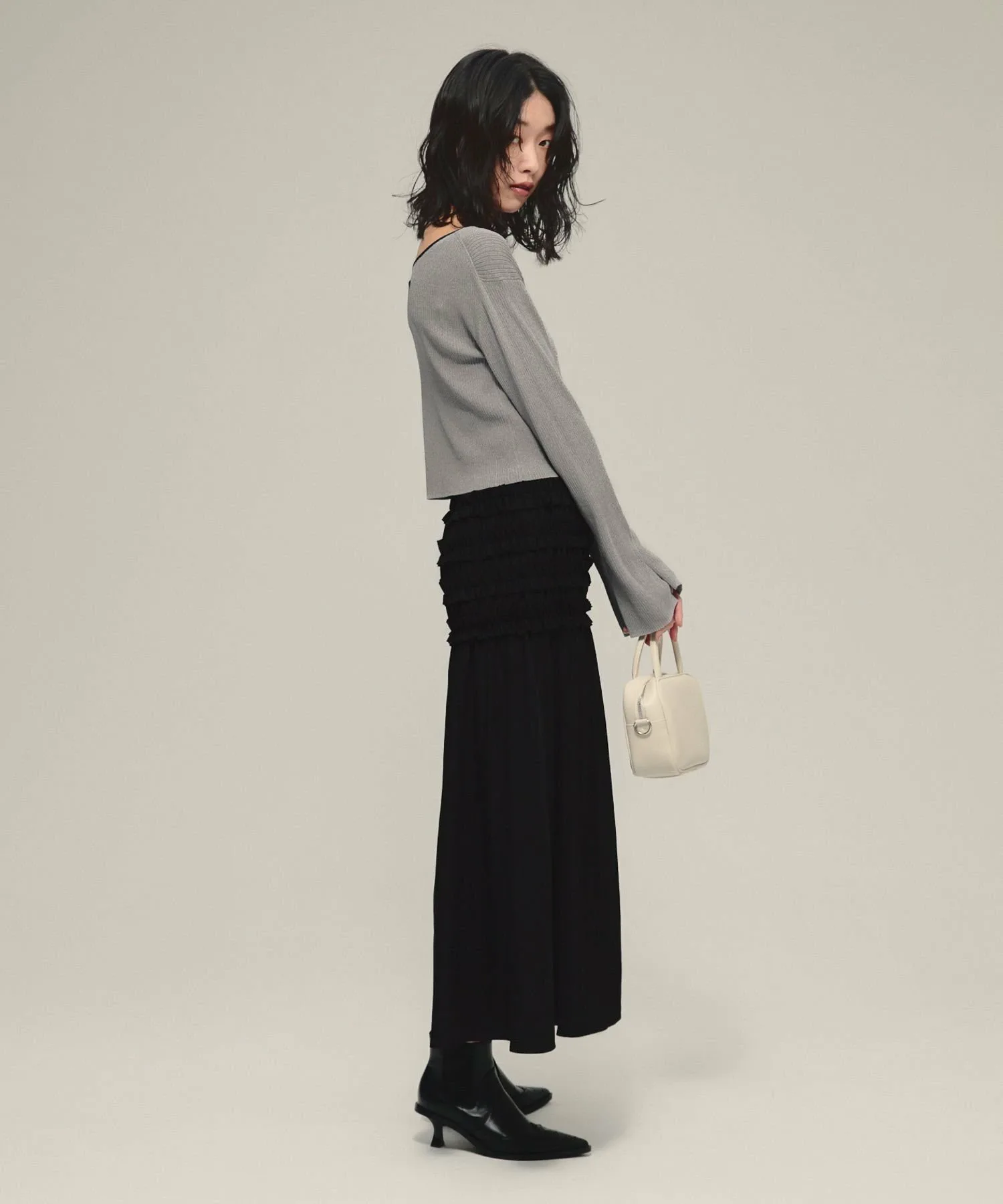 Эта модель выполнена из драпированного материала и имеет глубокий V-образный вырез для создания женственного силуэта.