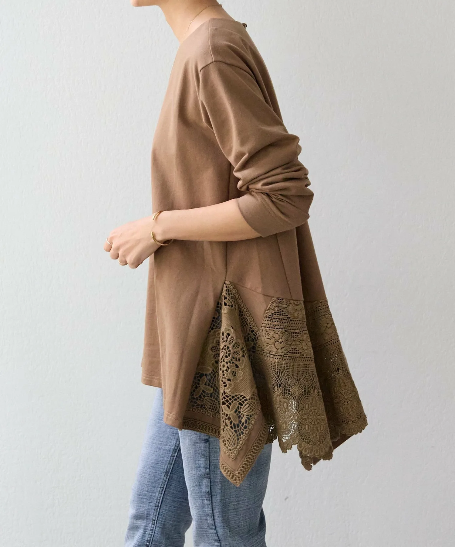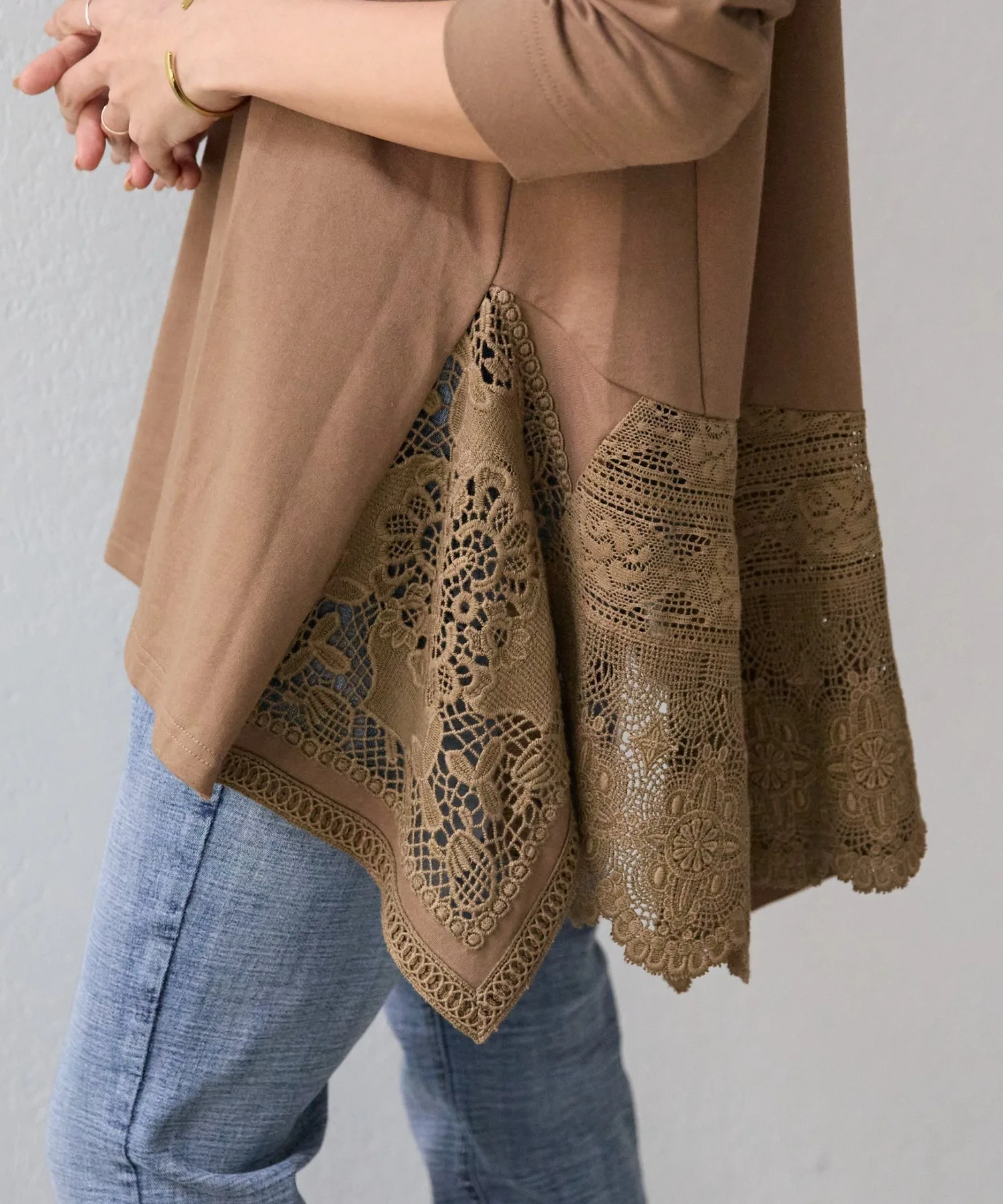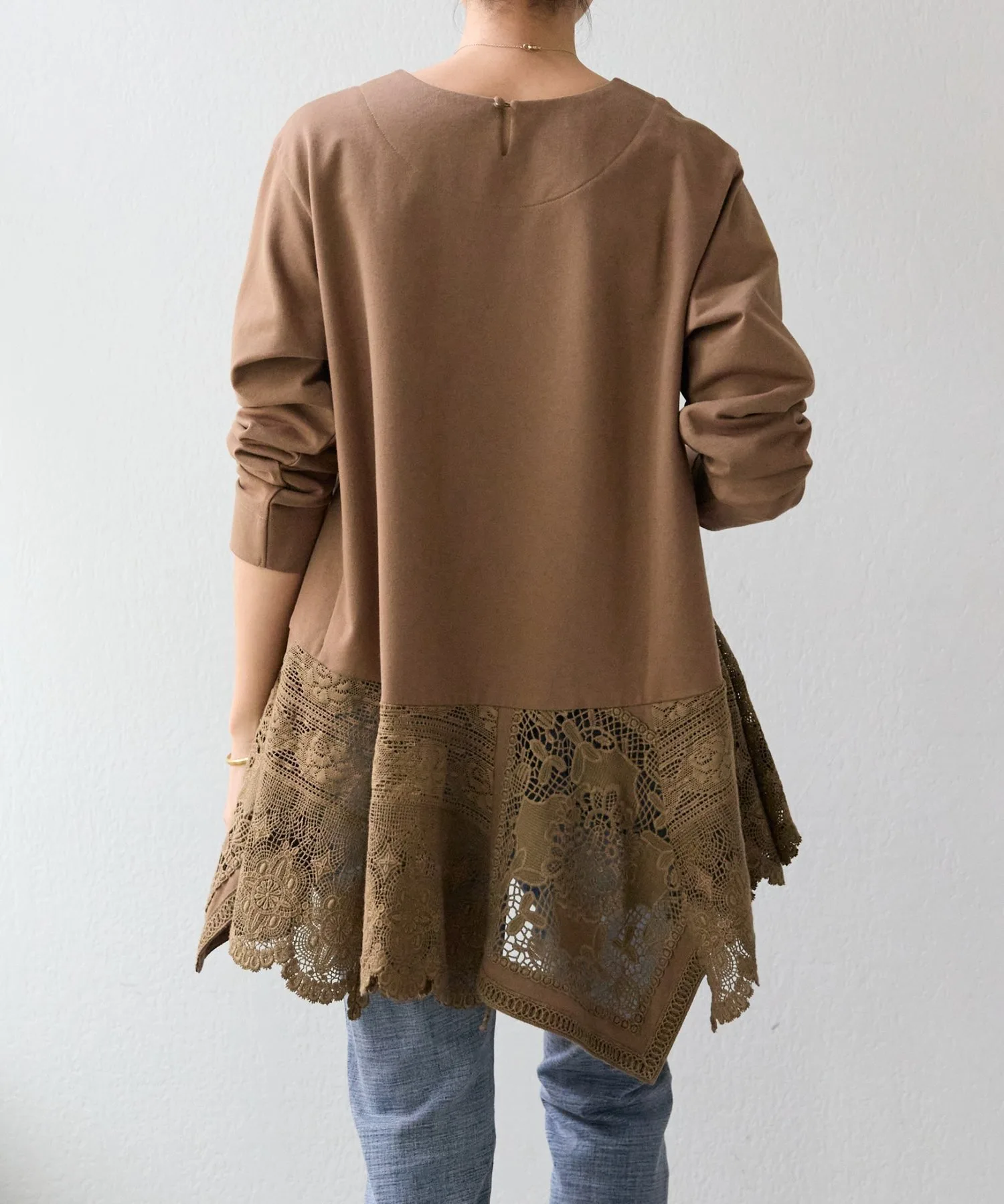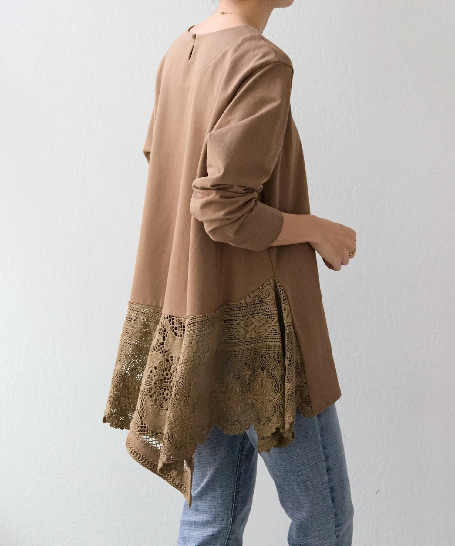 Она имеет длину туники и простой вид, но широкое хлопковое кружево по нижнему краю сзади делает ее впечатляющей вещью.