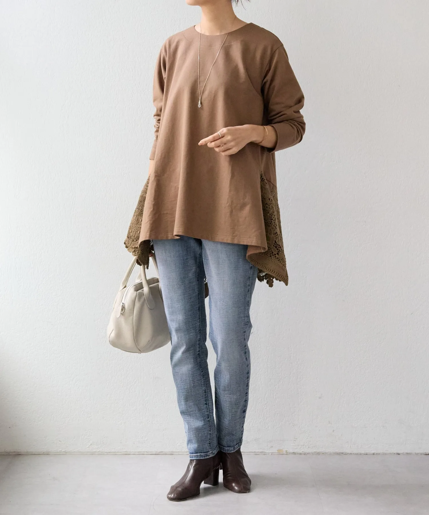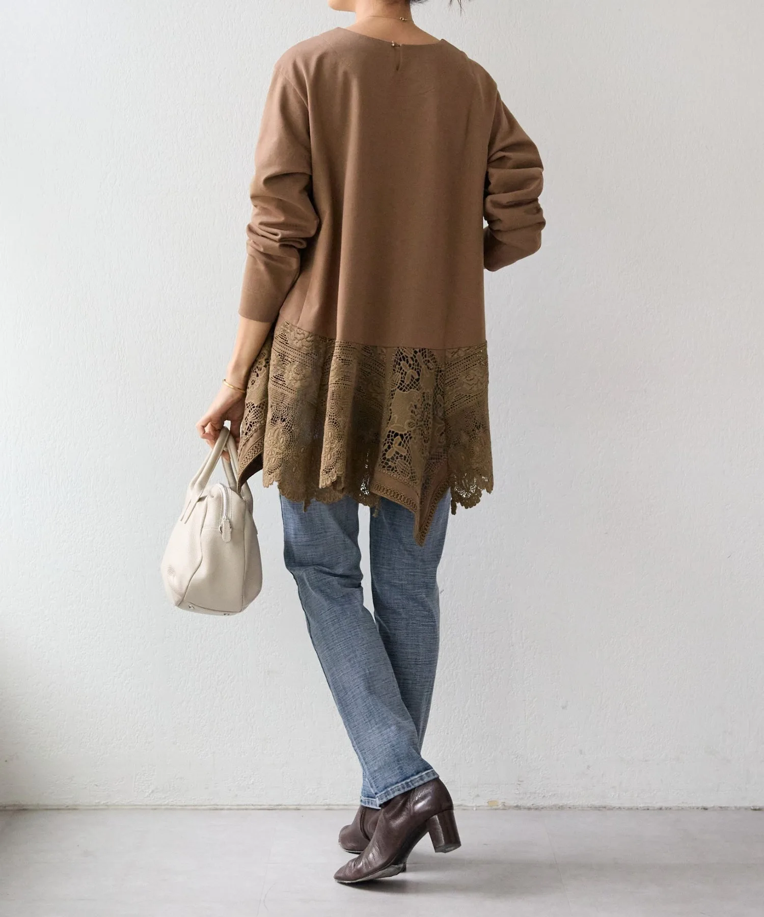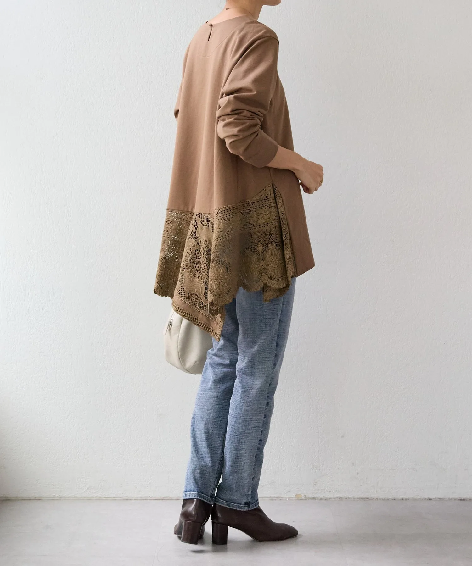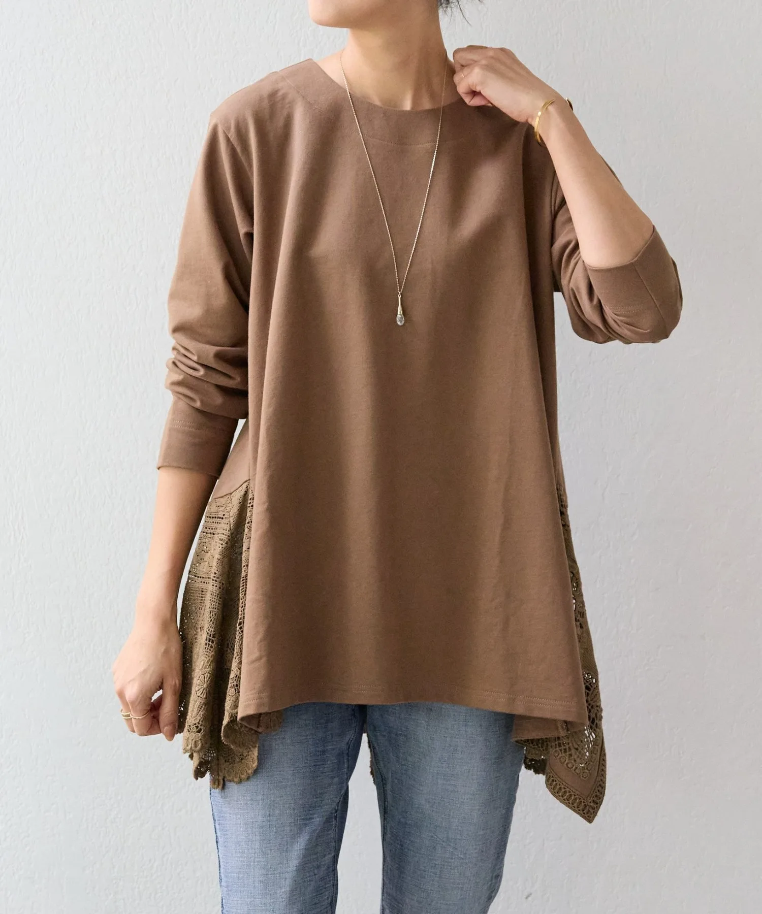 Она имеет длину туники и простой вид, но широкое хлопковое кружево по нижнему краю сзади делает ее впечатляющей вещью.