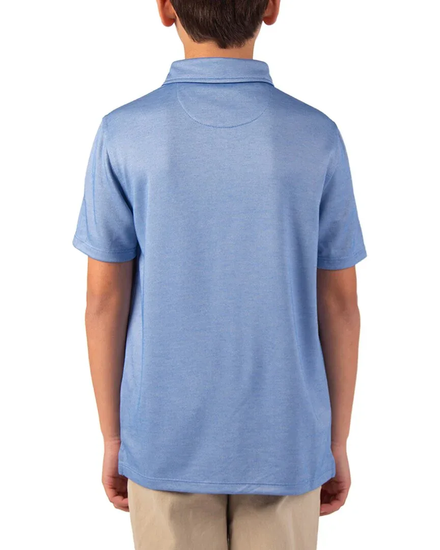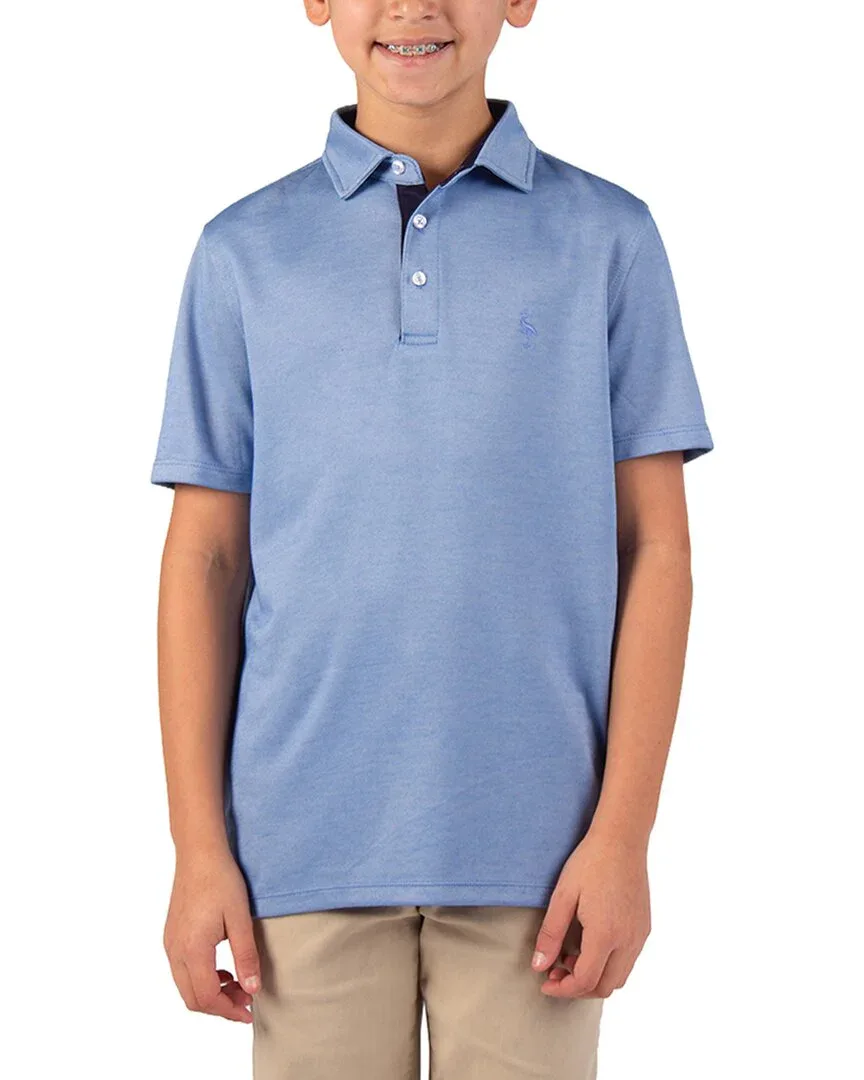 • Однотонная рубашка-поло синего цвета, современный крой, контрастная отделка, отложной воротник, короткие открытые рукава.