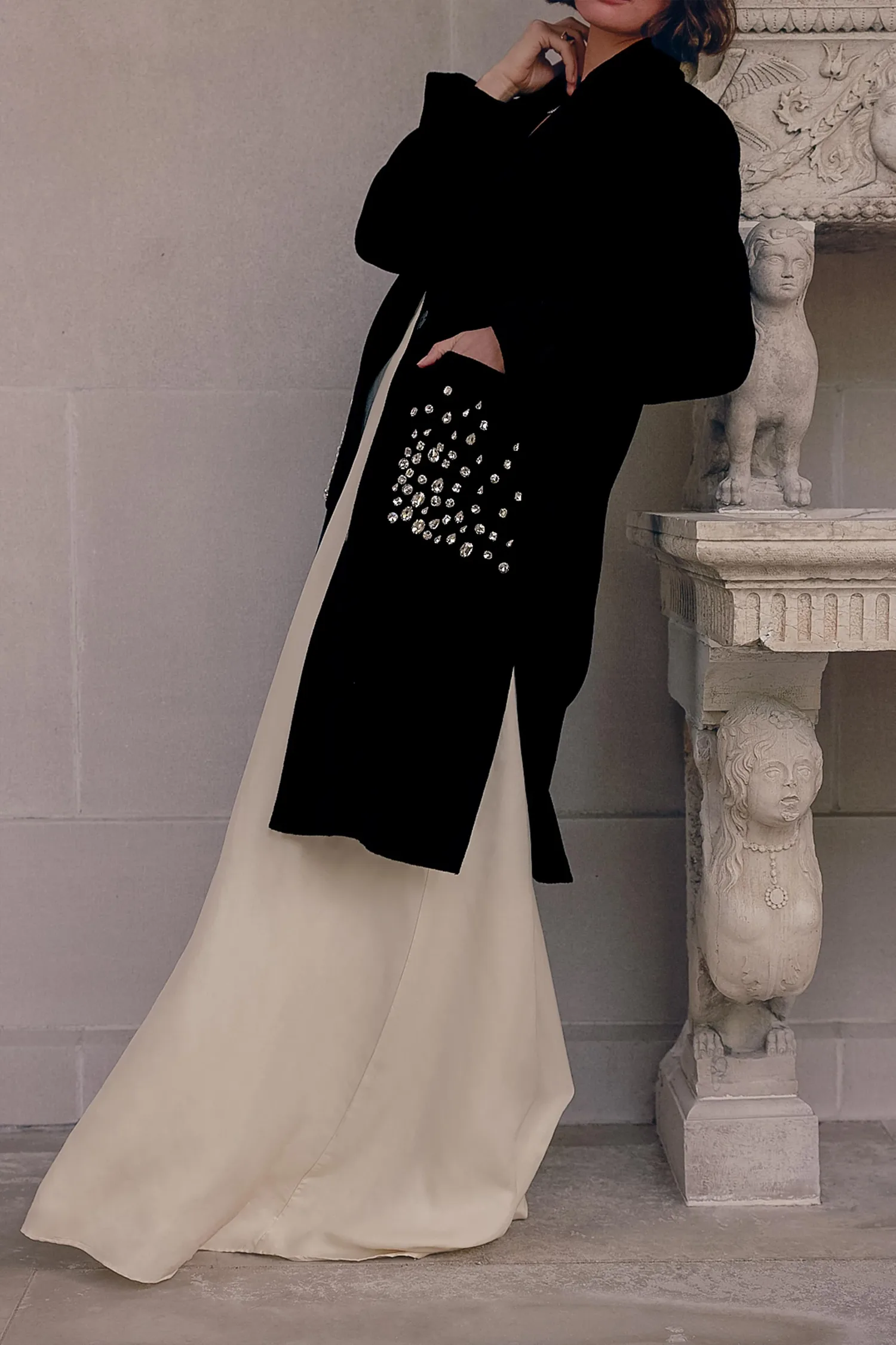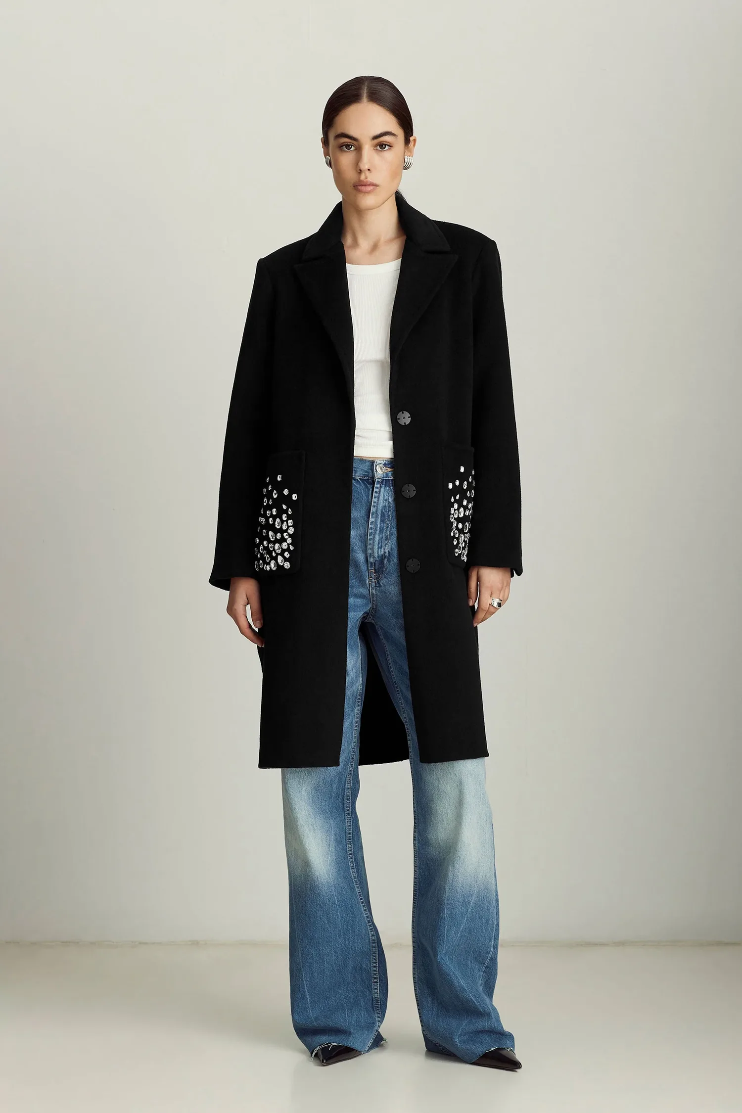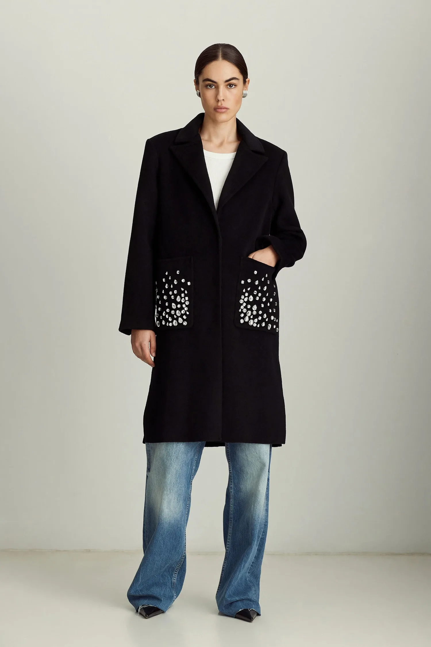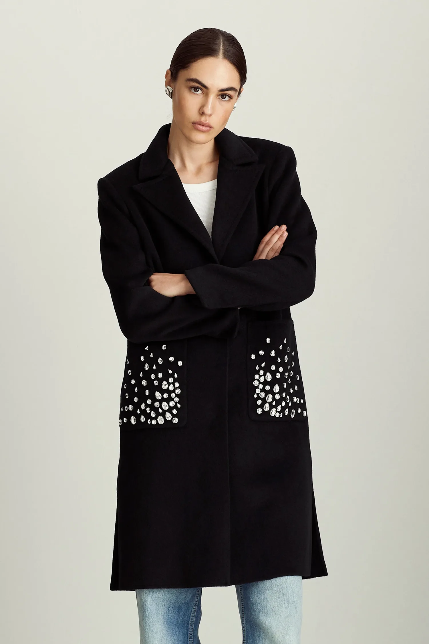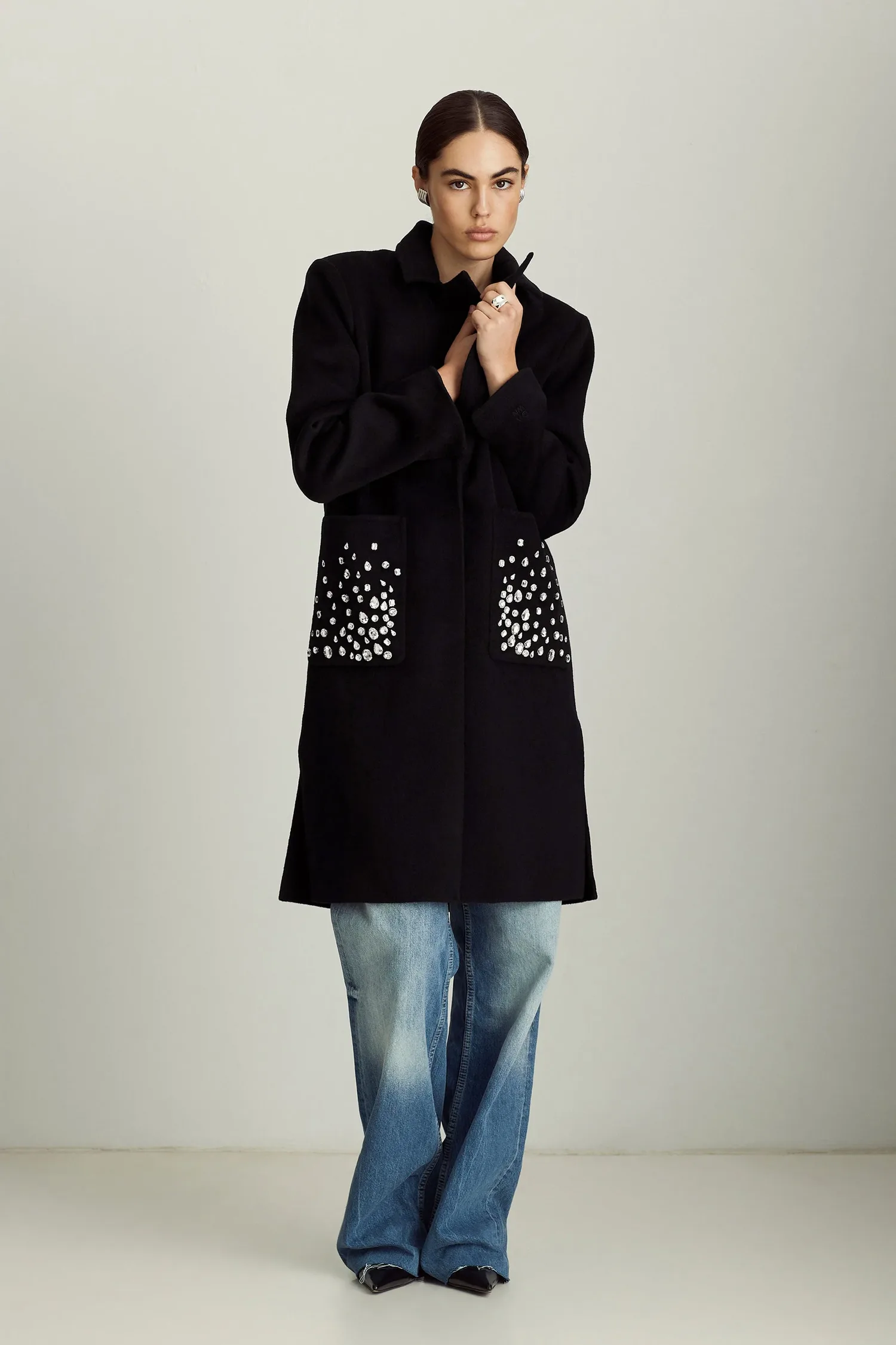 Пальто Colette из двусторонней шерсти, доступное в нейтральном черном, минималистичном миндальном, прохладном синем или ярком розовом цветах, создано для того, чтобы подходить к различным стилям и случаям. Кристаллы вручную пришиты к каждому карману, дополняя свободный крой и практичные кнопки.