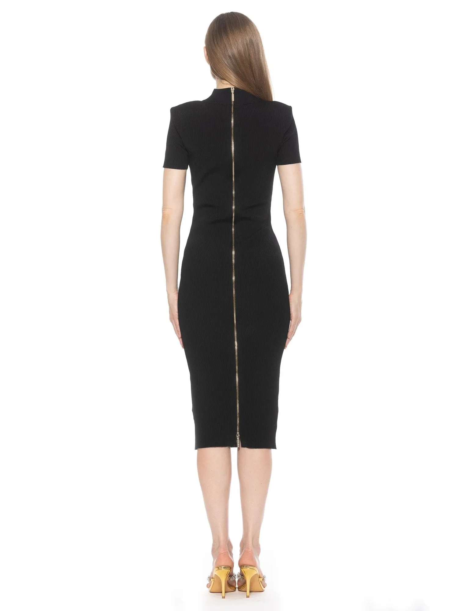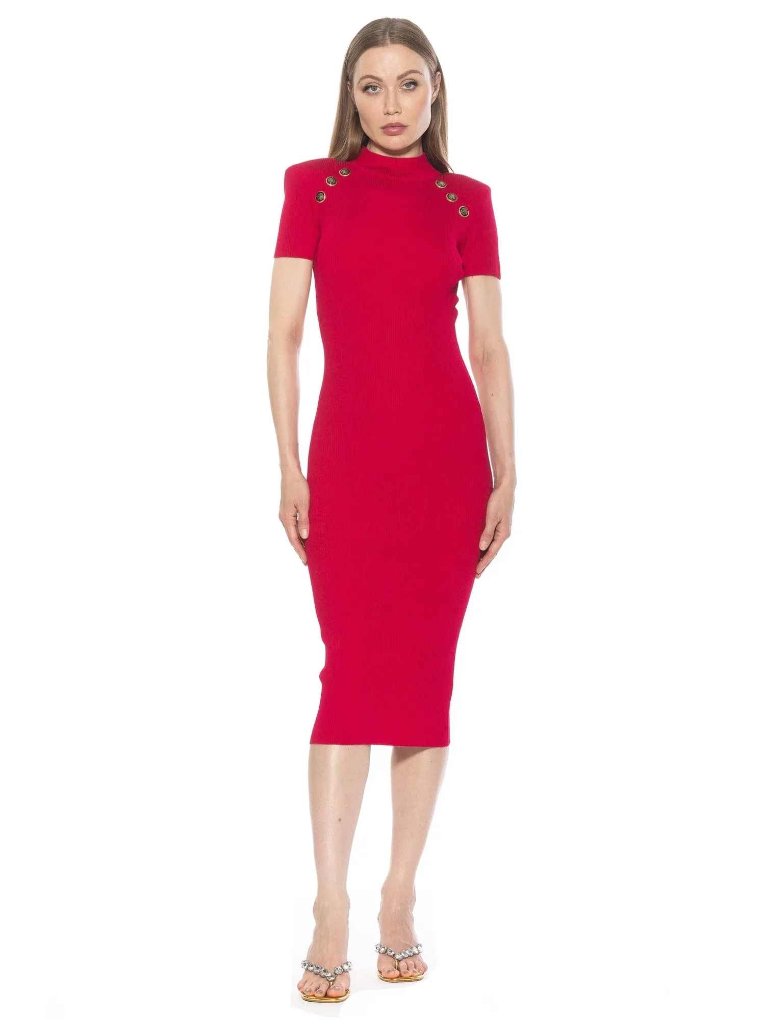 Погрузитесь в элегантность с платьем Adara. Это потрясающее трикотажное платье миди с изысканным воротником-стойкой и нежными короткими рукавами идеально подойдет для любого случая. Украшенное изысканными золотыми пуговицами, это платье непременно привлечет внимание и подчеркнет ваш стиль.
