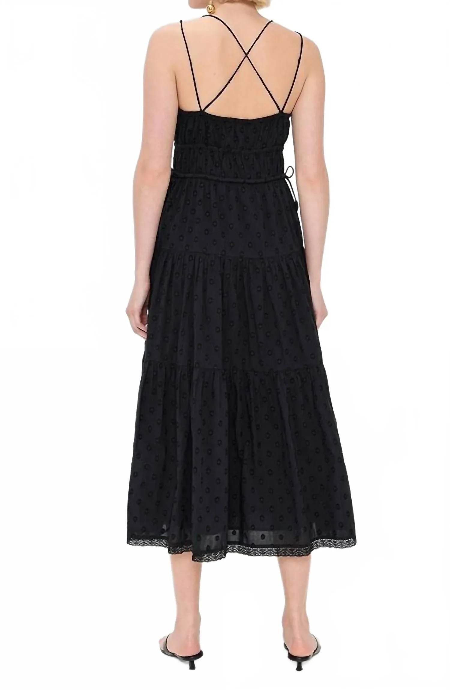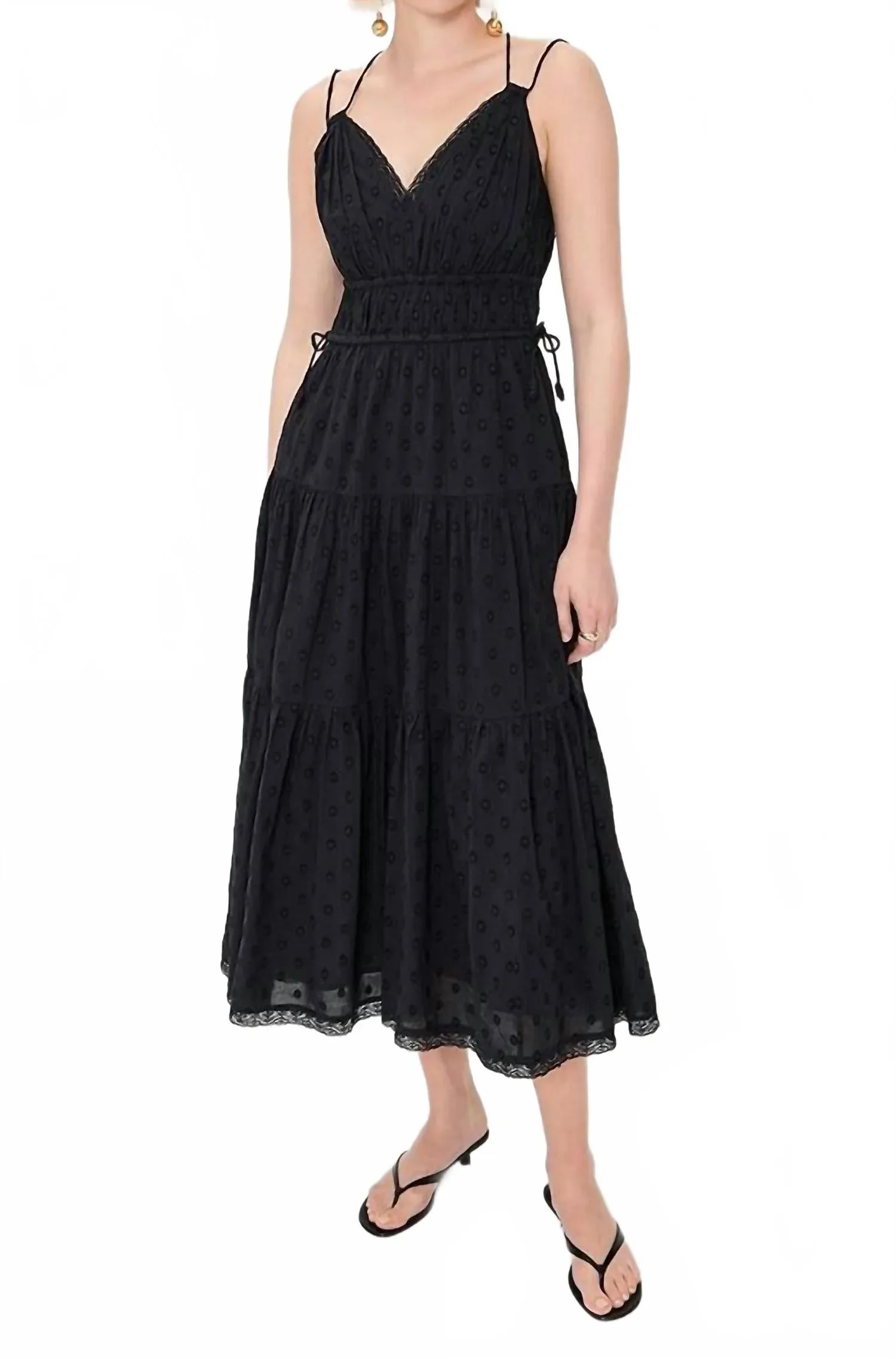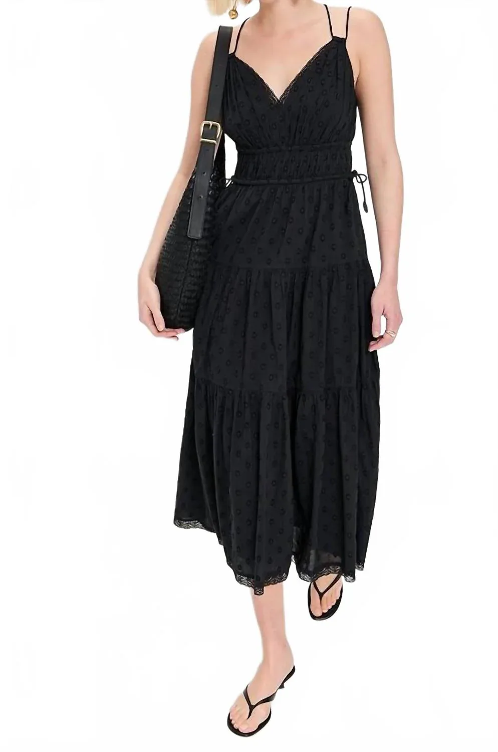 Платье идеальной длины действительно существует. Представляем платье Freya от Ulla Johnson - очаровательную летнюю модель в черном цвете, созданную для вневременного образа. Это платье миди с тонкими бретелями и V-образным вырезом, красивой многоярусной юбкой и кружевной отделкой. Изготовлено из 100% хлопка, это легкое, неэластичное тканое полотно, обеспечивающее максимальный комфорт. Модель без застежек имеет боковые карманы в швах и полностью на подкладке. Уход: стирка в холодной воде. Произведено в Индии. Длина изделия - 47,25 дюймов.