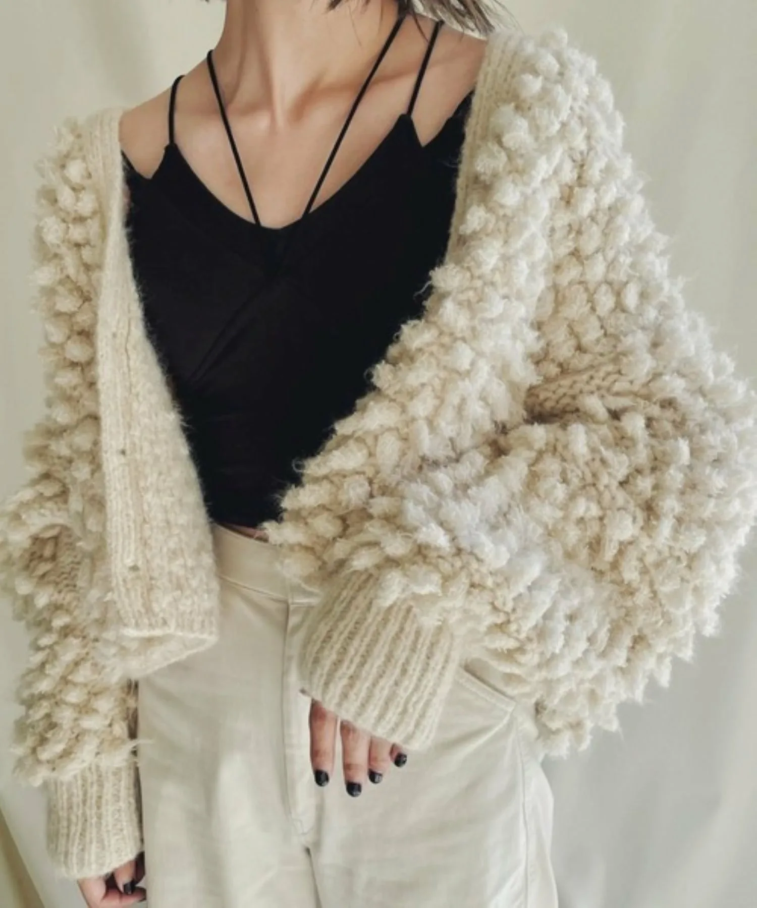 Болеро Pokopoko, выполненное из скрученной пряжи, демонстрирующее текстуру петлевого вязания.