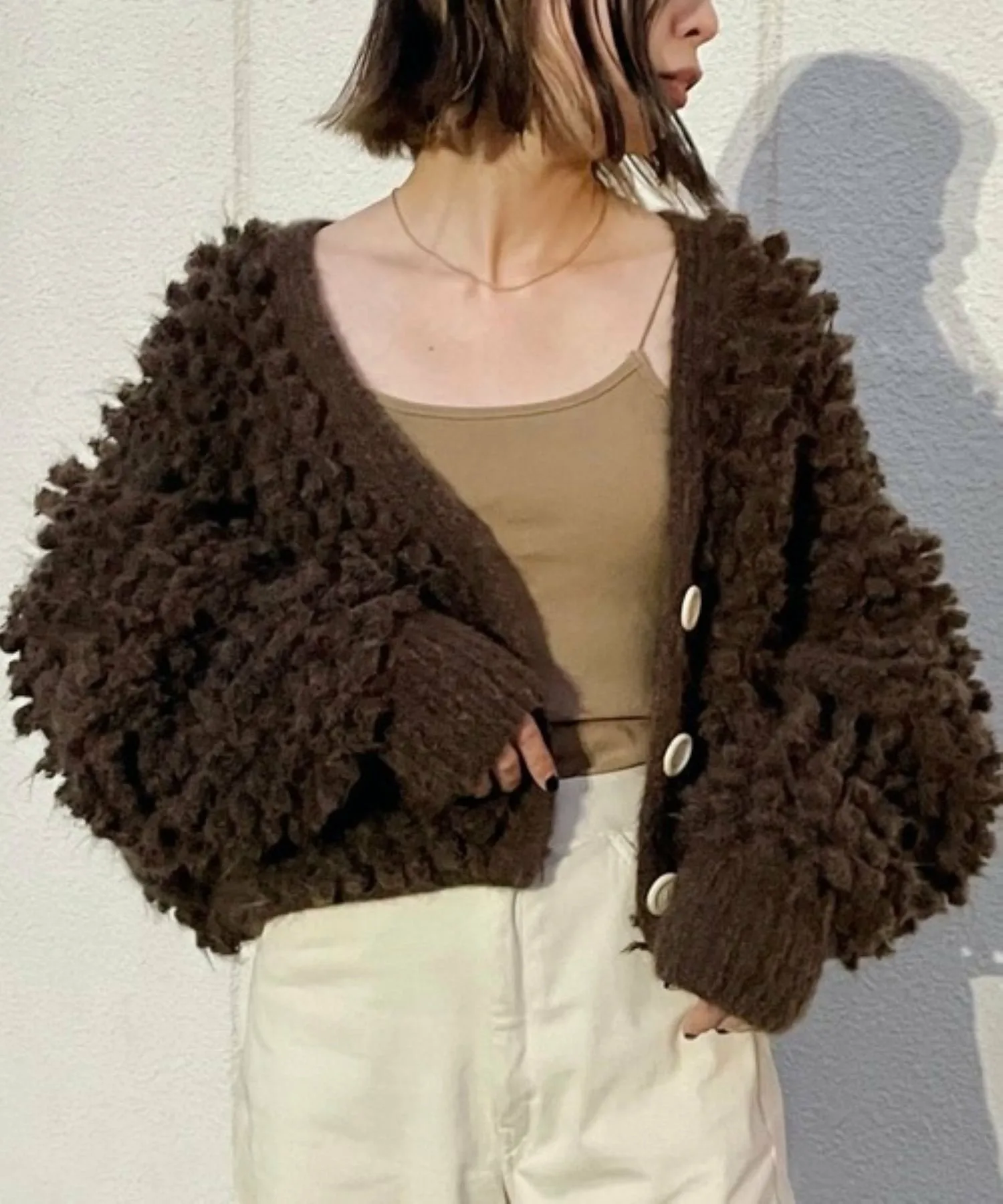 Болеро Pokopoko, выполненное из скрученной пряжи, демонстрирующее текстуру петлевого вязания.