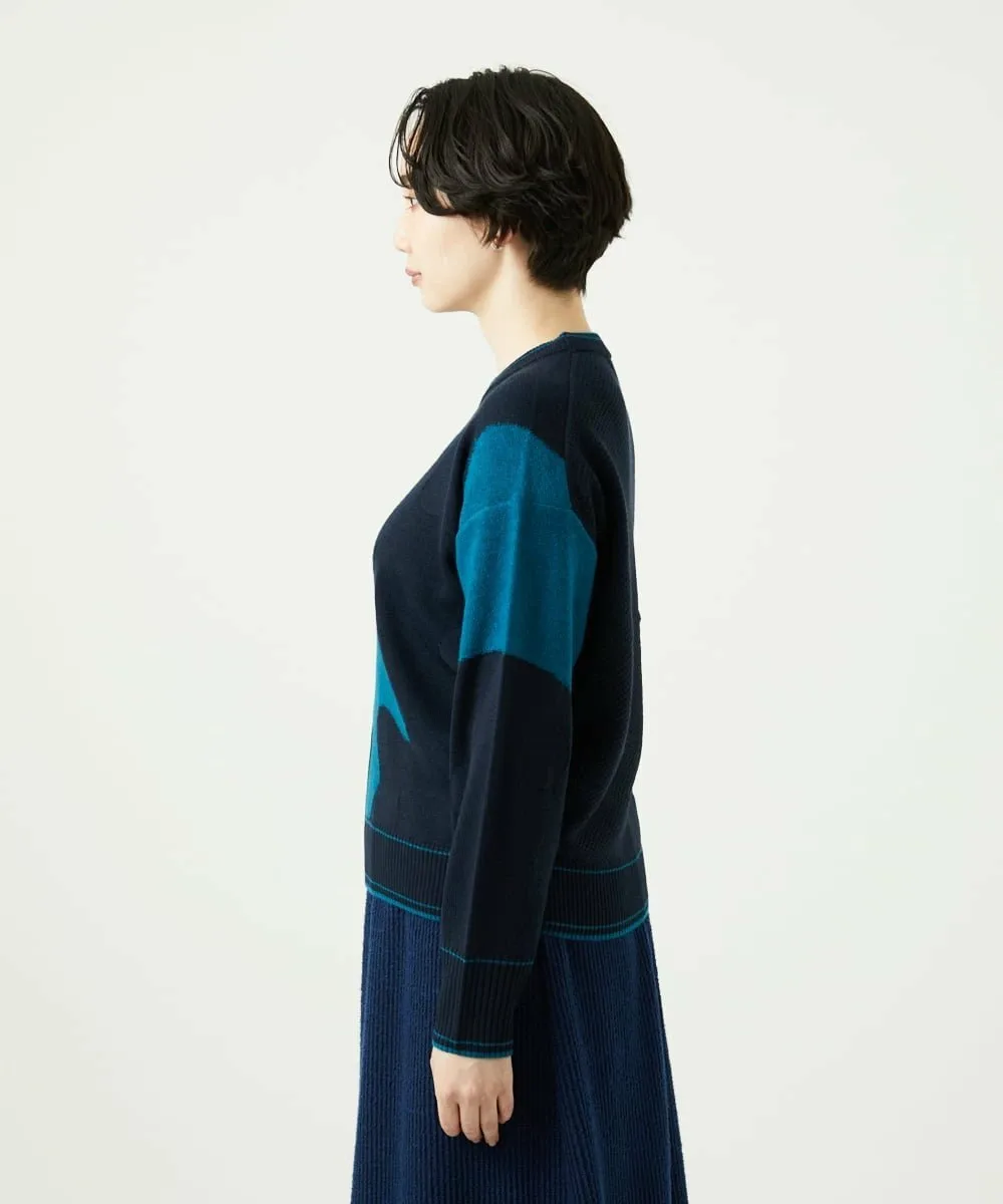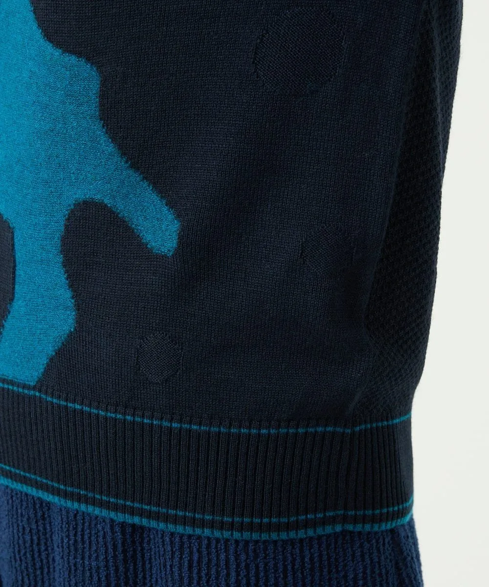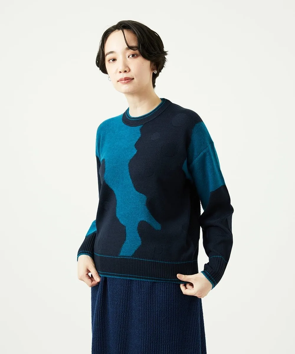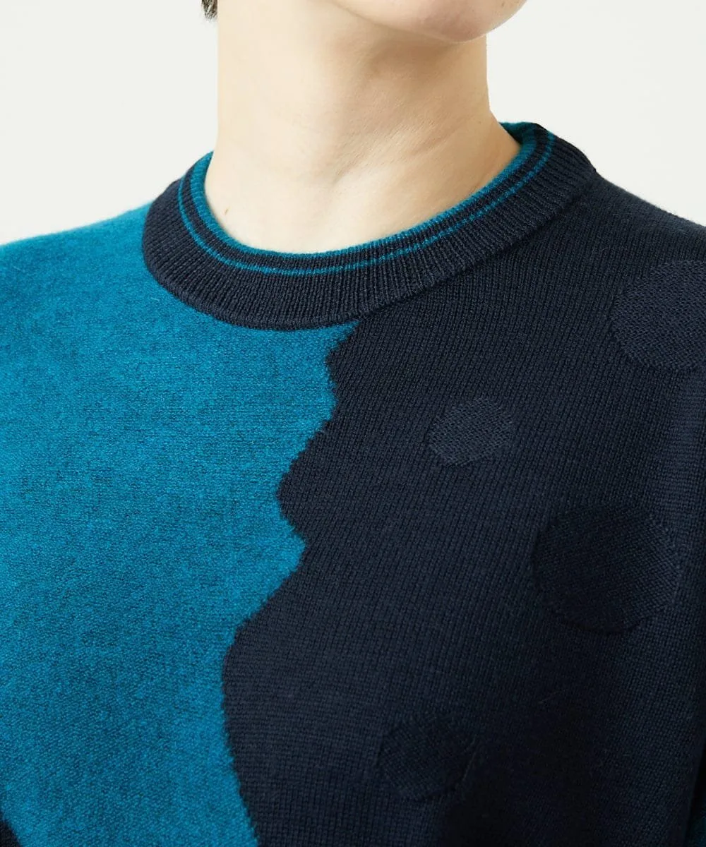 Мотив Итальянского полуострова выполнен в технике интарсии из фактурной пряжи из смеси альпаки. Основа выполнена из камвольной пряжи, дополненной жаккардовым узором в горошек. Силуэт не слишком большой, что делает этот высококачественный трикотаж подходящим для повседневной носки.