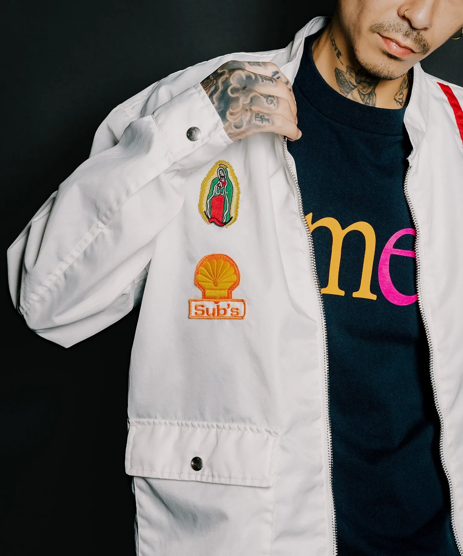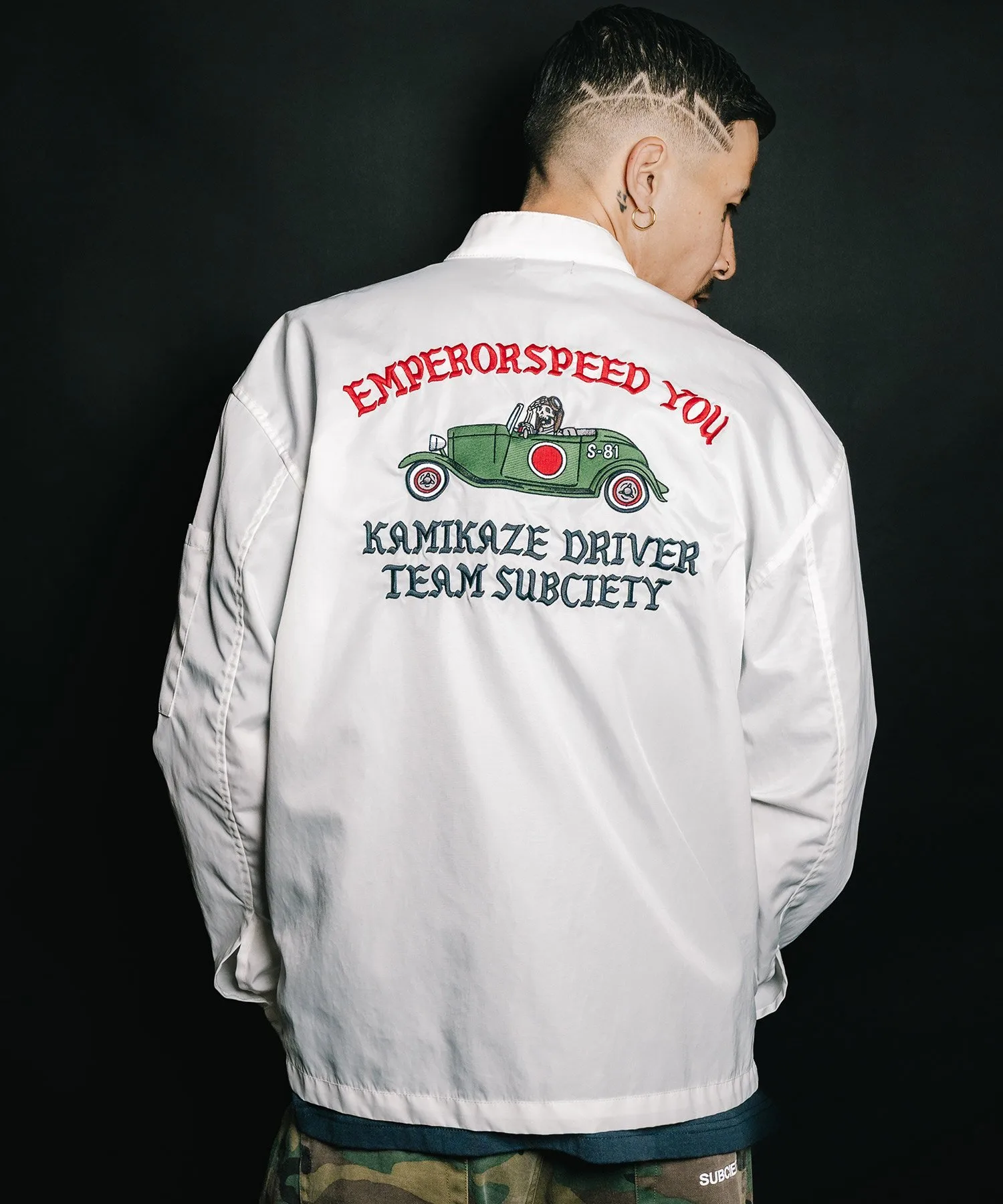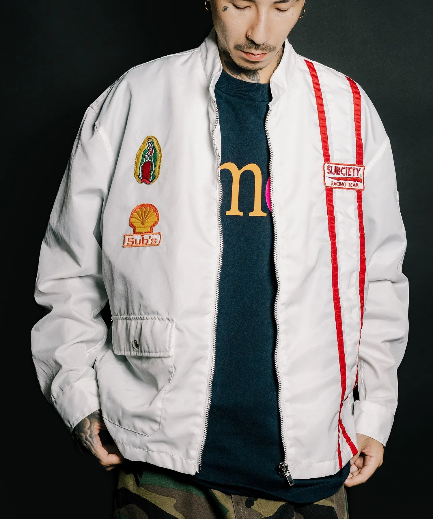 На передней части расположены различные нашивки, а на спине — большая вышитая графика, вдохновленная командой Hot Rod.