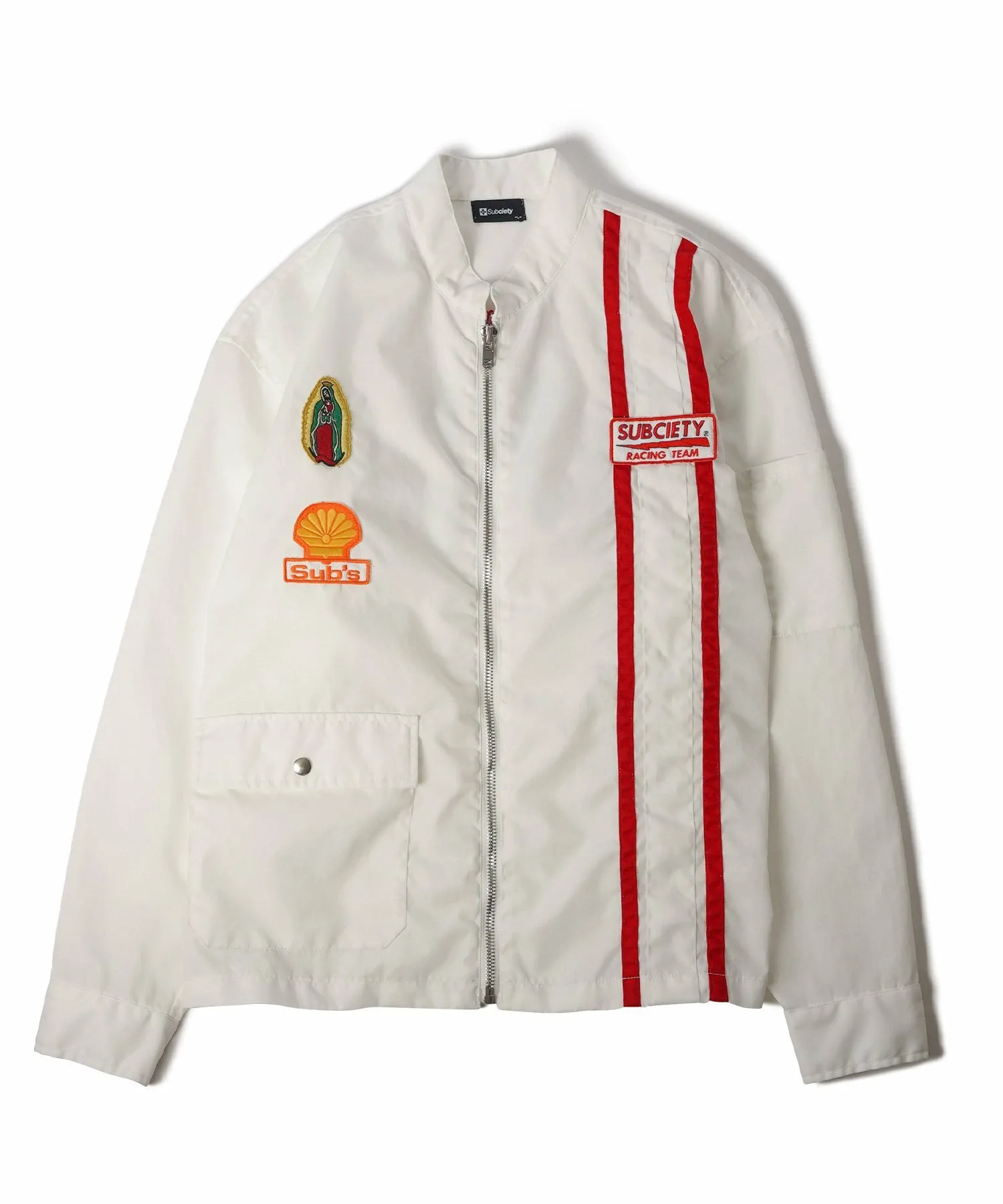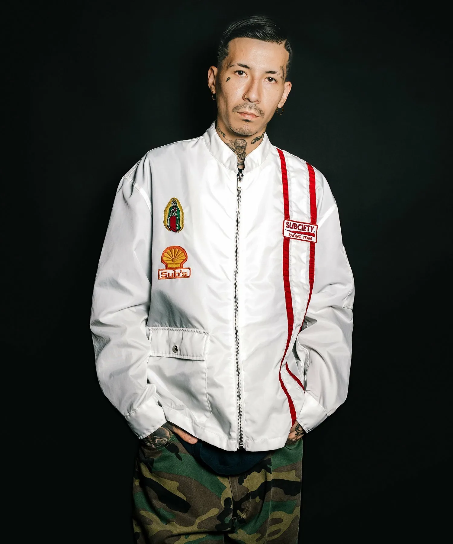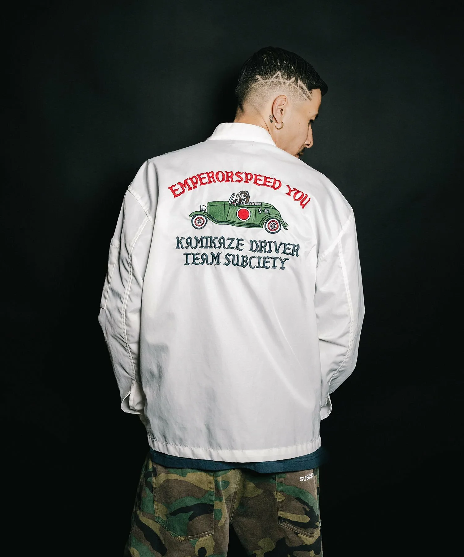 На передней части расположены различные нашивки, а на спине — большая вышитая графика, вдохновленная командой Hot Rod.