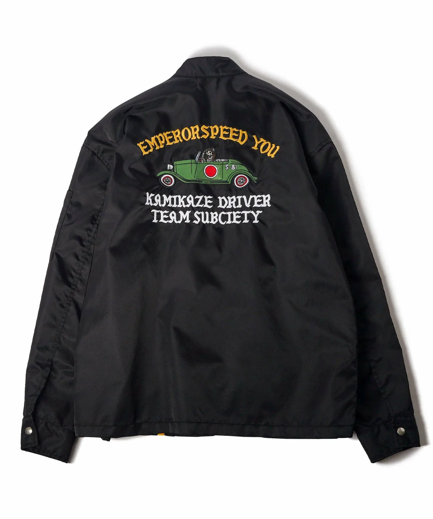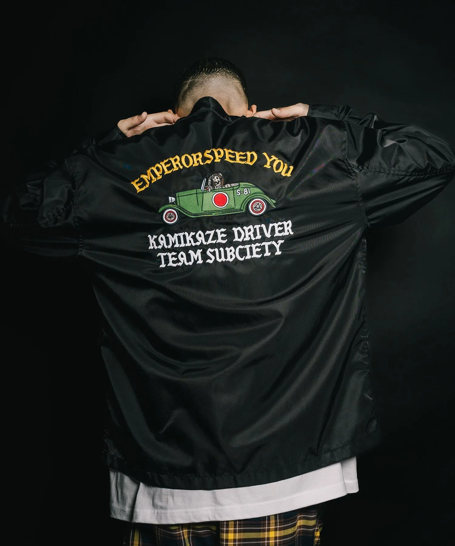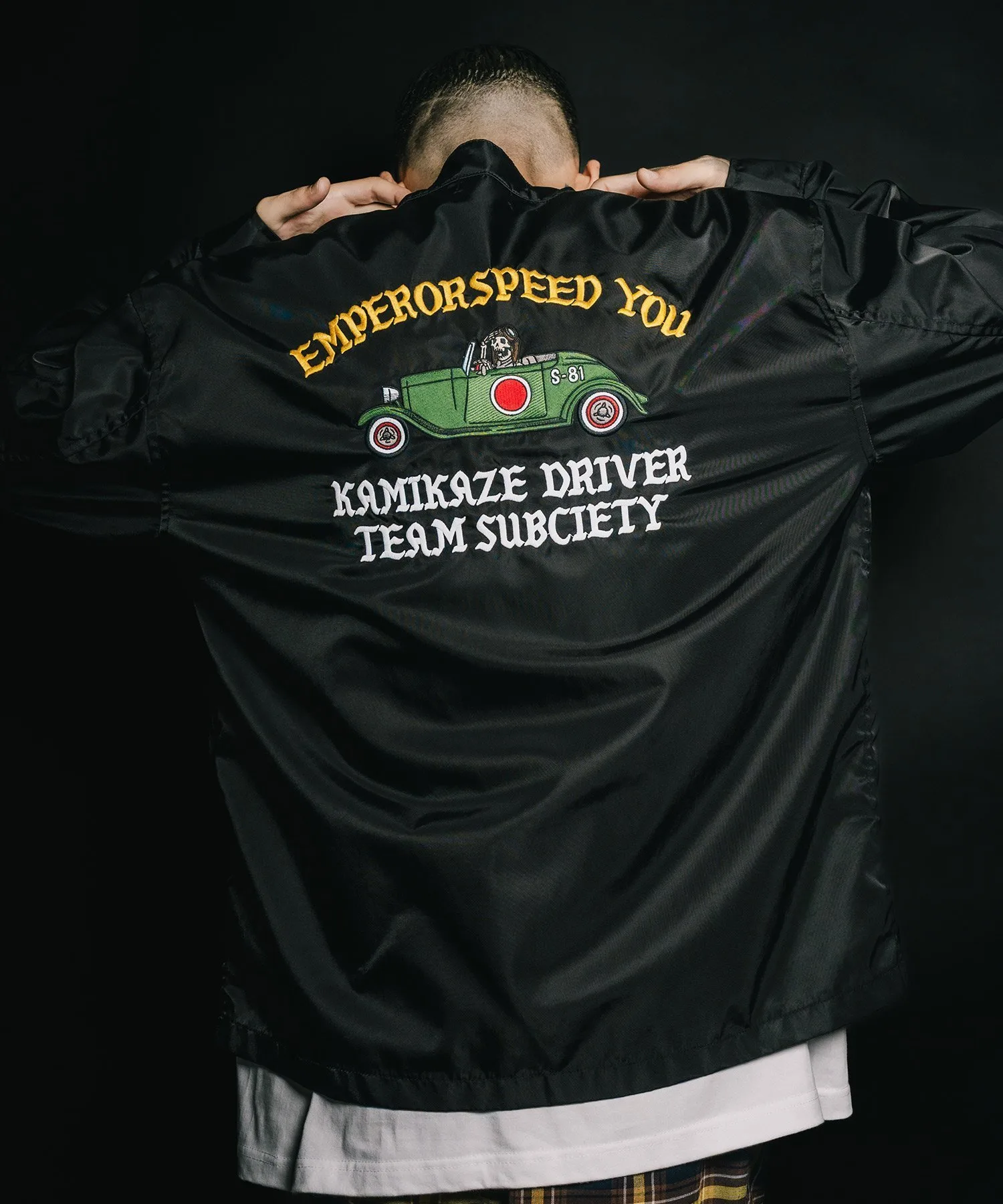 На передней части расположены различные нашивки, а на спине — большая вышитая графика, вдохновленная командой Hot Rod.