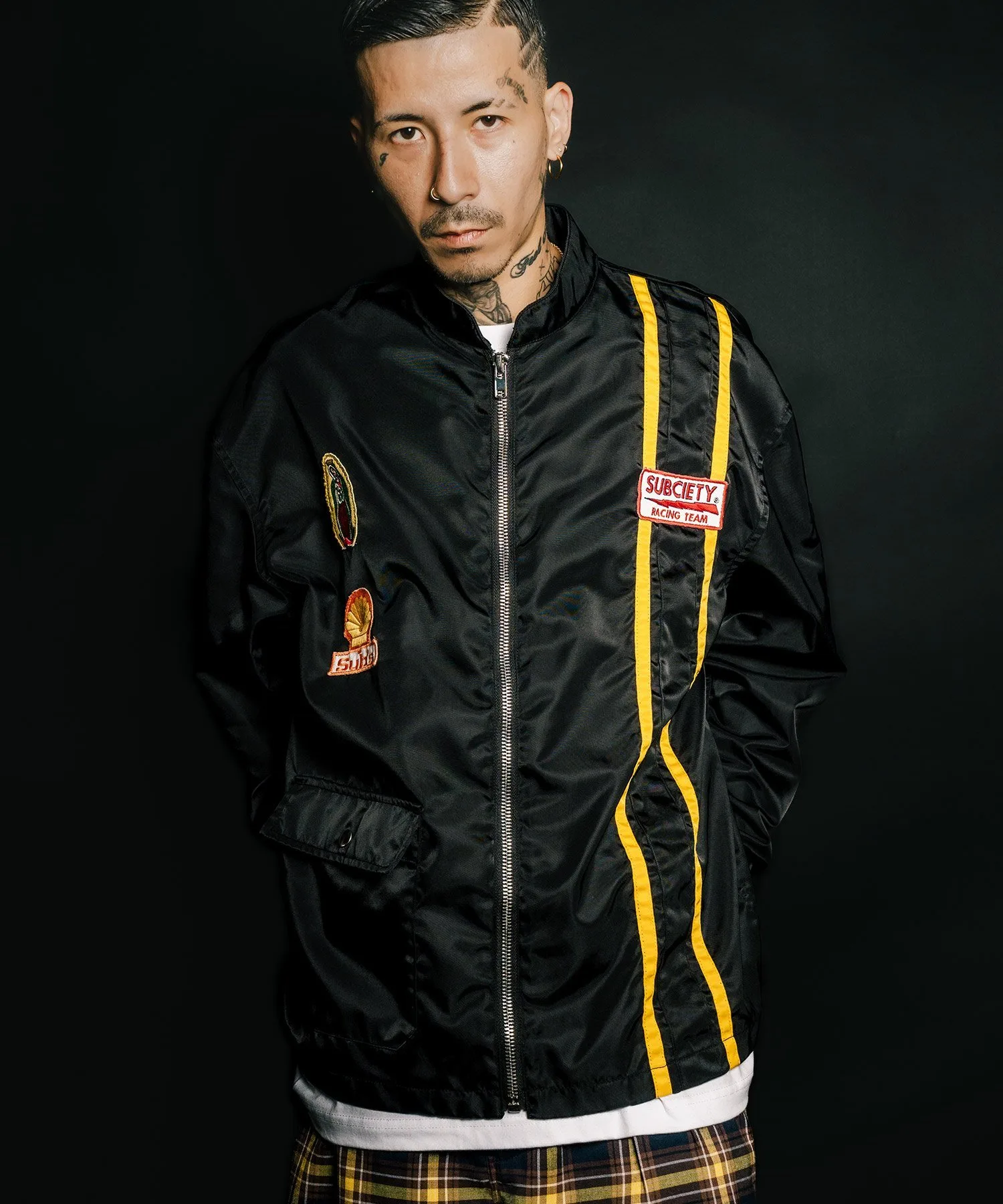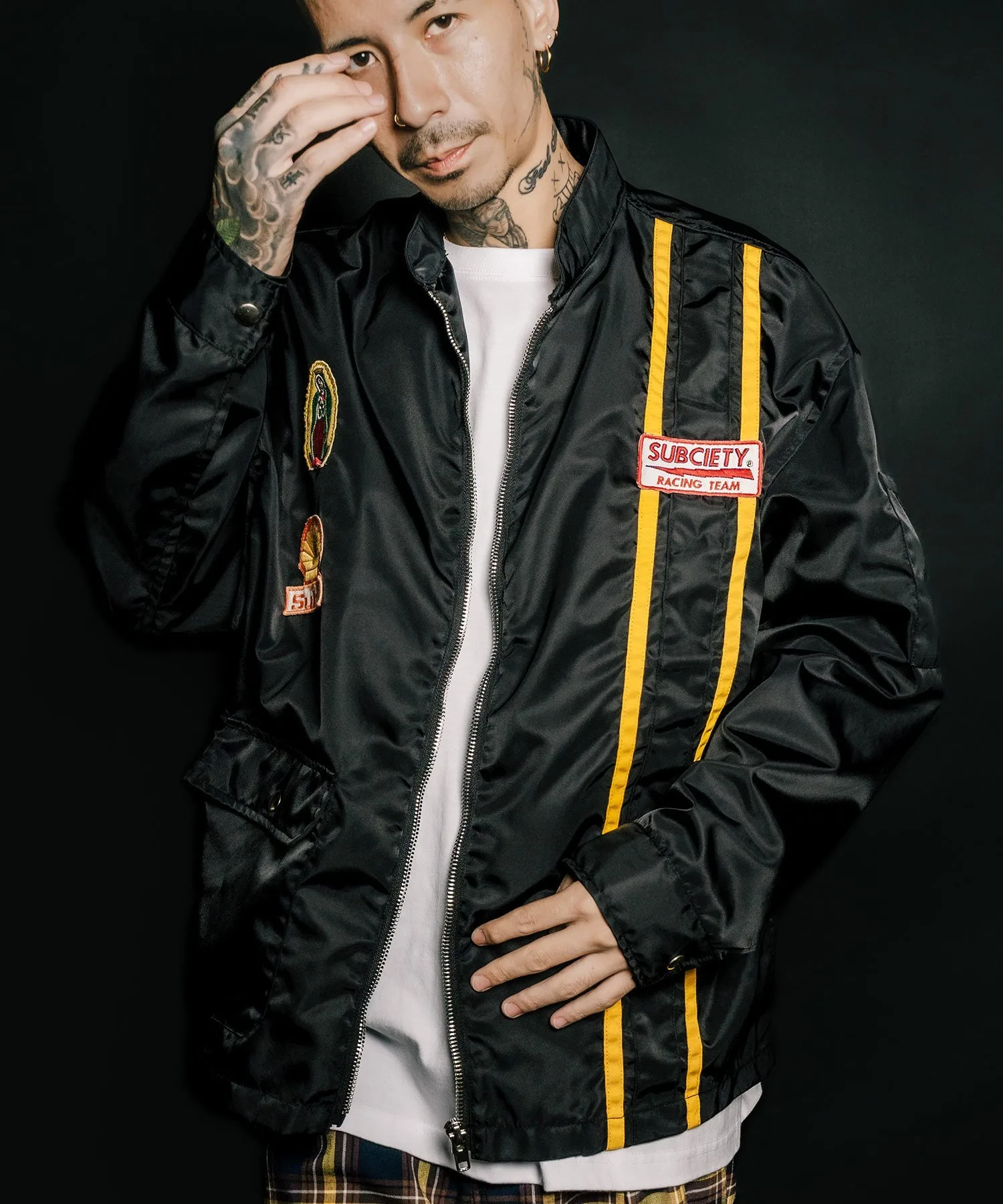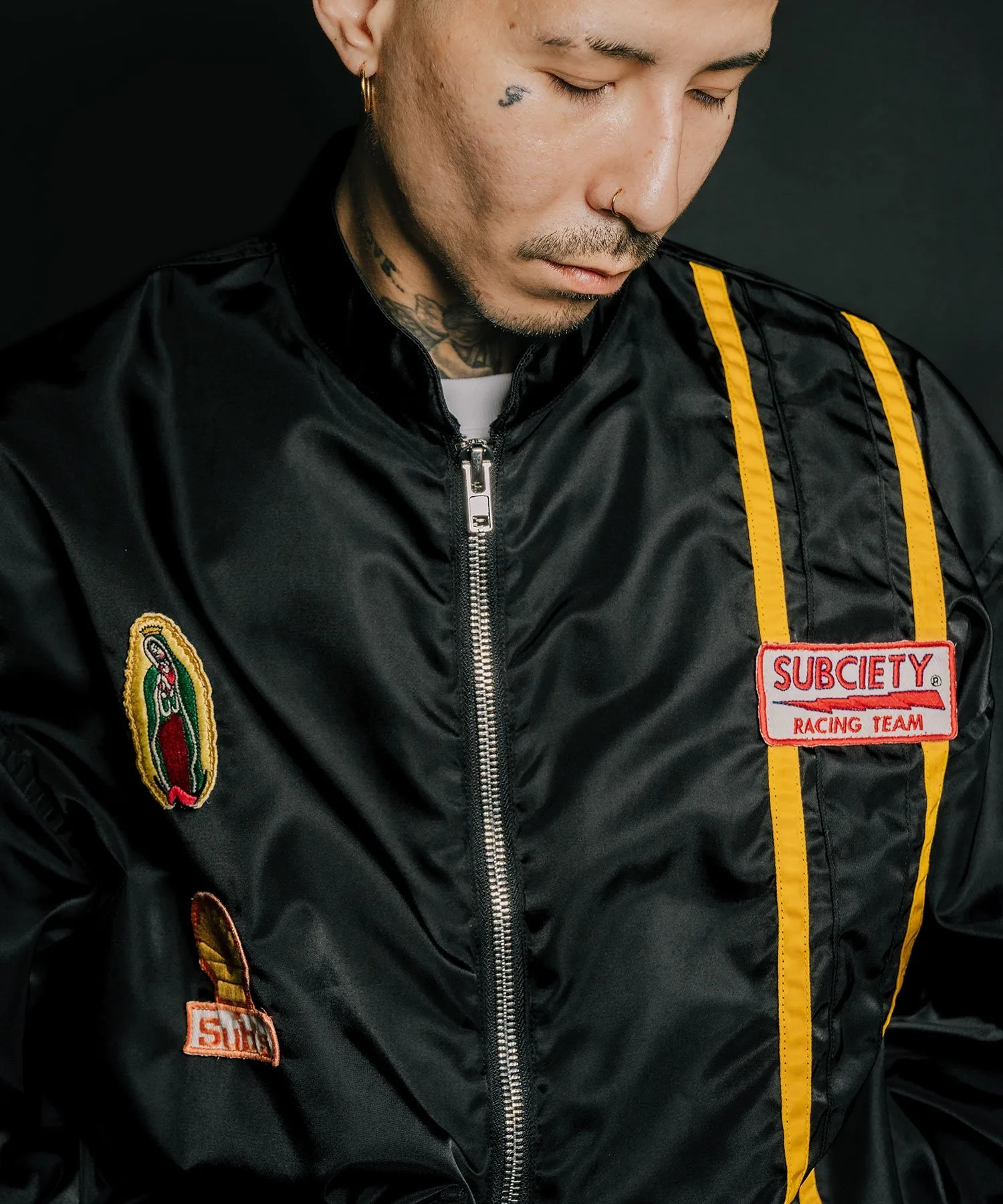 На передней части расположены различные нашивки, а на спине — большая вышитая графика, вдохновленная командой Hot Rod.
