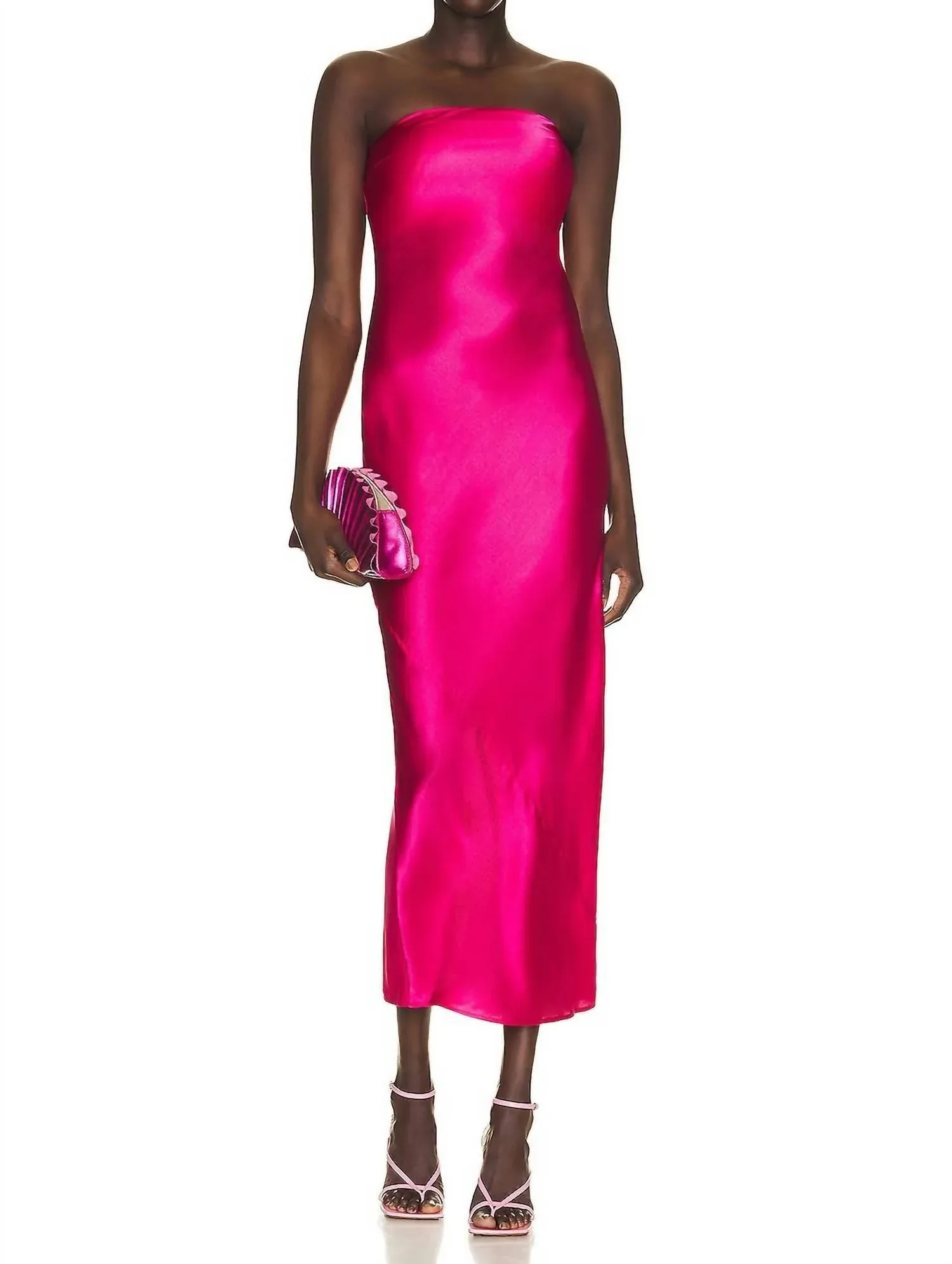 Платье без бретелей настолько универсально, что его можно носить как с туфлями на каблуках или танкетке, так и с балетками, создавая более повседневный образ. Представляем потрясающее платье Perla от Cult Gaia - идеальное сочетание элегантности и современности в ярком оттенке «Драконий фрукт». Это платье без бретелей из шелковой смеси имеет изящный квадратный вырез и лестный силуэт платья-футляра длиной до пола с зауженными боками. Изготовлено в Китае из высококачественной ткани, состоящей на 92% из шелка и на 8% из спандекса. Платье также имеет частично подкладку из полиэстеровой сетки для дополнительного комфорта и скрытую резиновую ленту в области груди для надежной фиксации. Застежка - потайная боковая молния. Уход - ручная стирка.